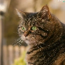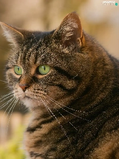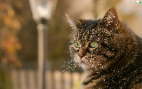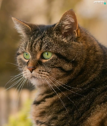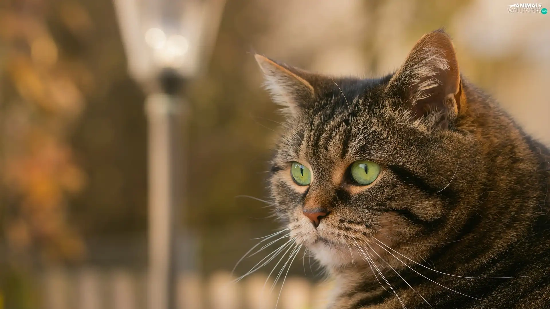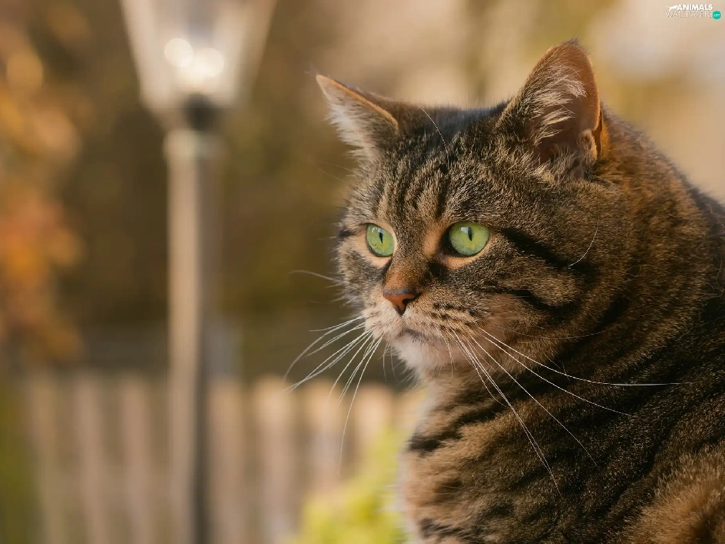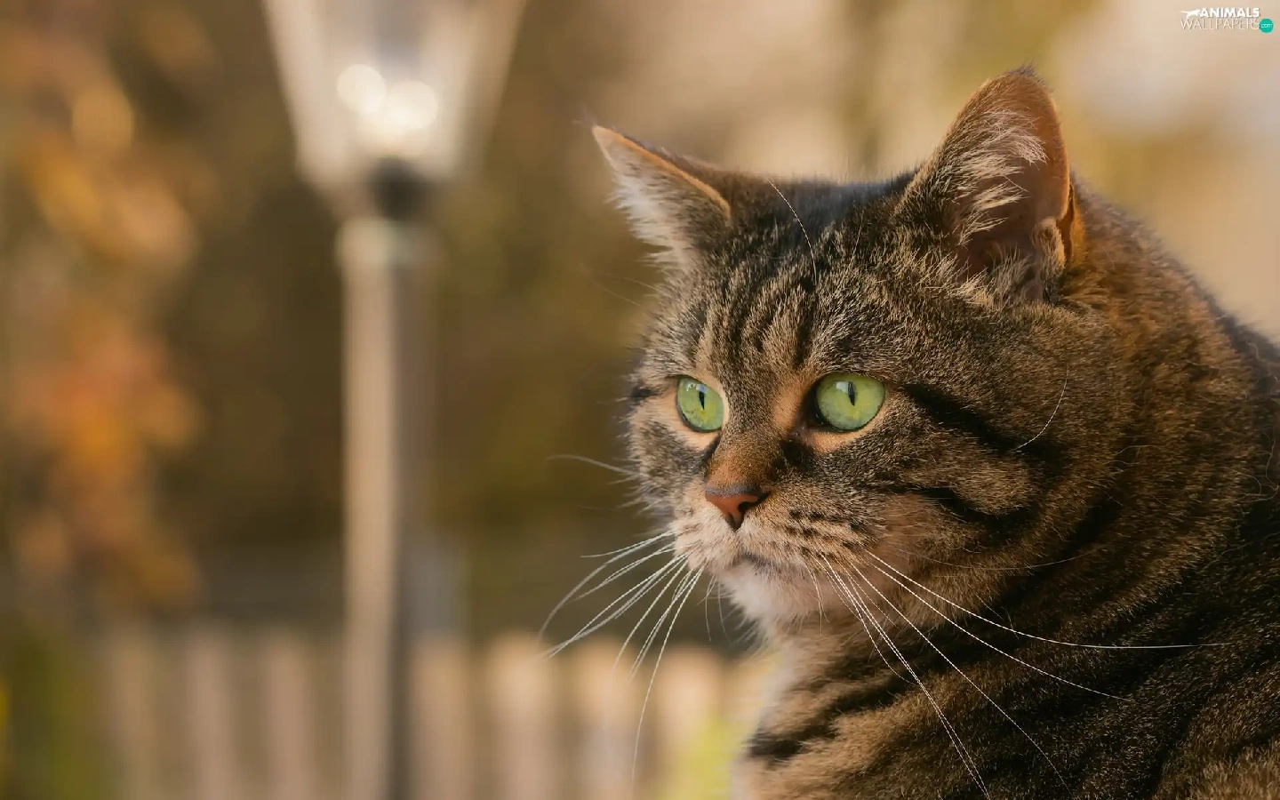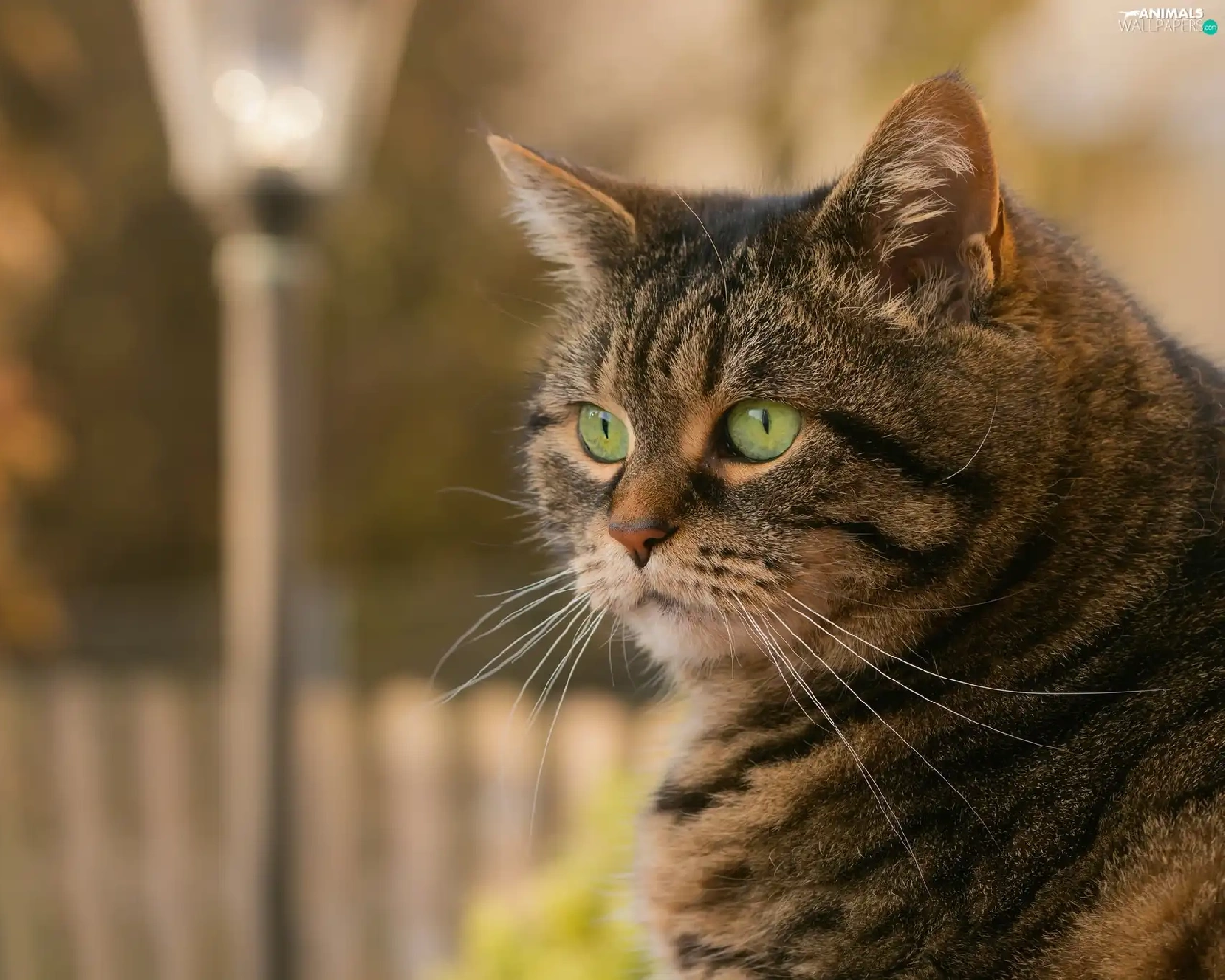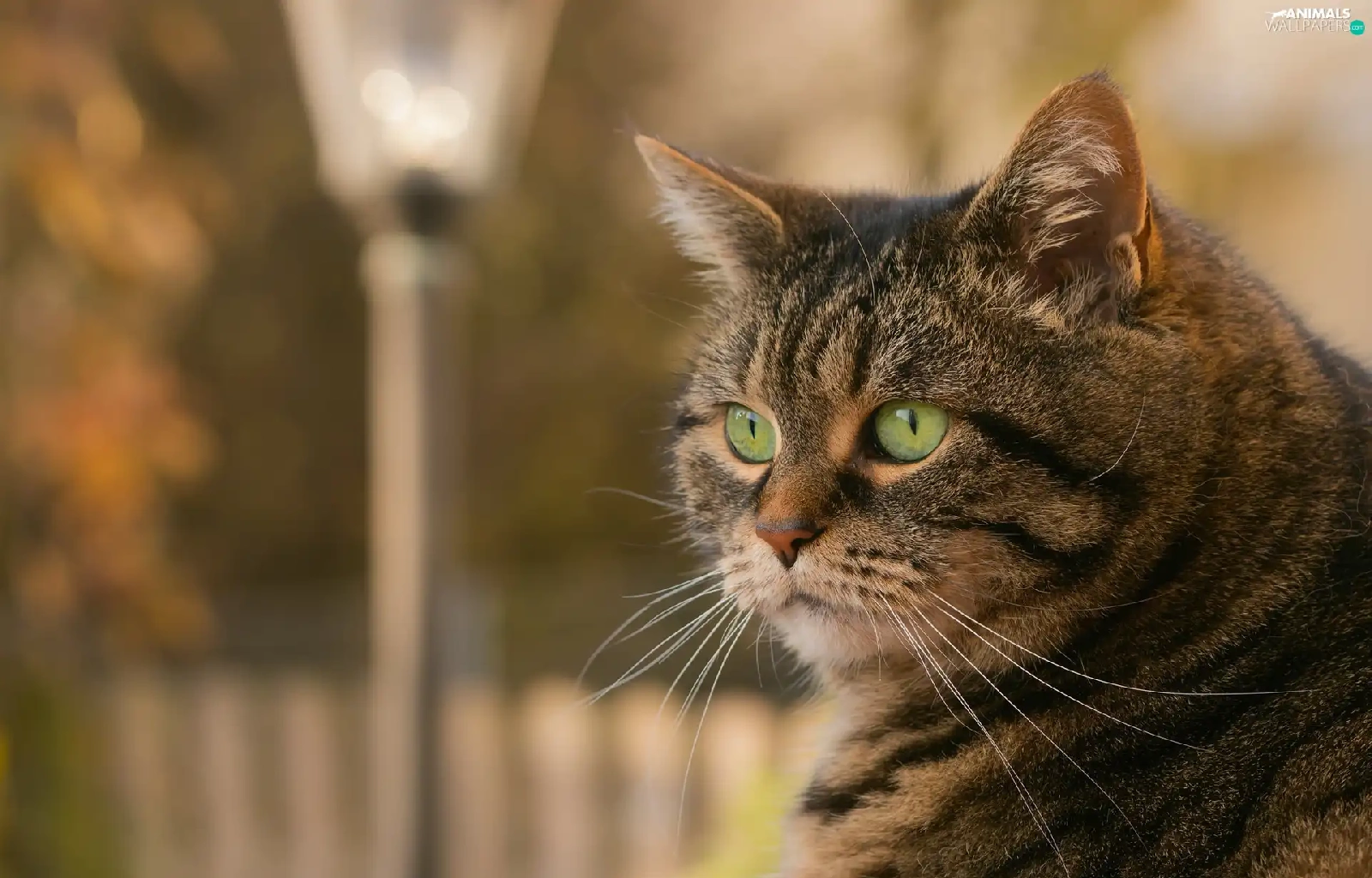 dun, Gray, cat, green ones, trees, blur, portrait, Fance, Eyes
