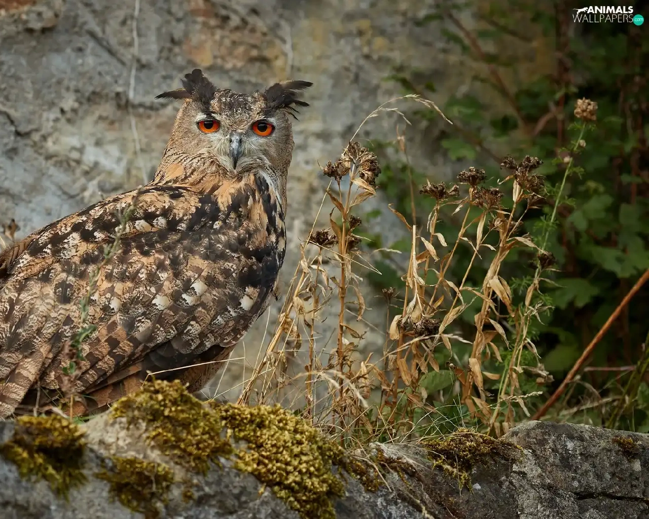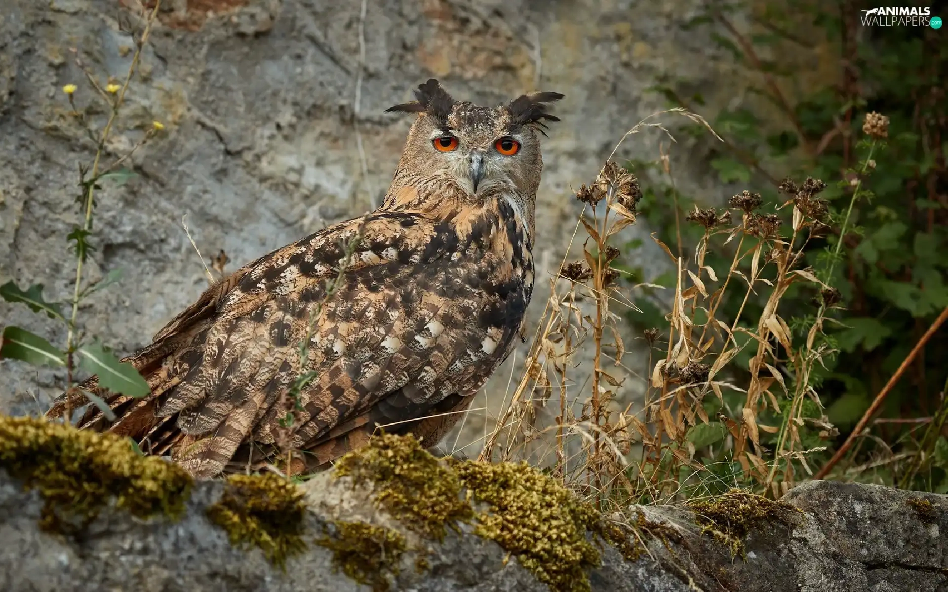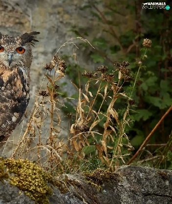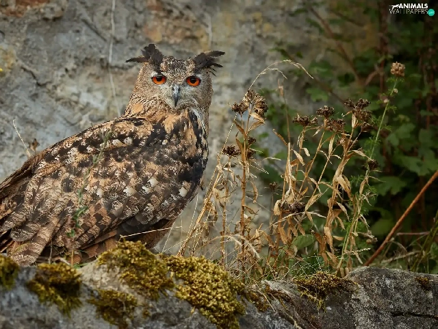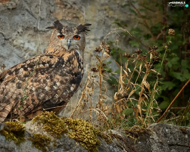 Moss, Plants, Eurasian Eagle-Owl, Rocks, owl