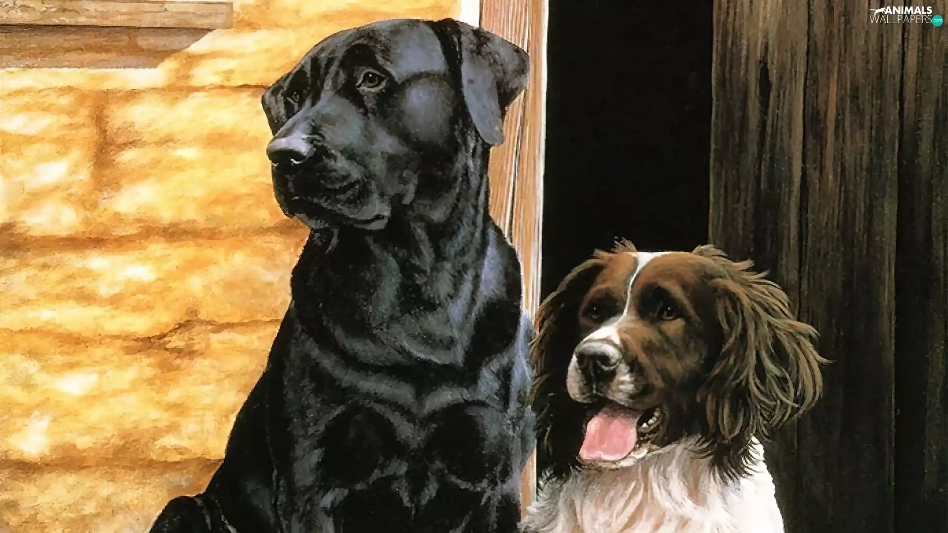 English Cocker Spaniel, Labrador Retriever, puppies, cote, Two cars