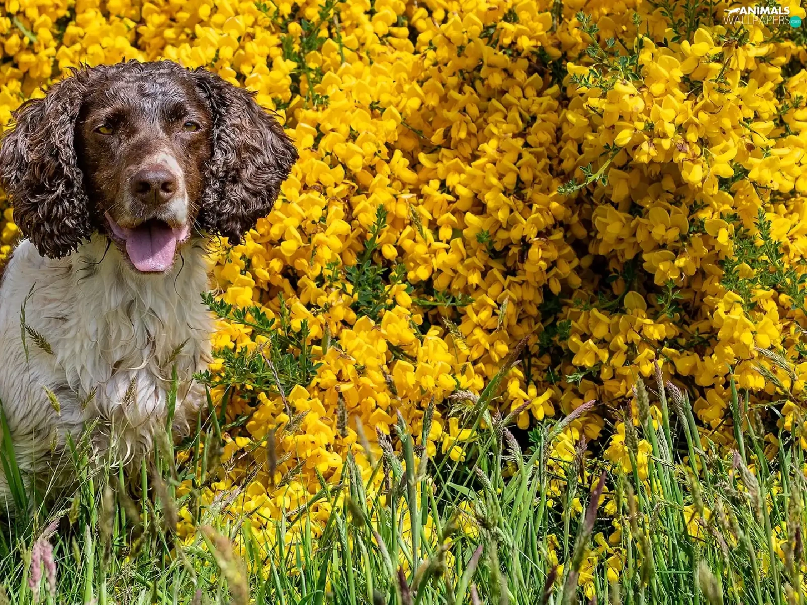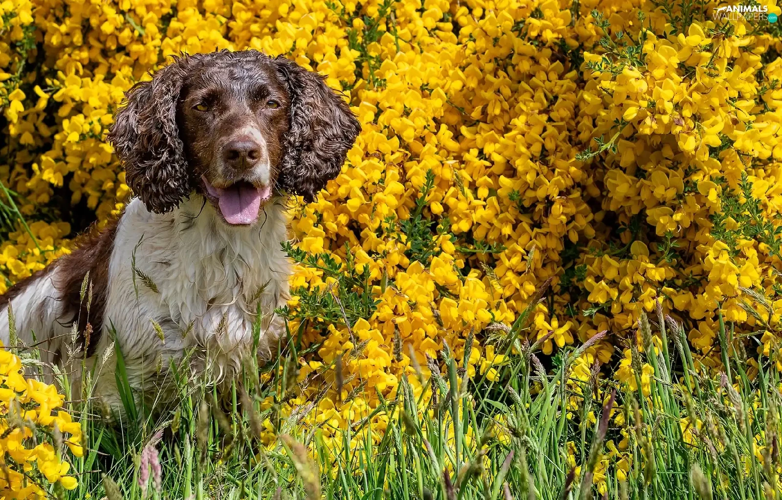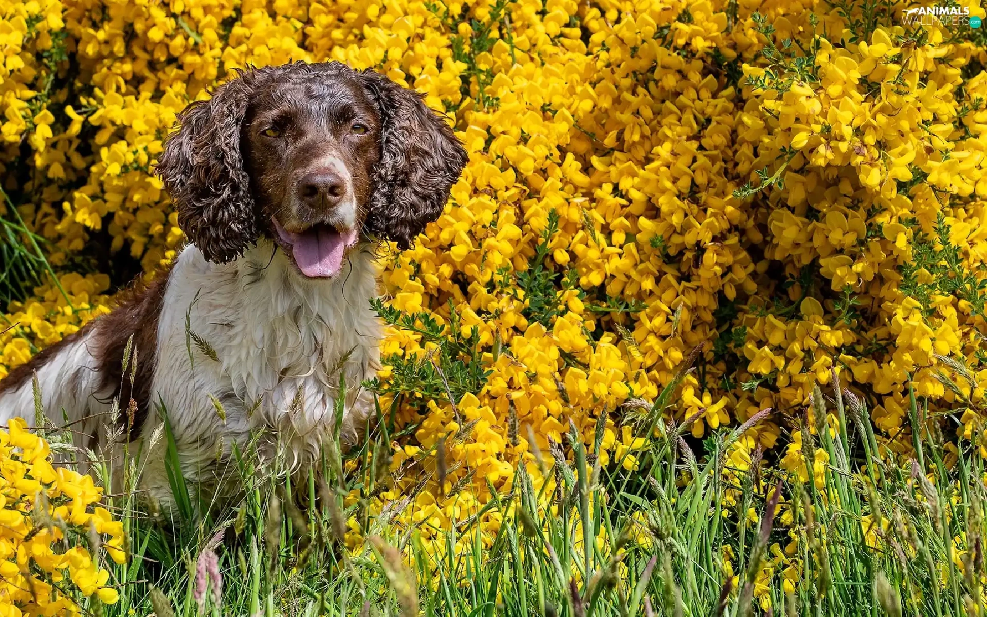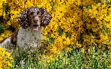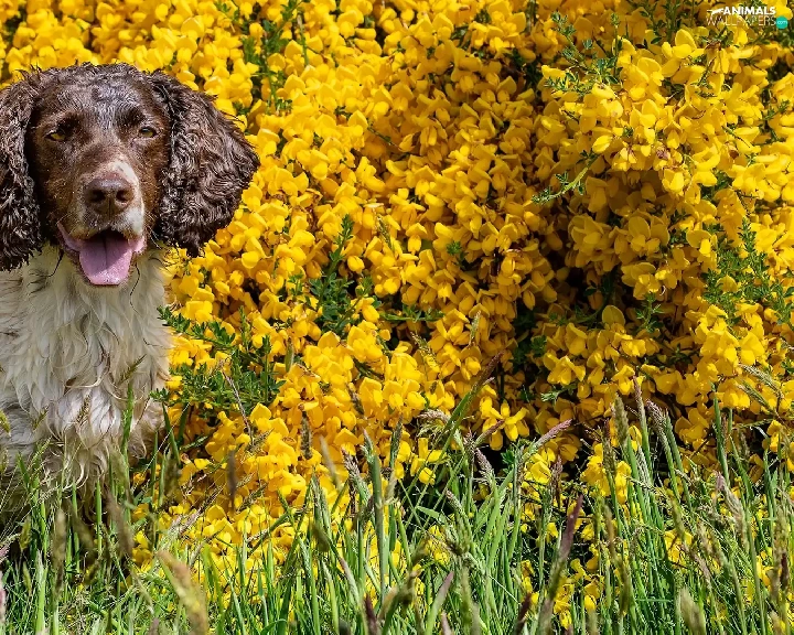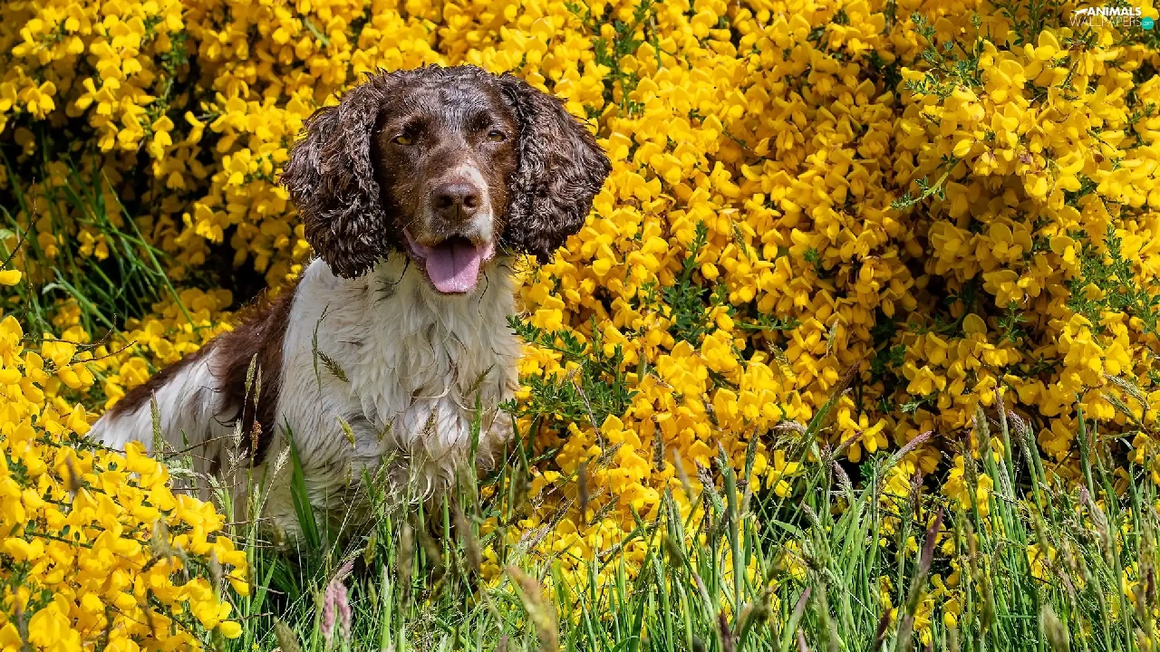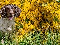 dog, Yellow, Flowers, English Springer Spaniel