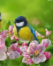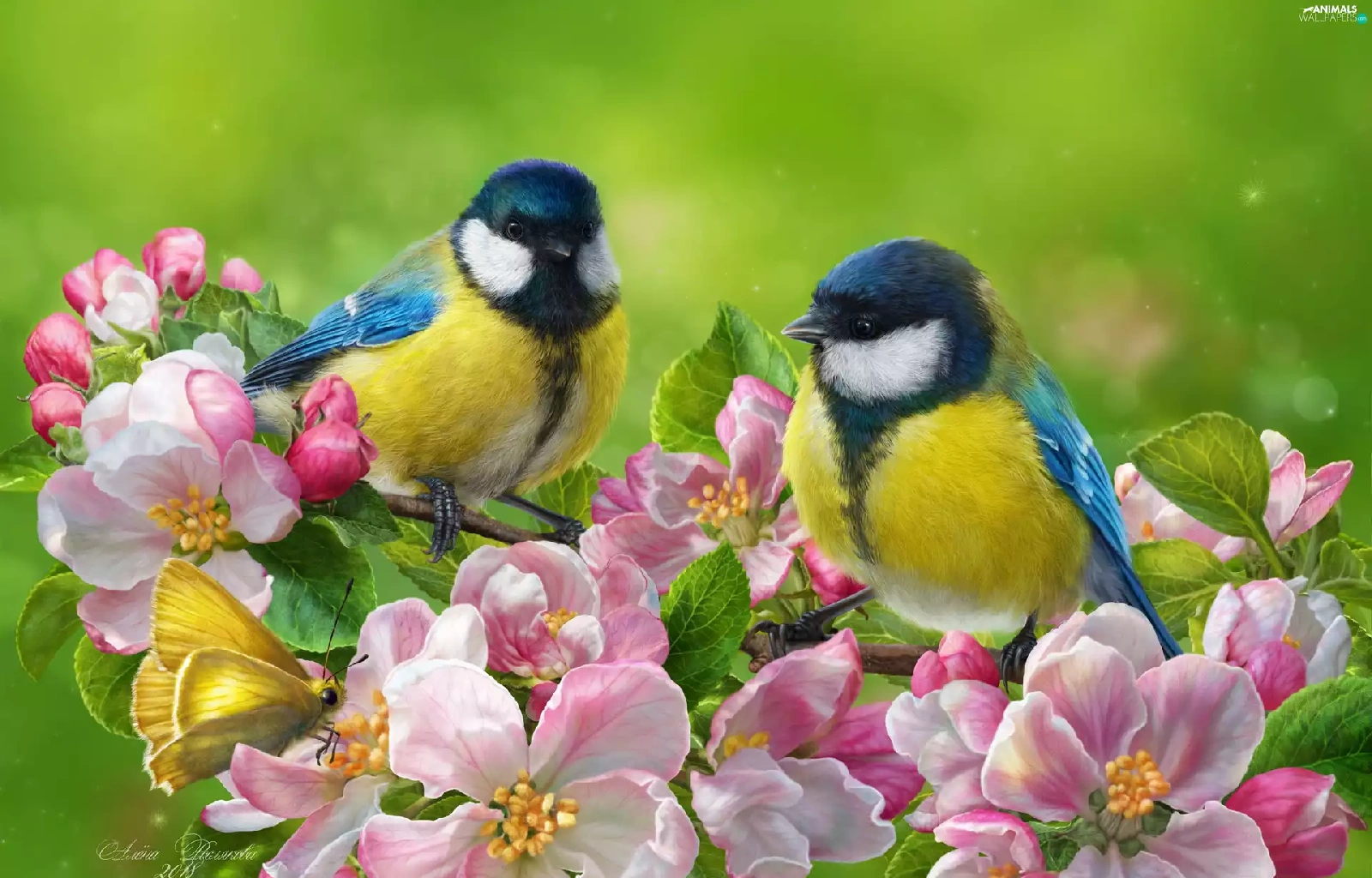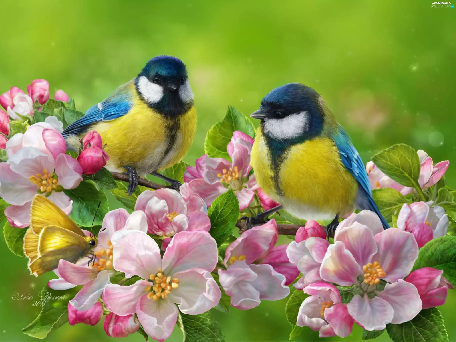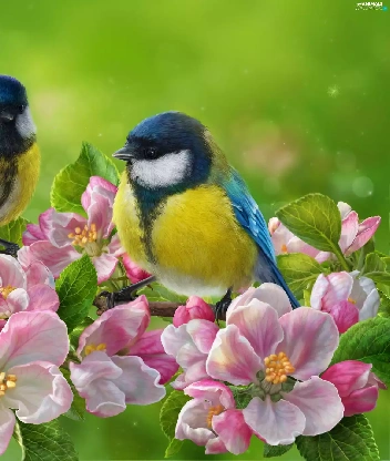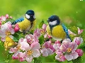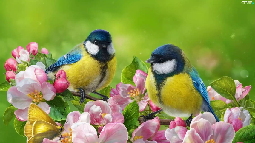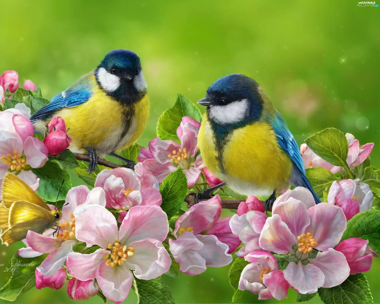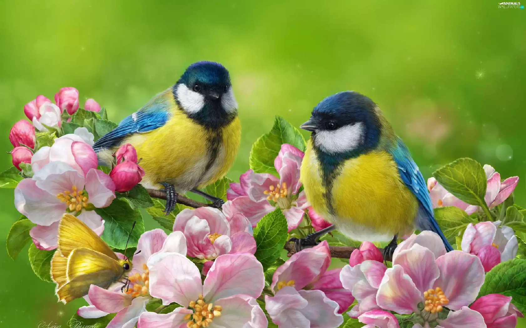 branch pics, flourishing, butterfly, trees, Flowers, Eurasian Blue Tit, birds, viewes