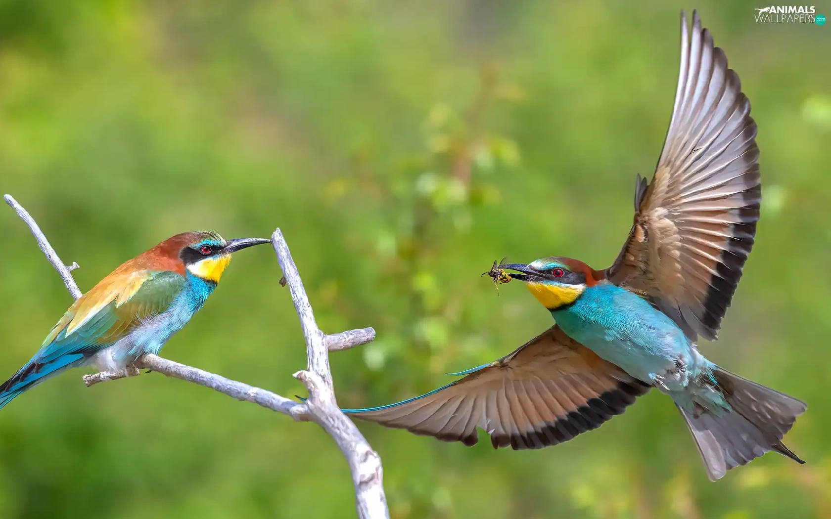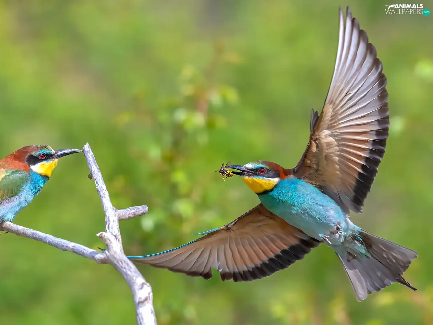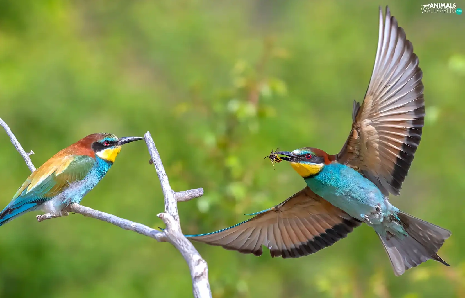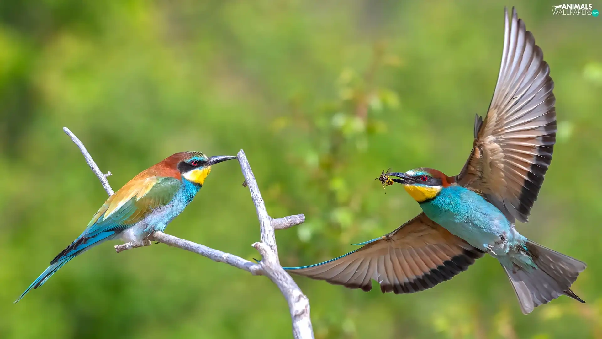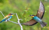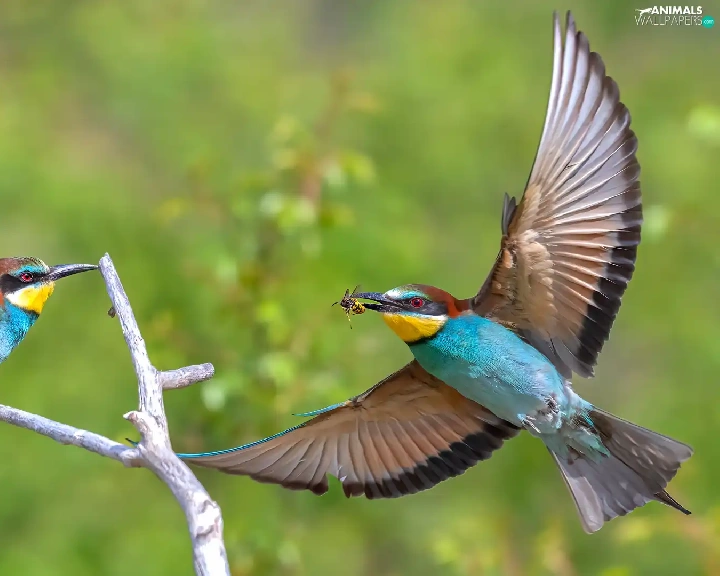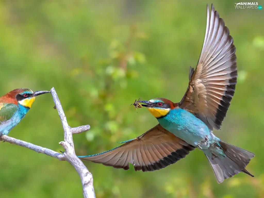 European bee-eater, Two cars, wings, Twigs, spread, birds