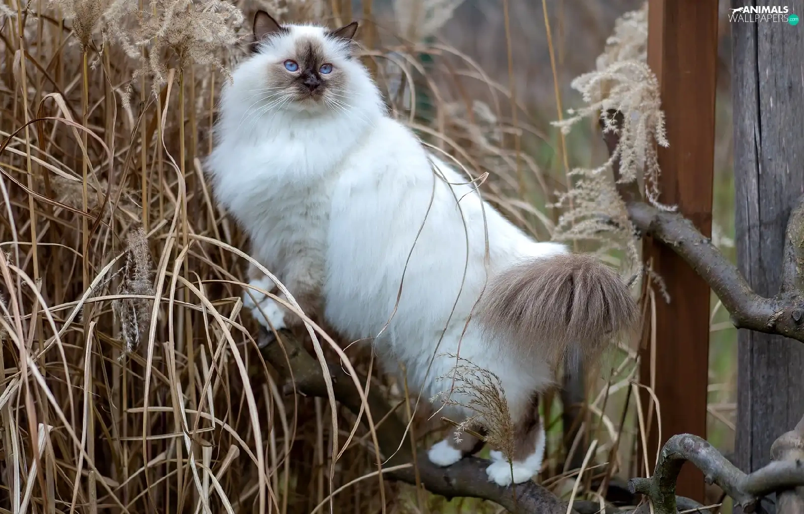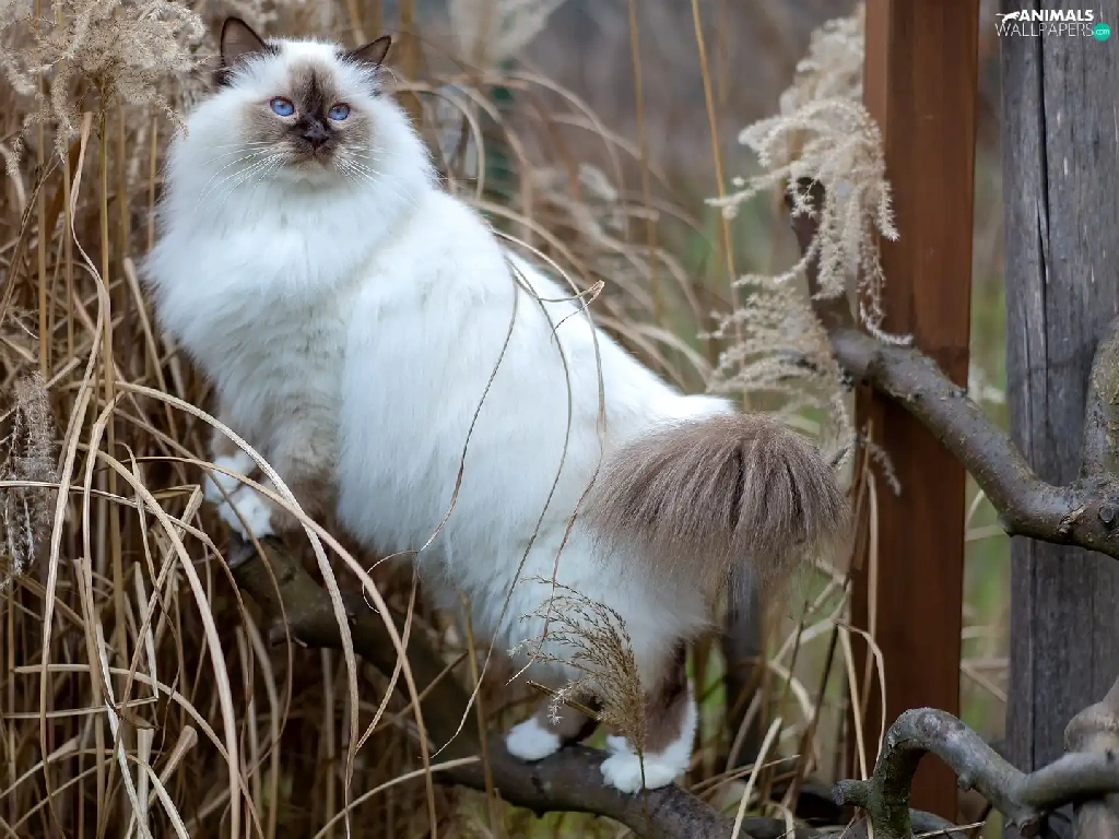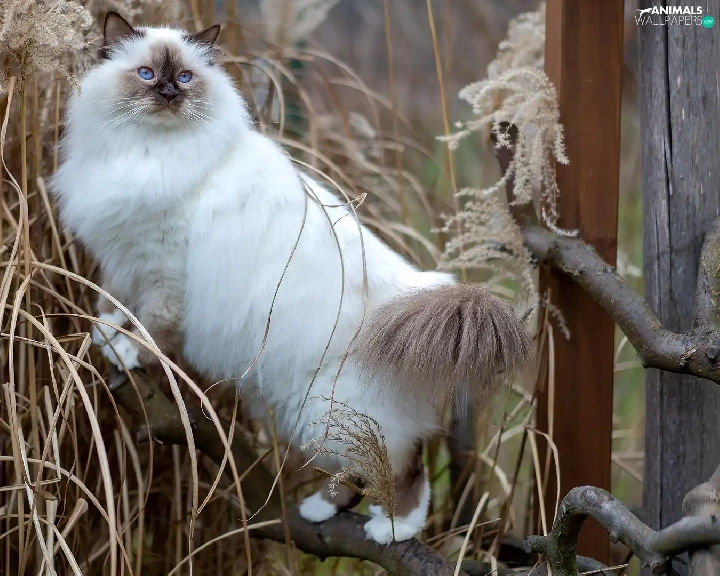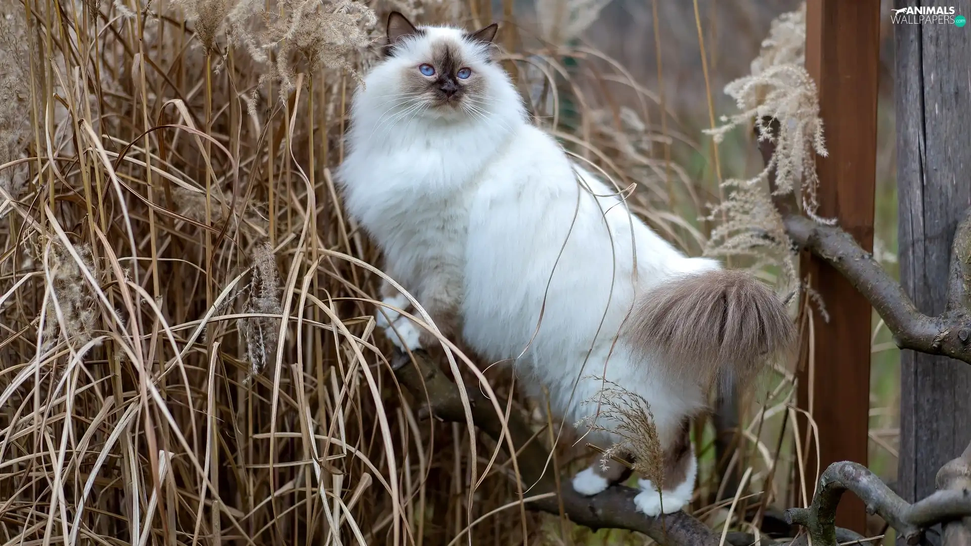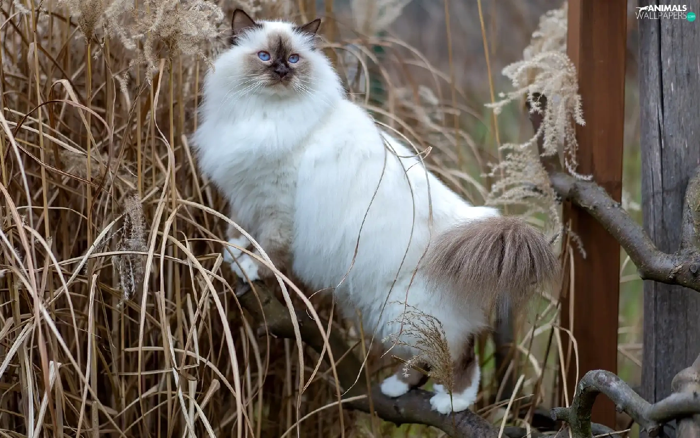 dry, grass, Blue Eyed, trees, Burmese Cat