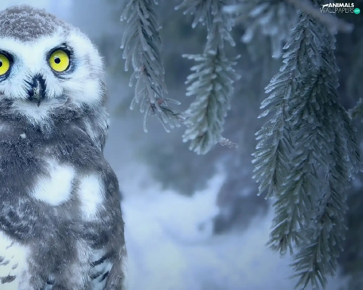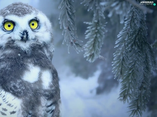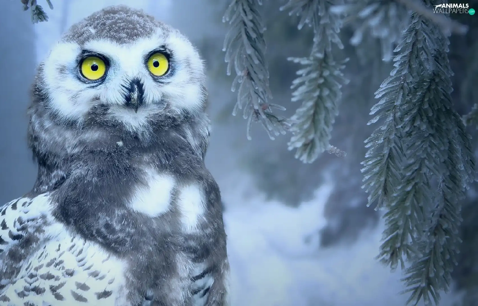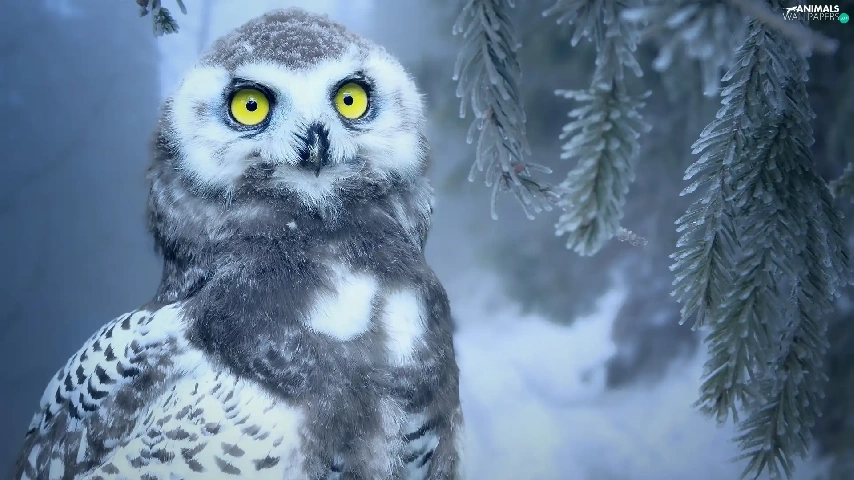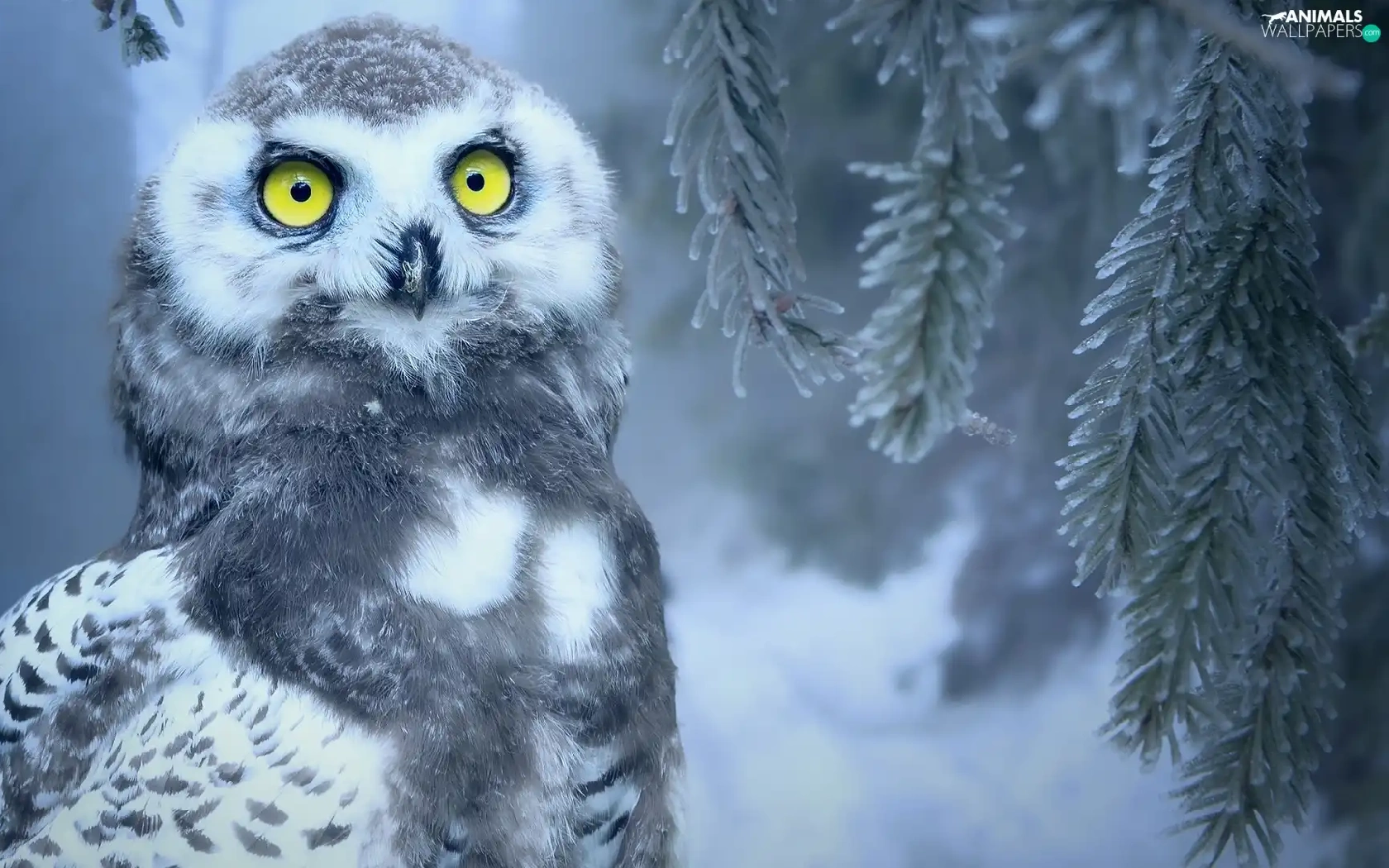 Snowy Owl, Bird, Eyes, twig, Yellow, young