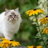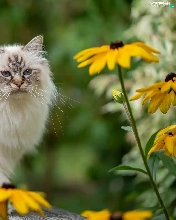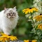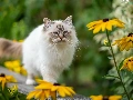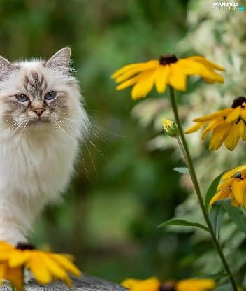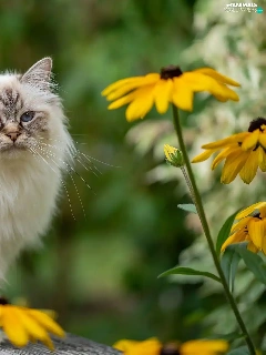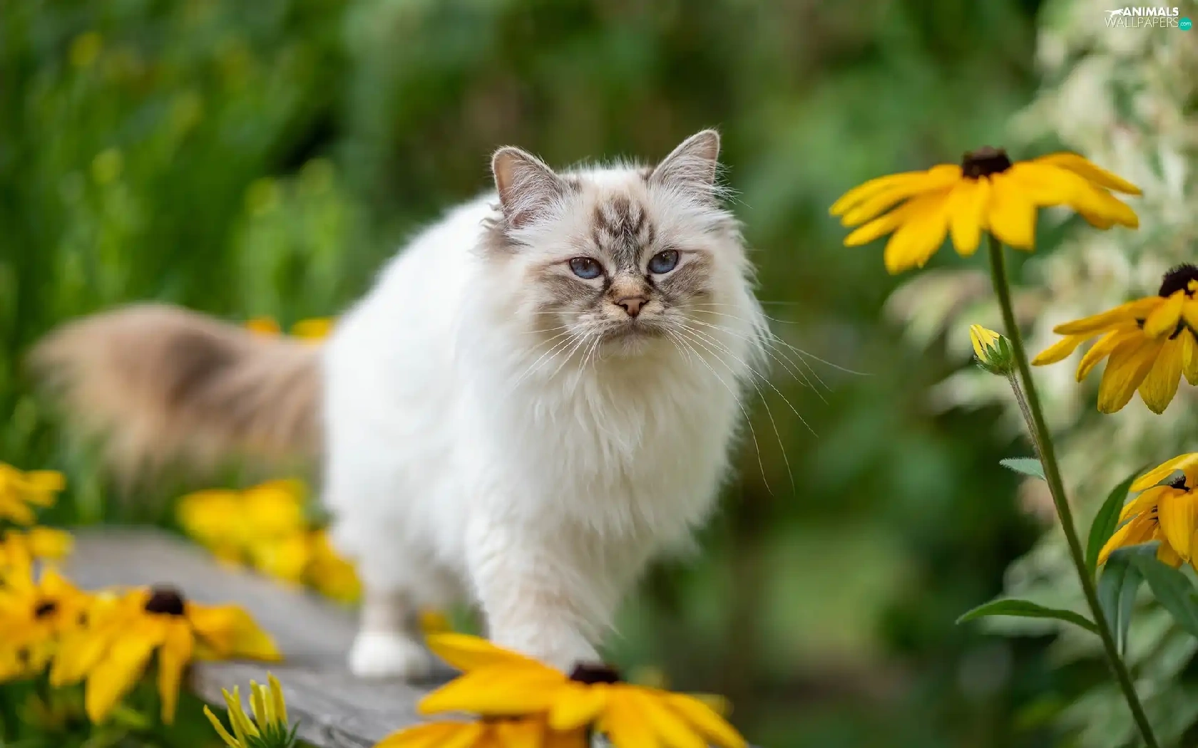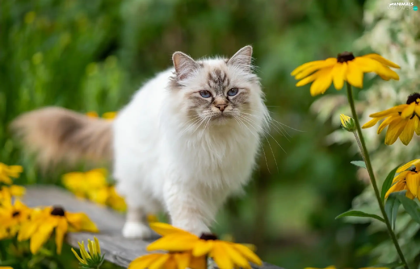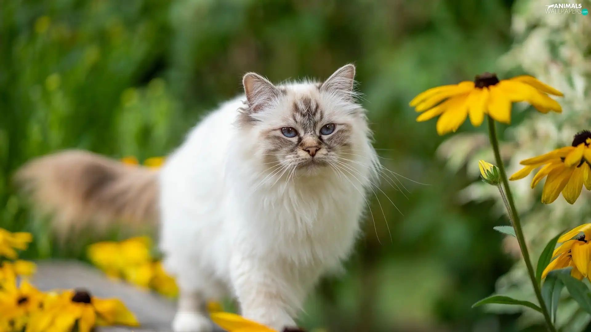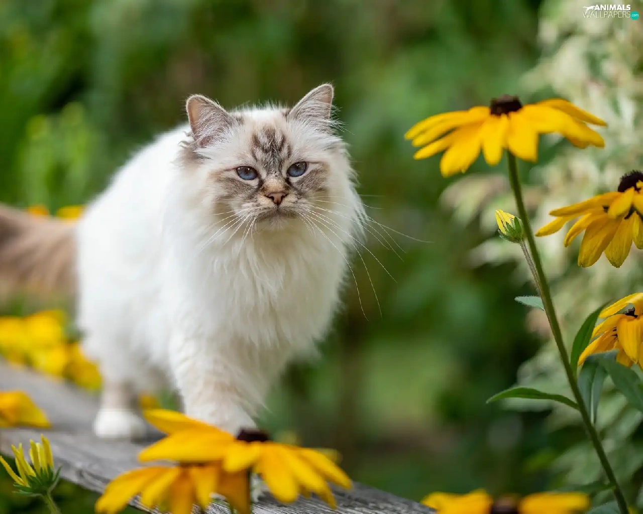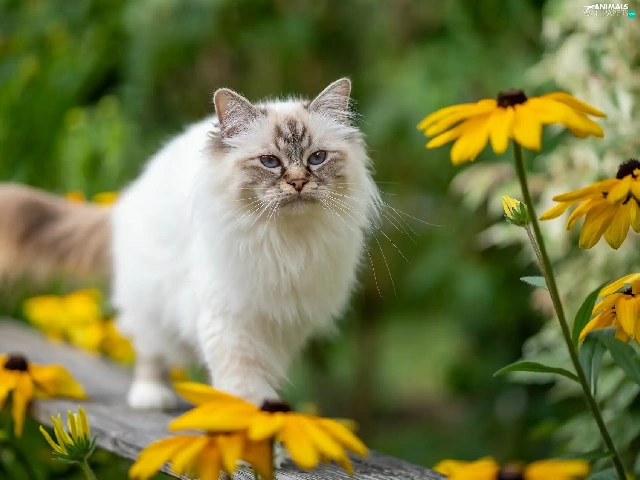 Eyes, Ragdoll Cat, Yellow Flowers, Blue, fluffy, Bench, blur