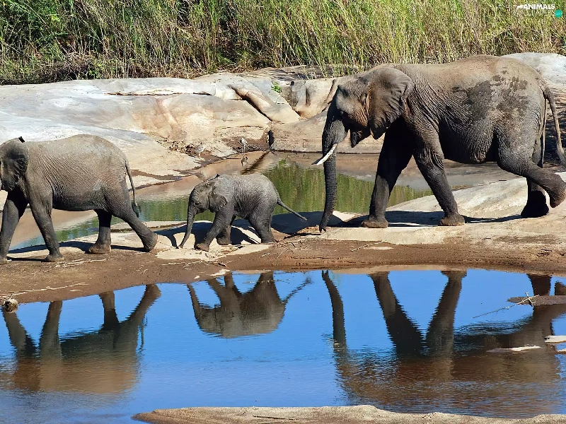 Elephants, water, grass, Family