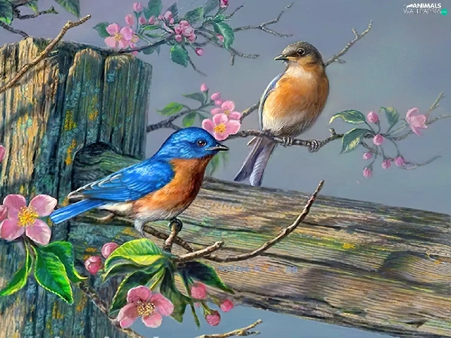 Blue, Two cars, Fance, Flowers, birds, russet