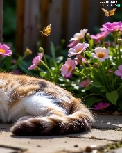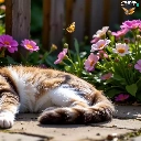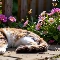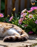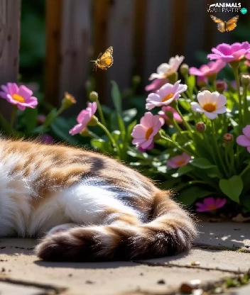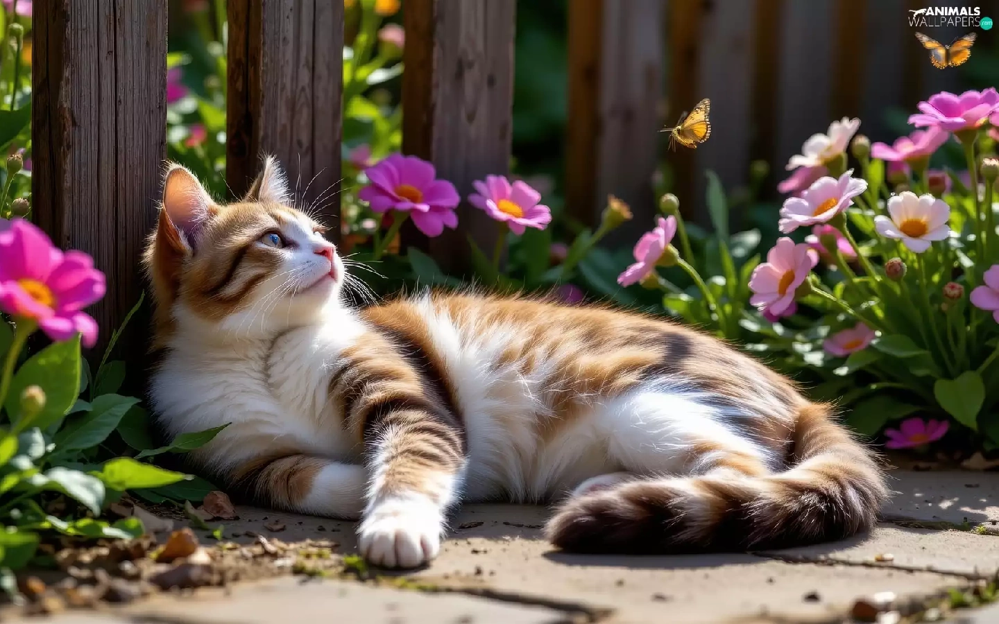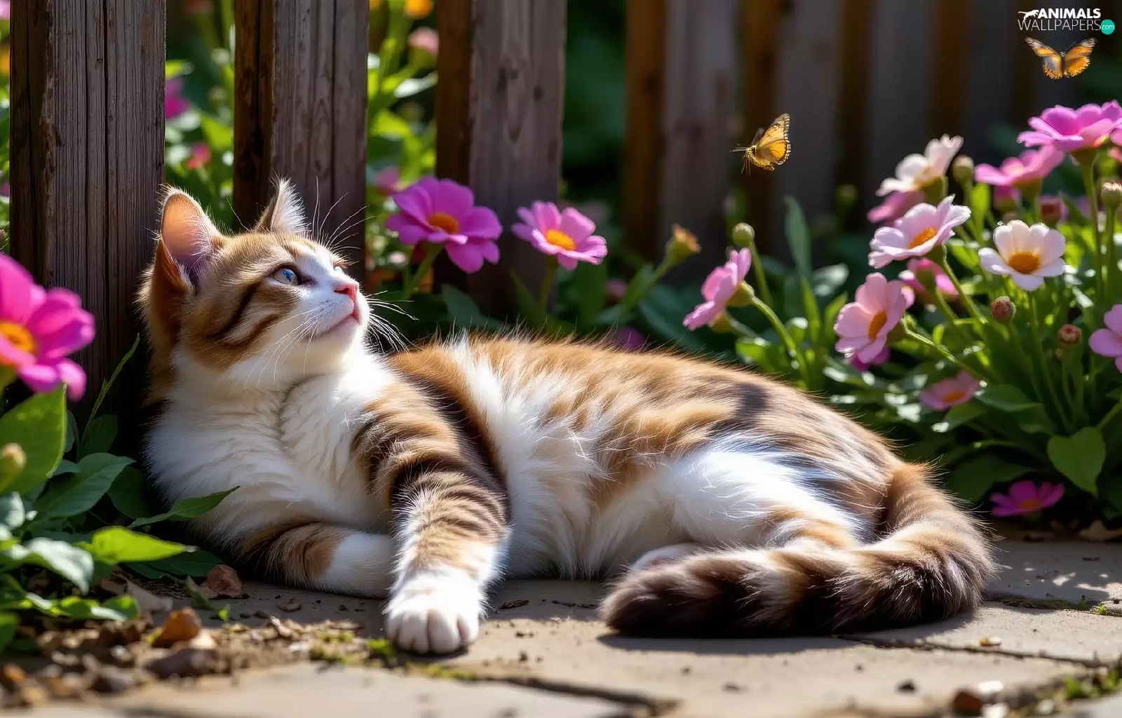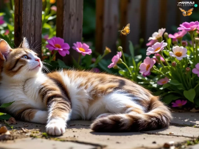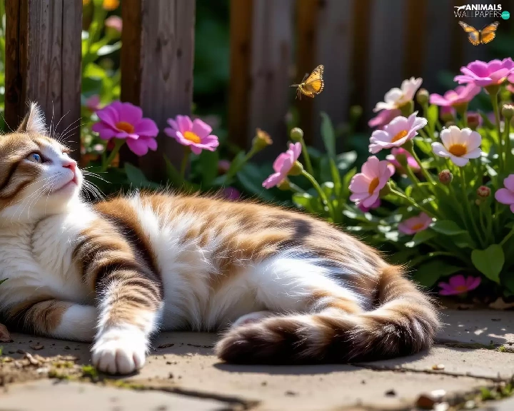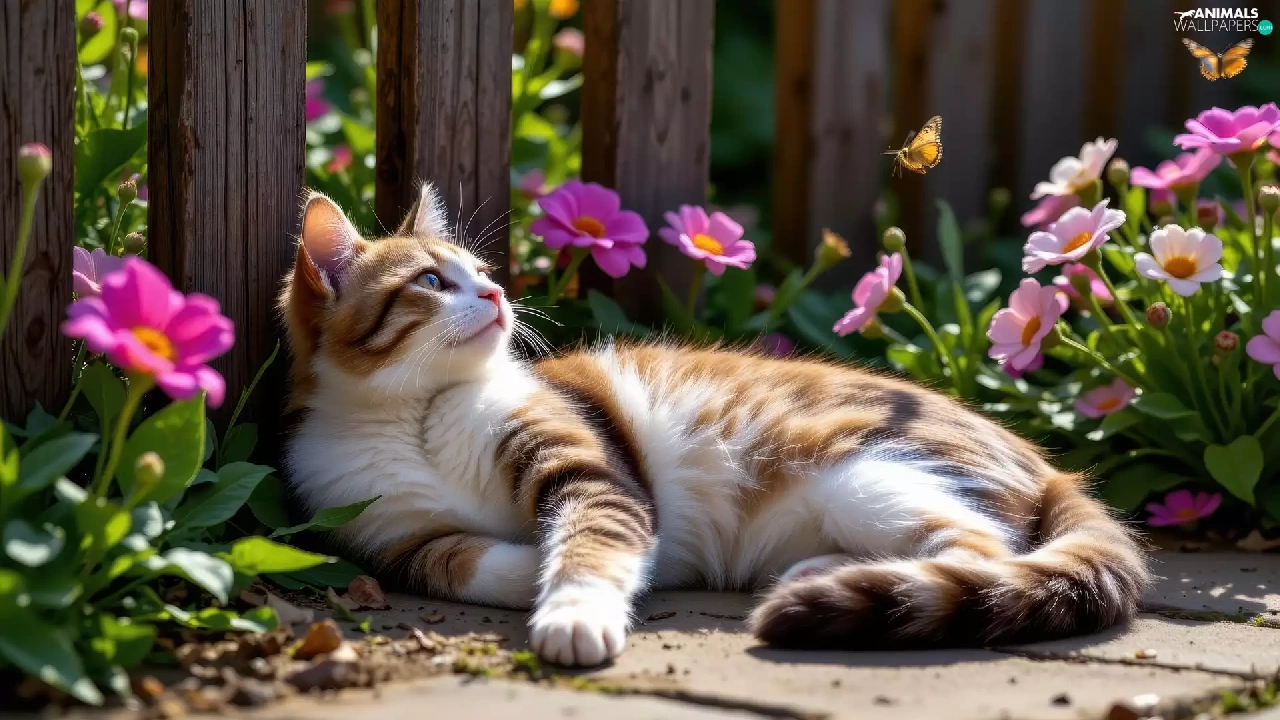 Red-white, lying, Fance, Ai, Flowers, cat