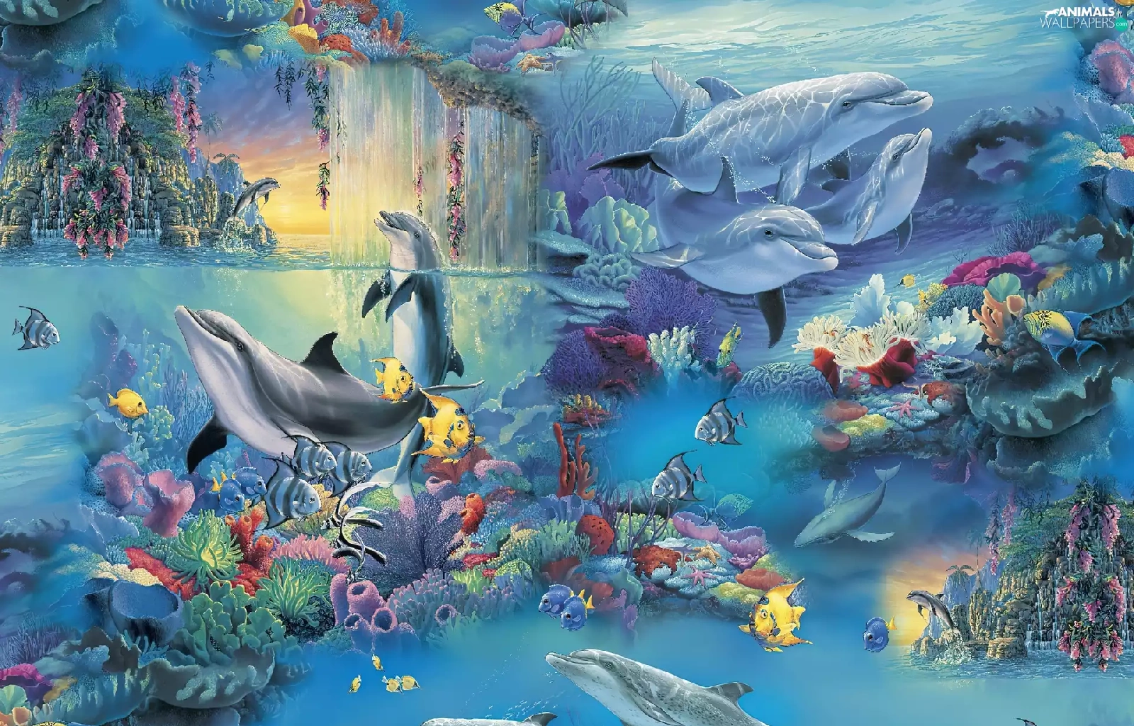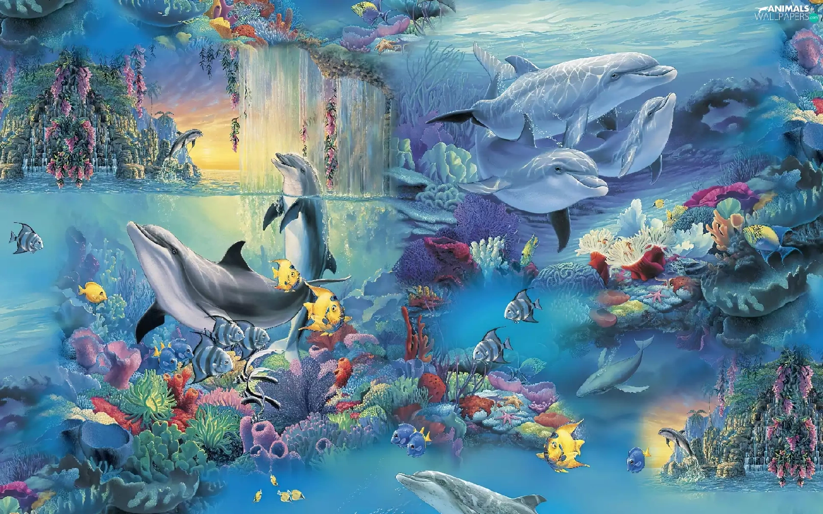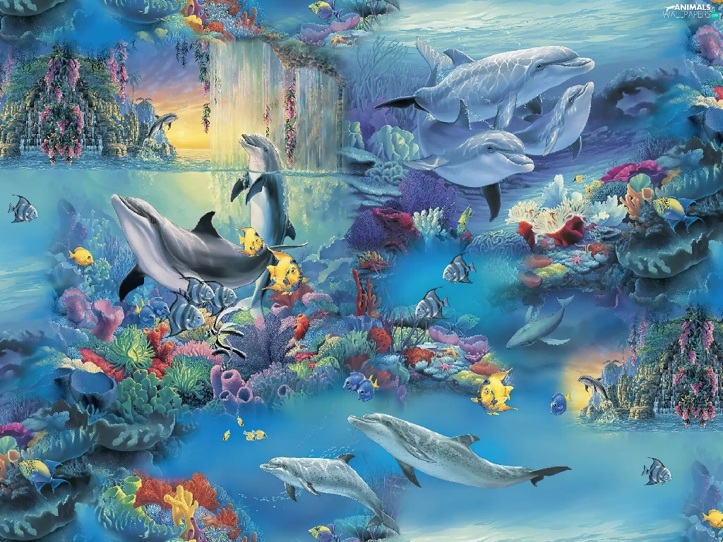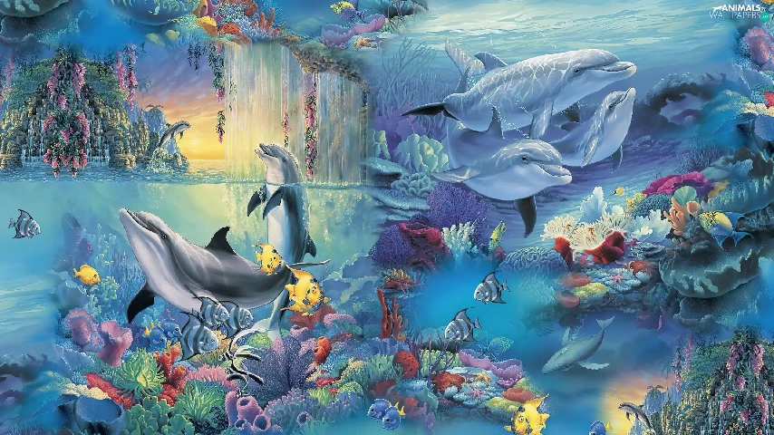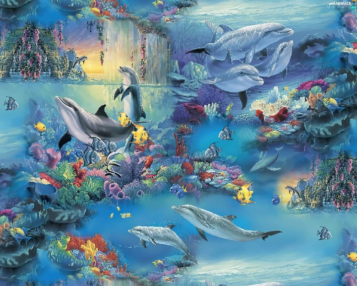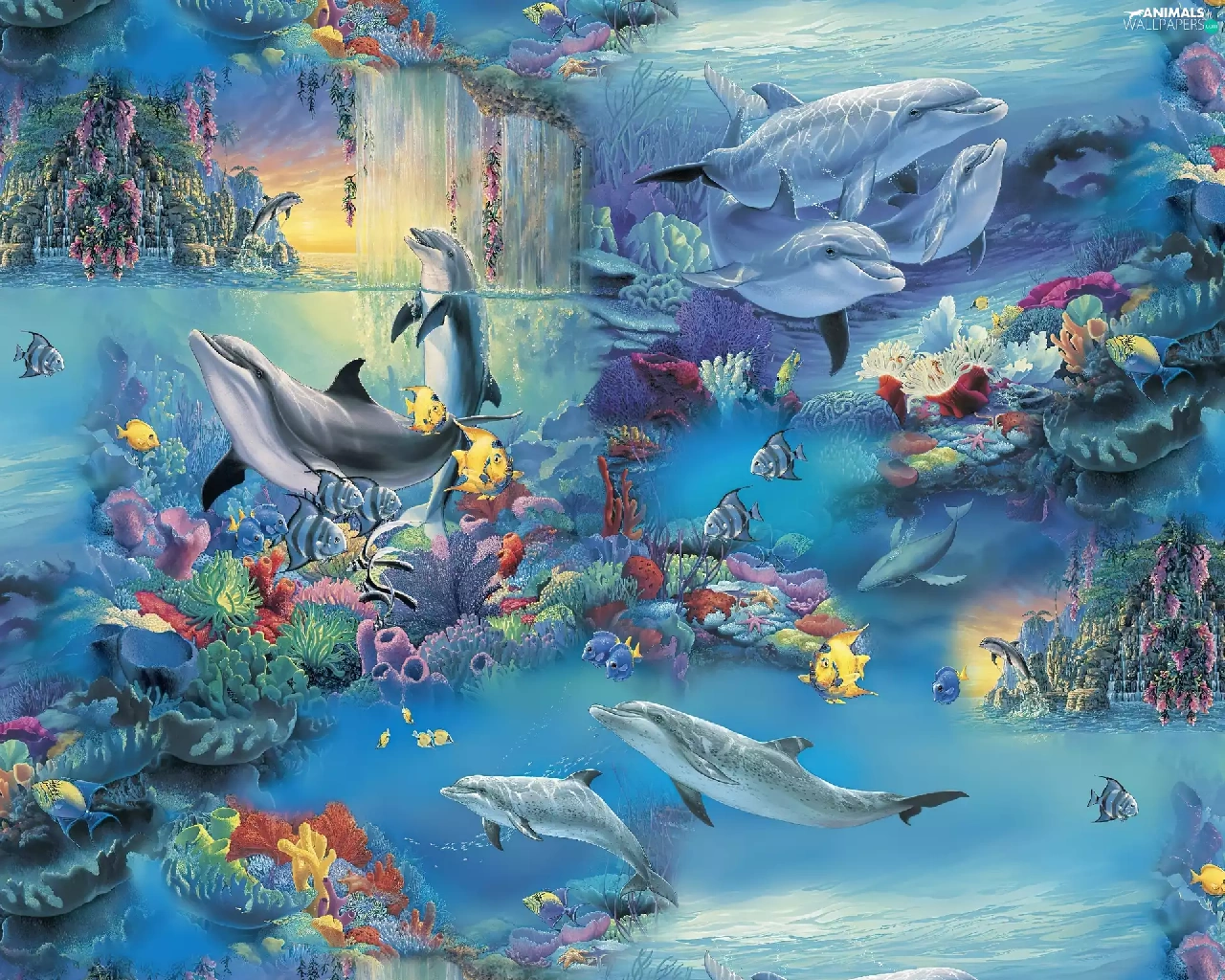 Art, fantasy, fishes, Ocean, dolphins