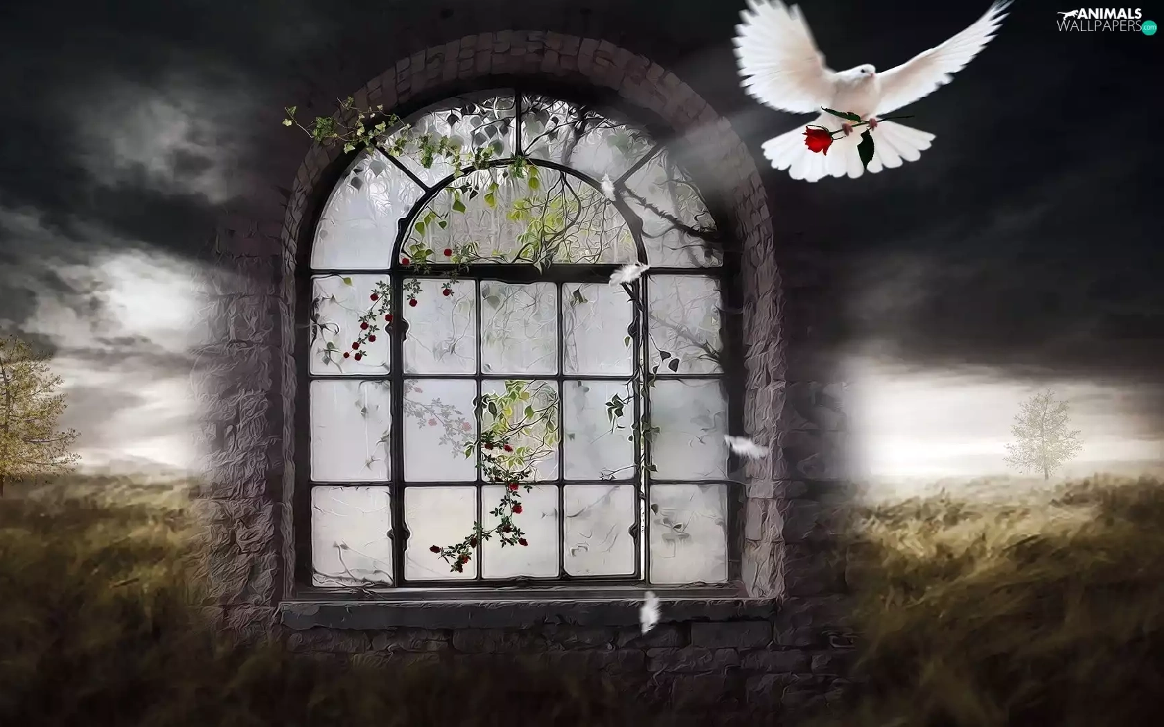 clouds, fantasy, Window, dark, pigeon