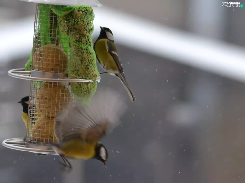 flight, Chickadees, Bird feeder