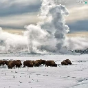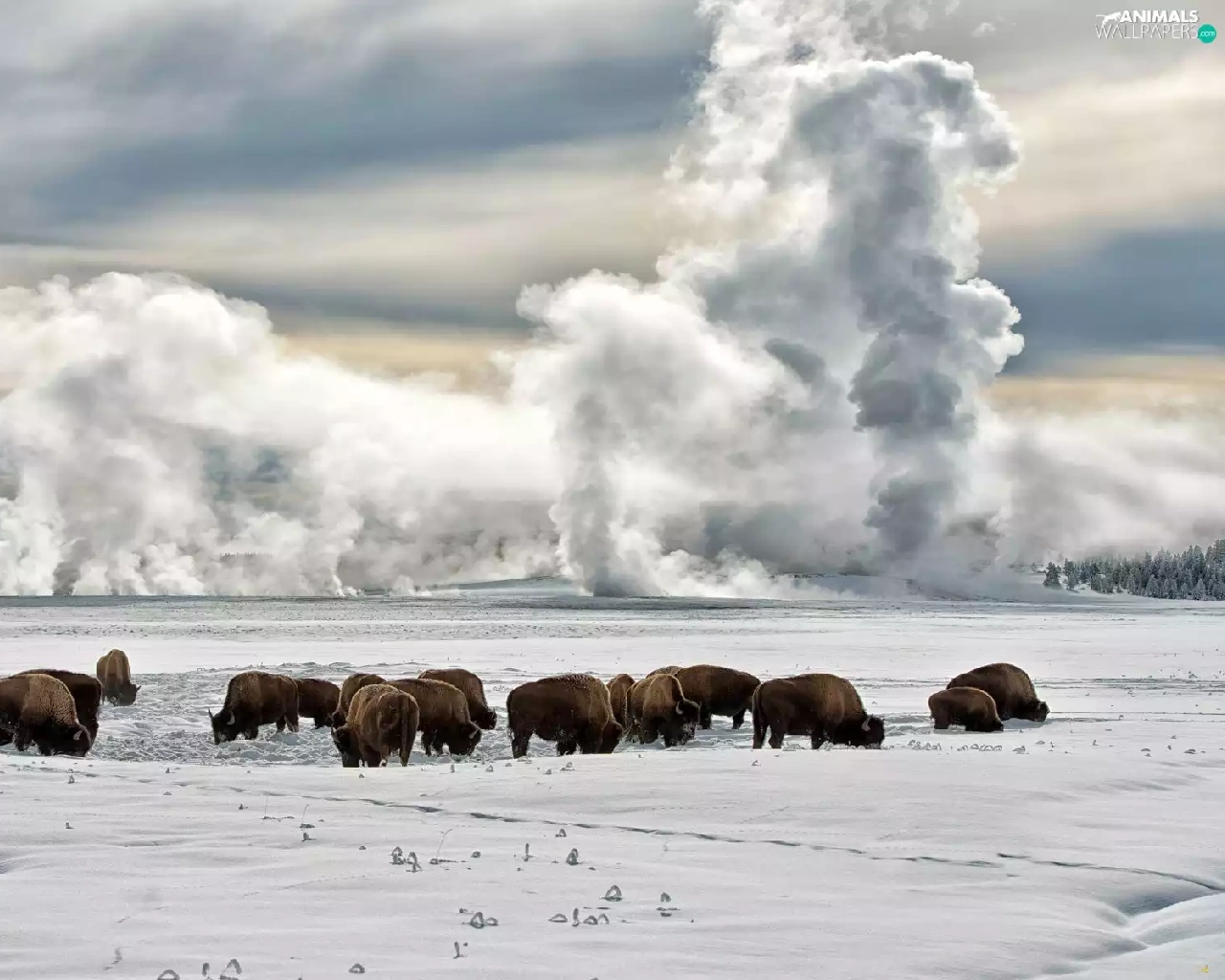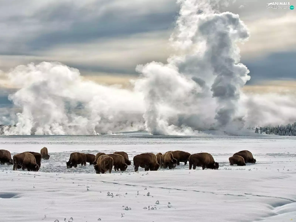 bison, clouds, winter, field