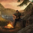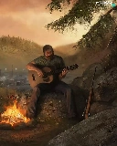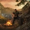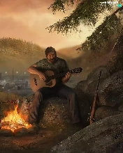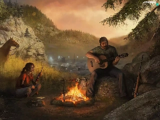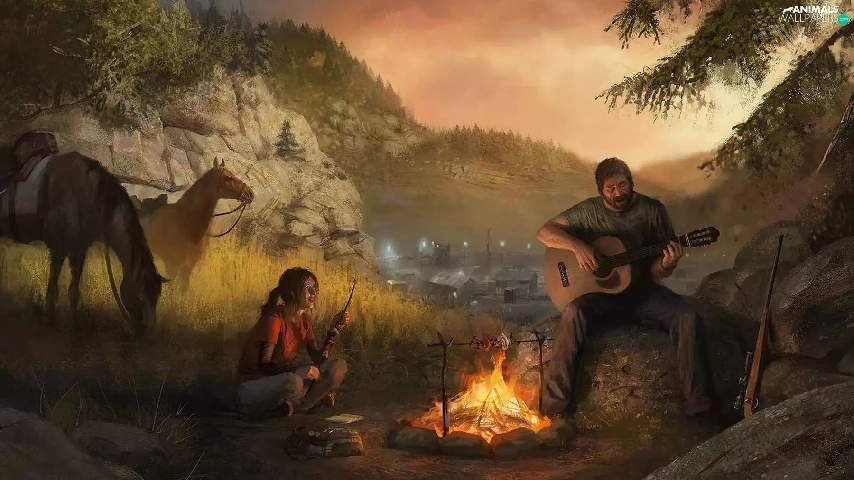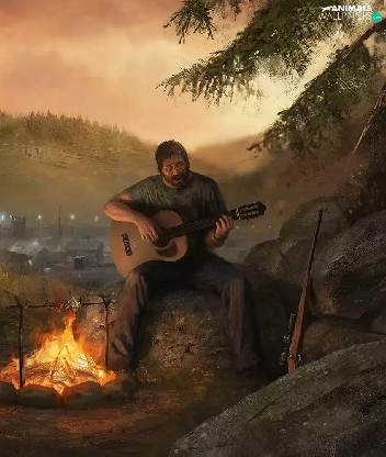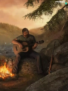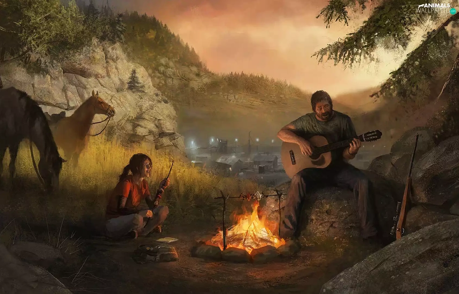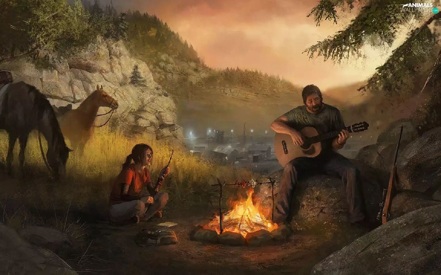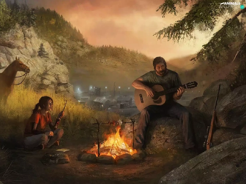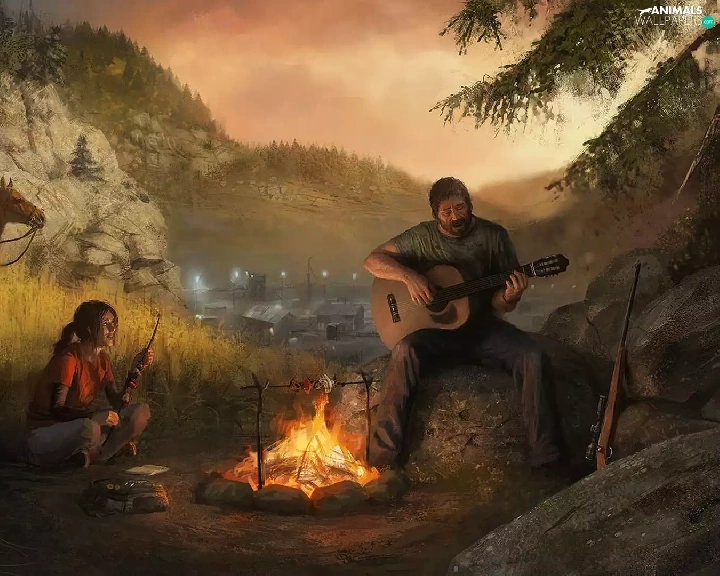 fire, girl, Mountains, a man, bloodstock, picture, painting, Guitar