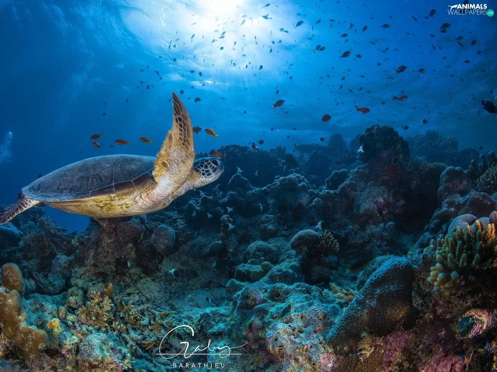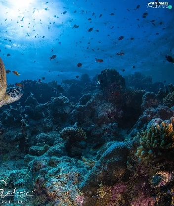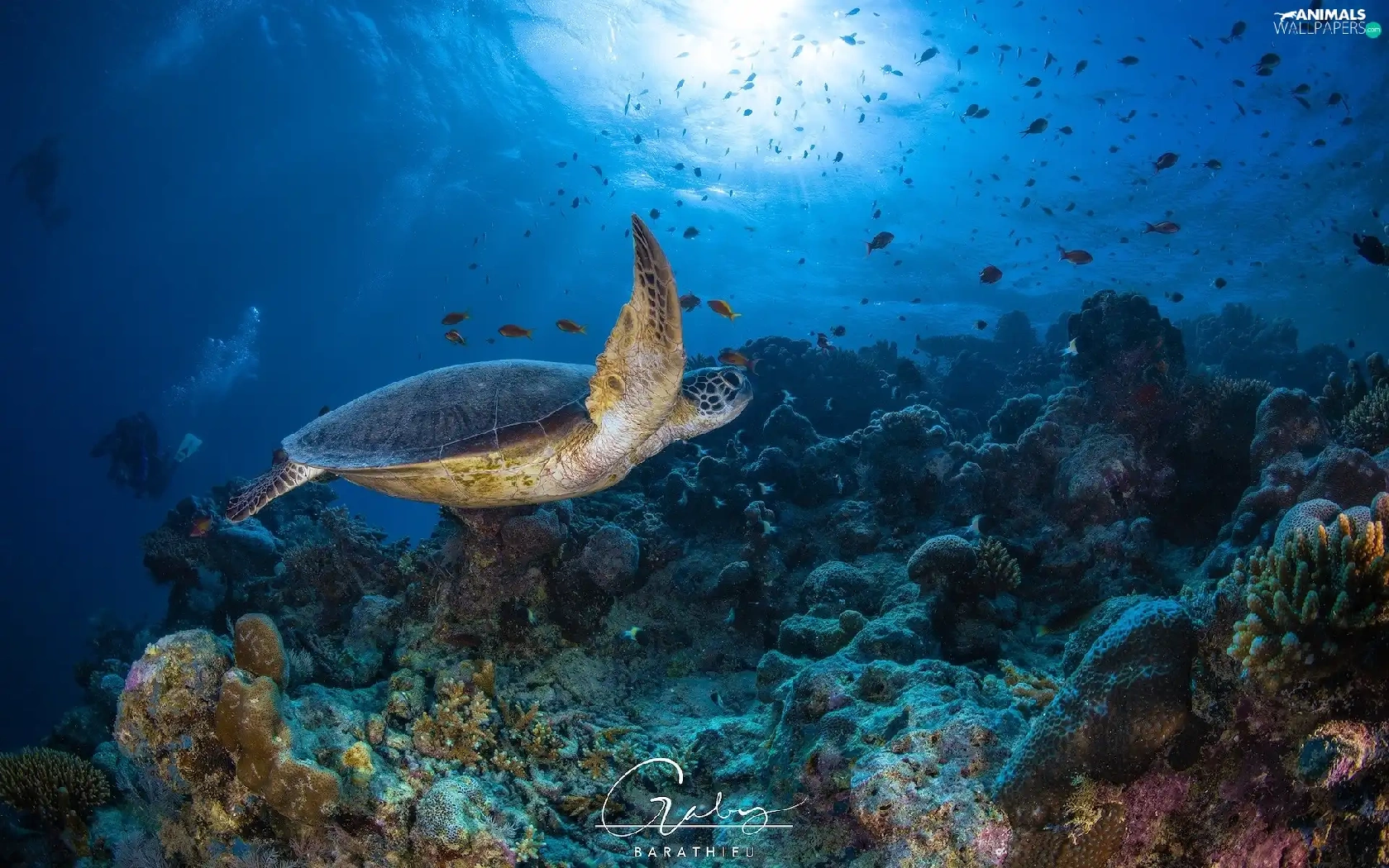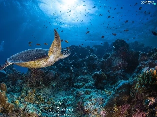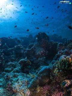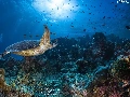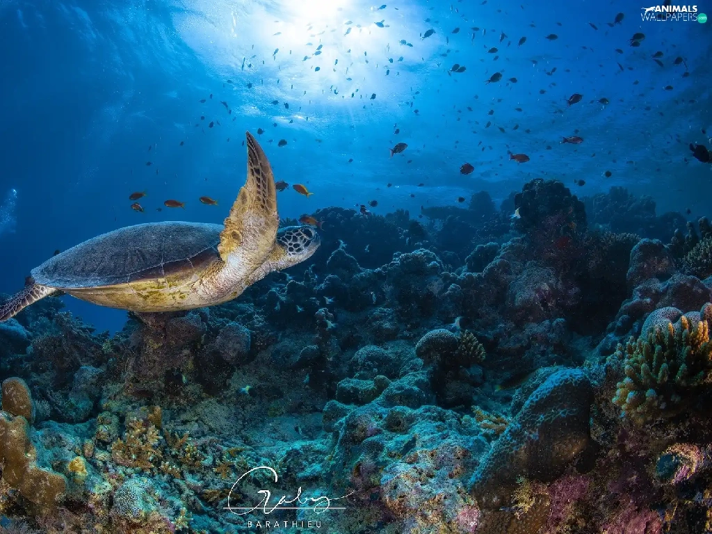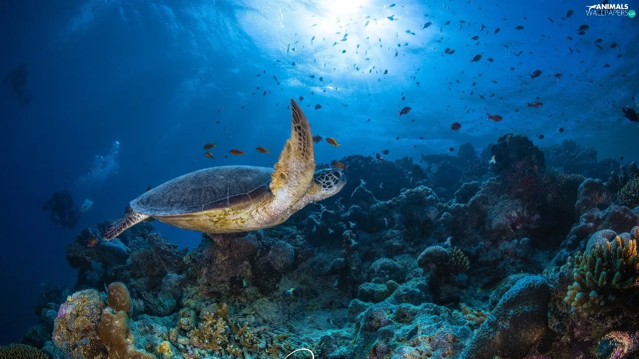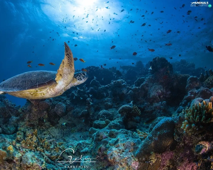 Corals, fish, cay, turtle, sea
