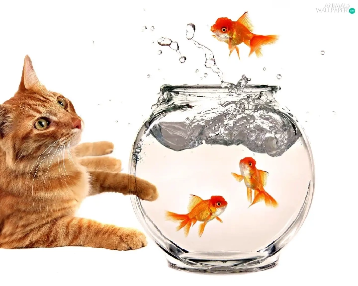 fishes, kitten, aquarium