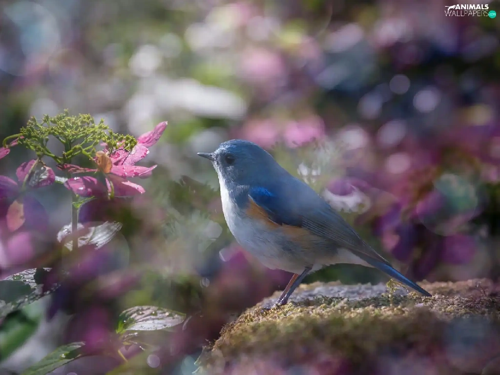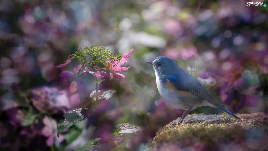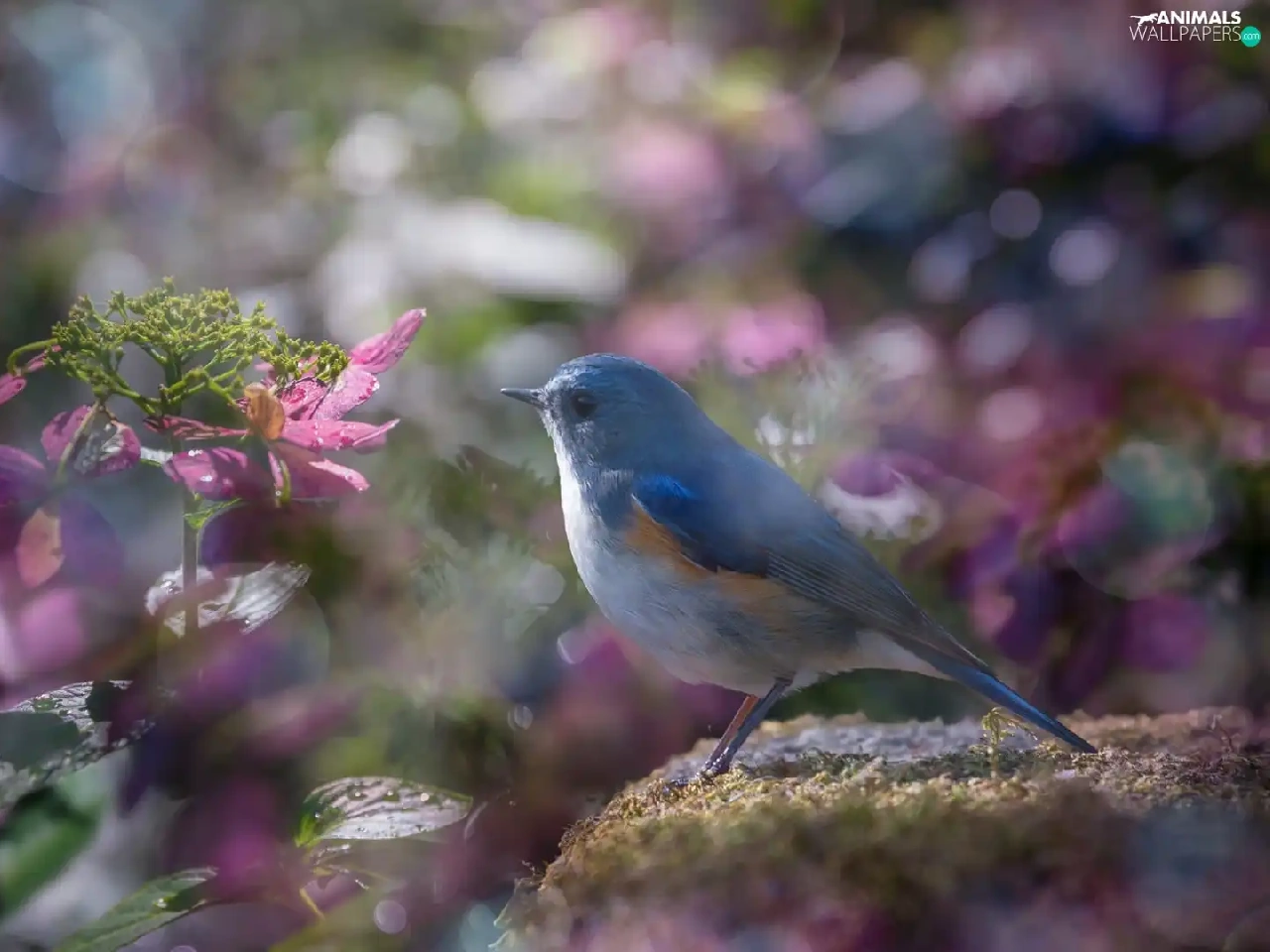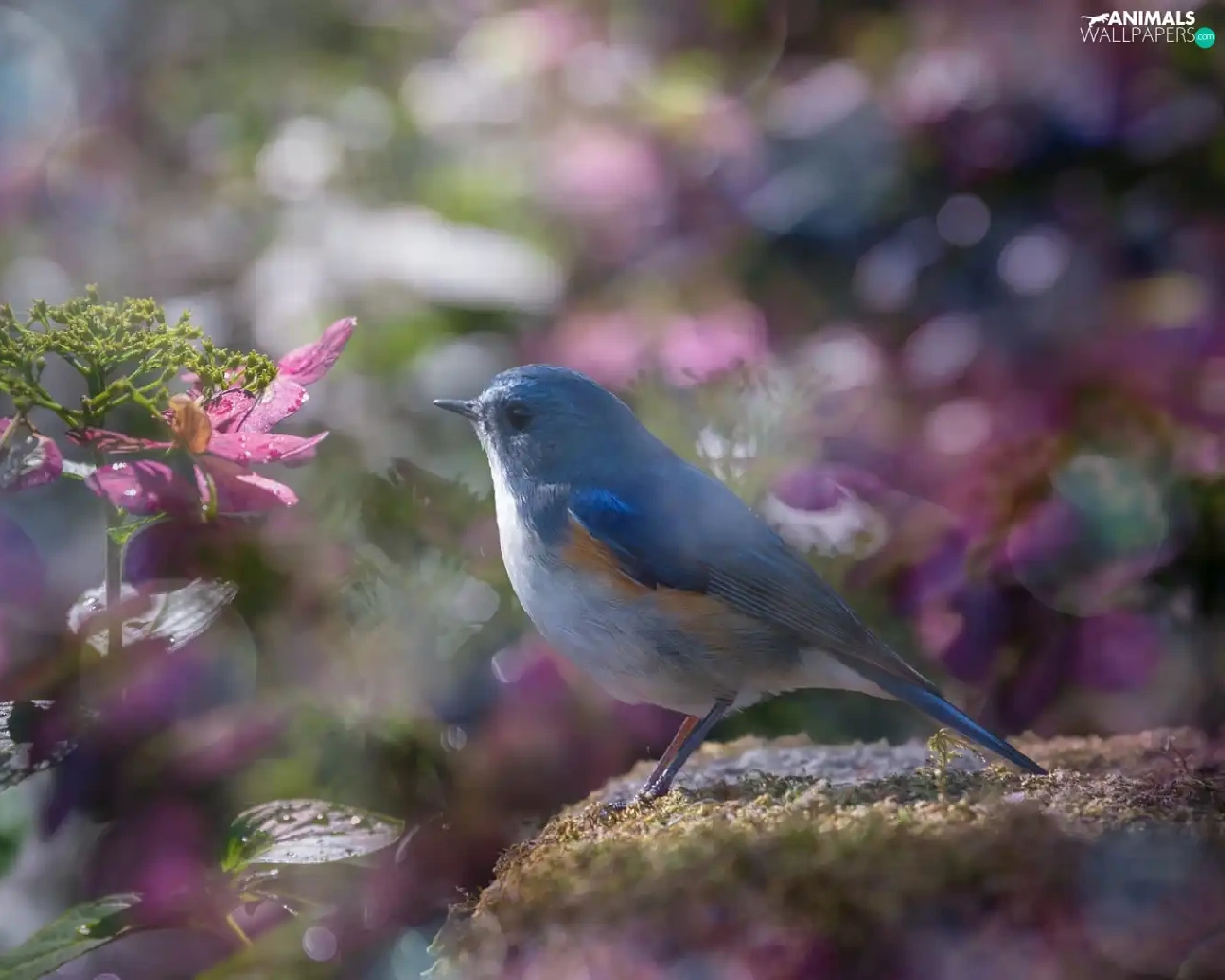 Pink, blur, Red-flanked Bluetail, hydrangeas, Bird