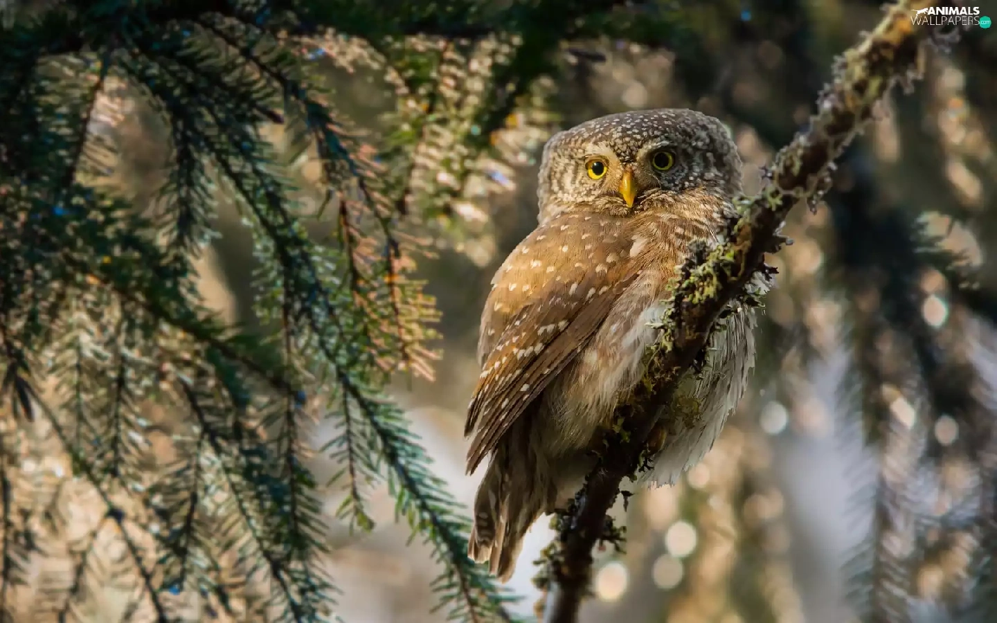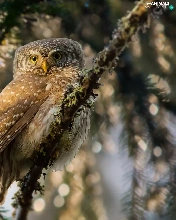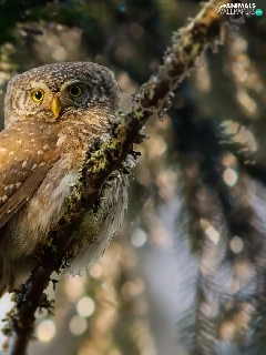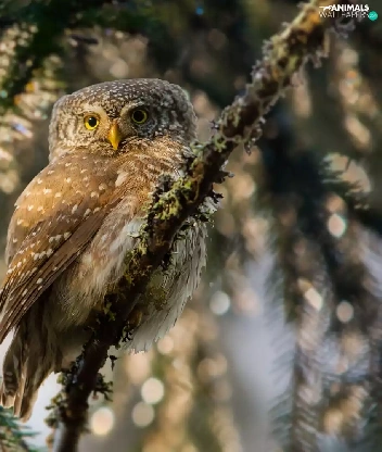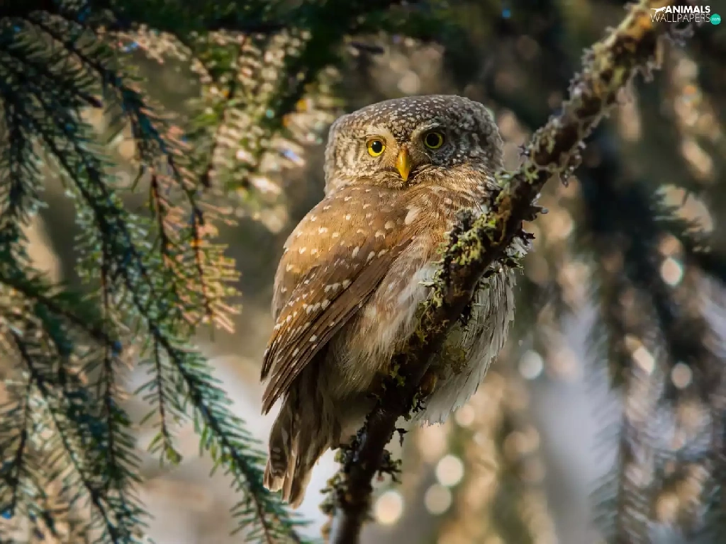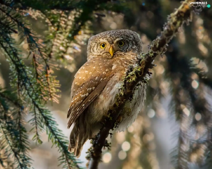 Eurasian Pygmy Owl, owl, Bird, Twigs, flash, luminosity, ligh, sun, spruce