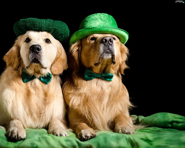Golden Retriever, beret, black background, Green, flies, Dogs, Two cars, Hat