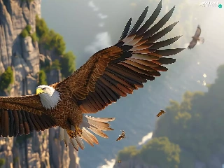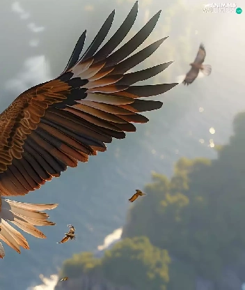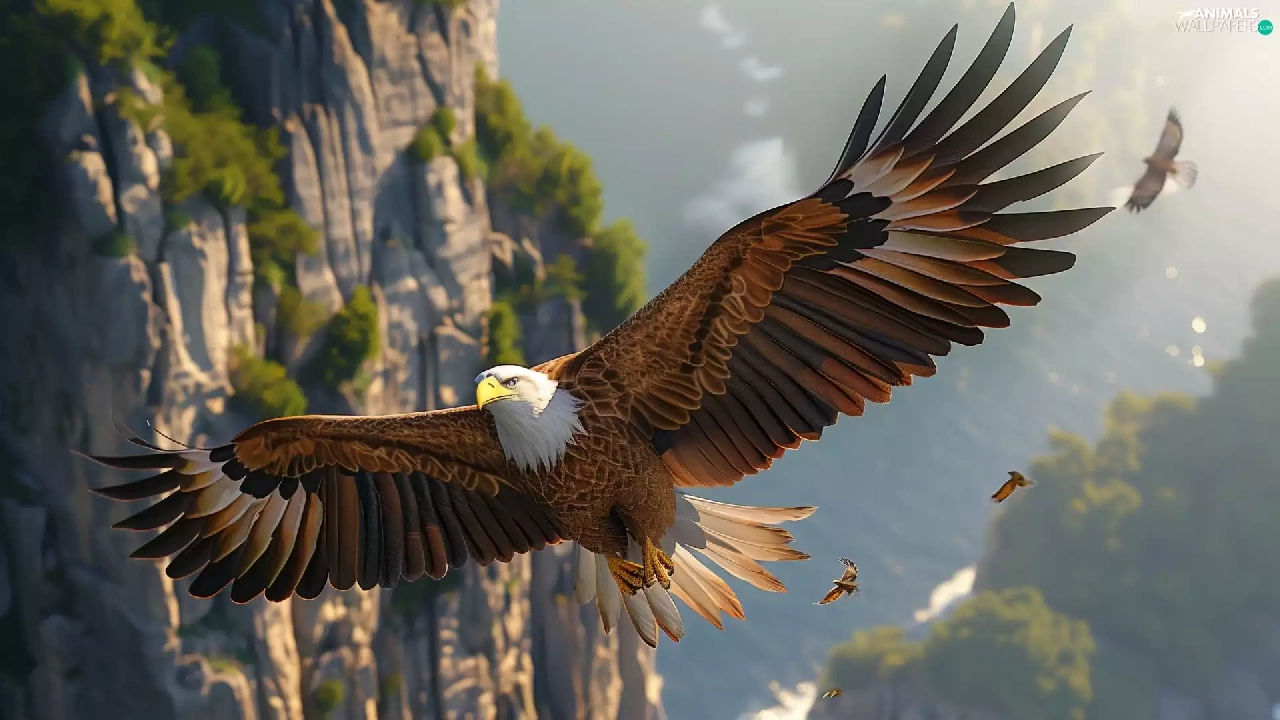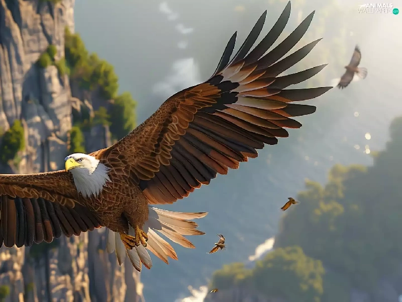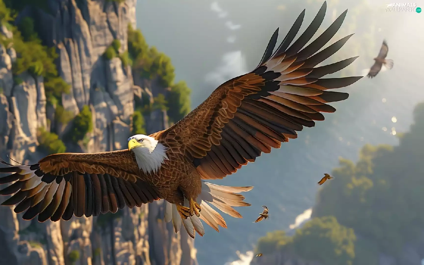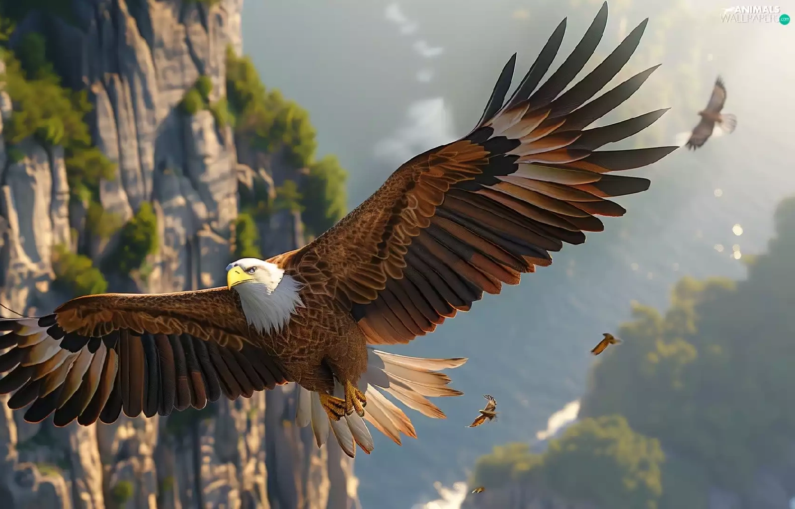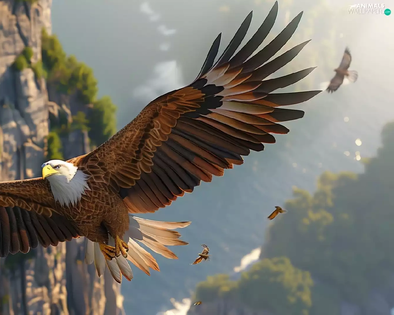 American Bald Eagle, Bird, wings, rocks, spread, flight