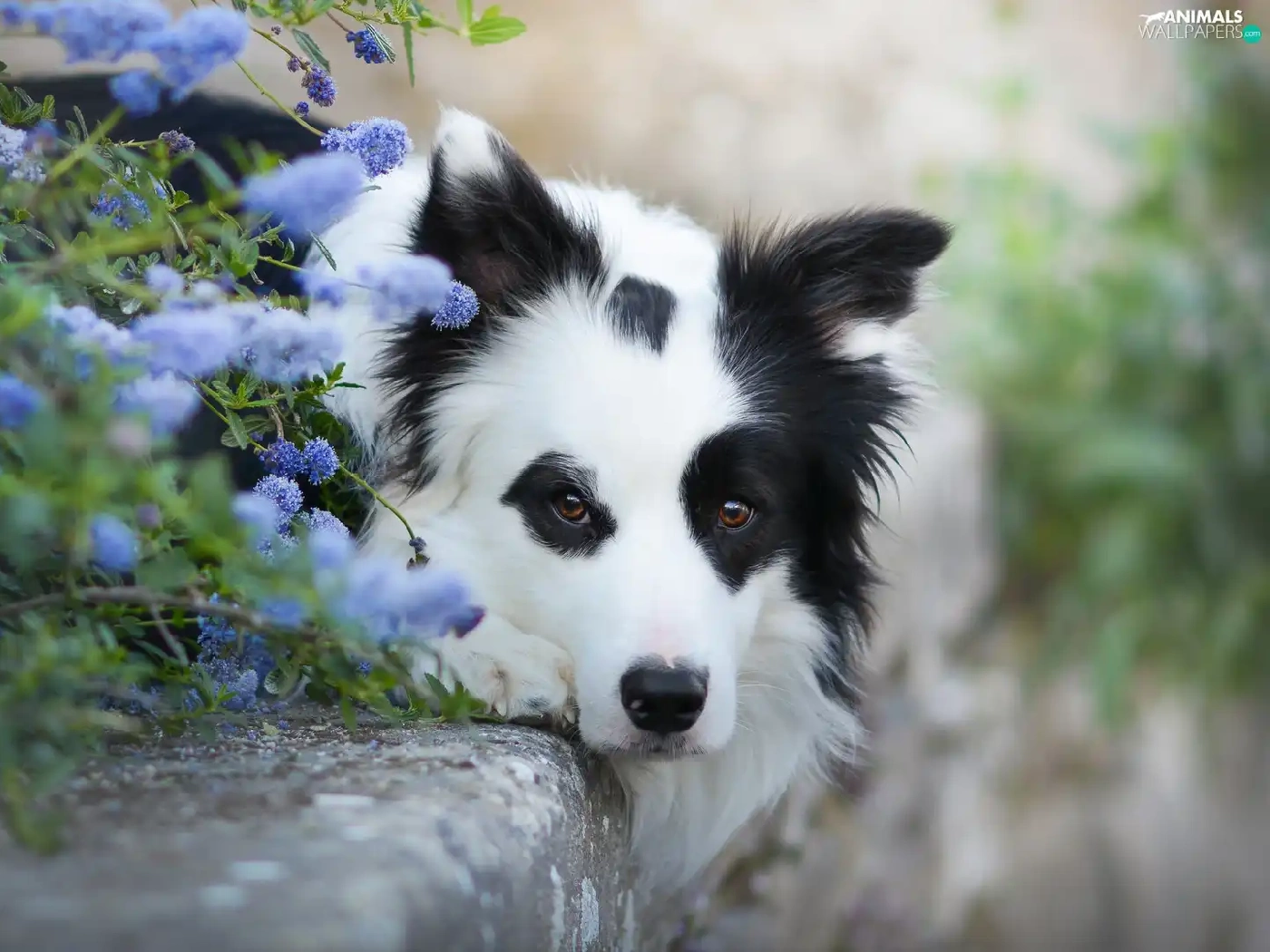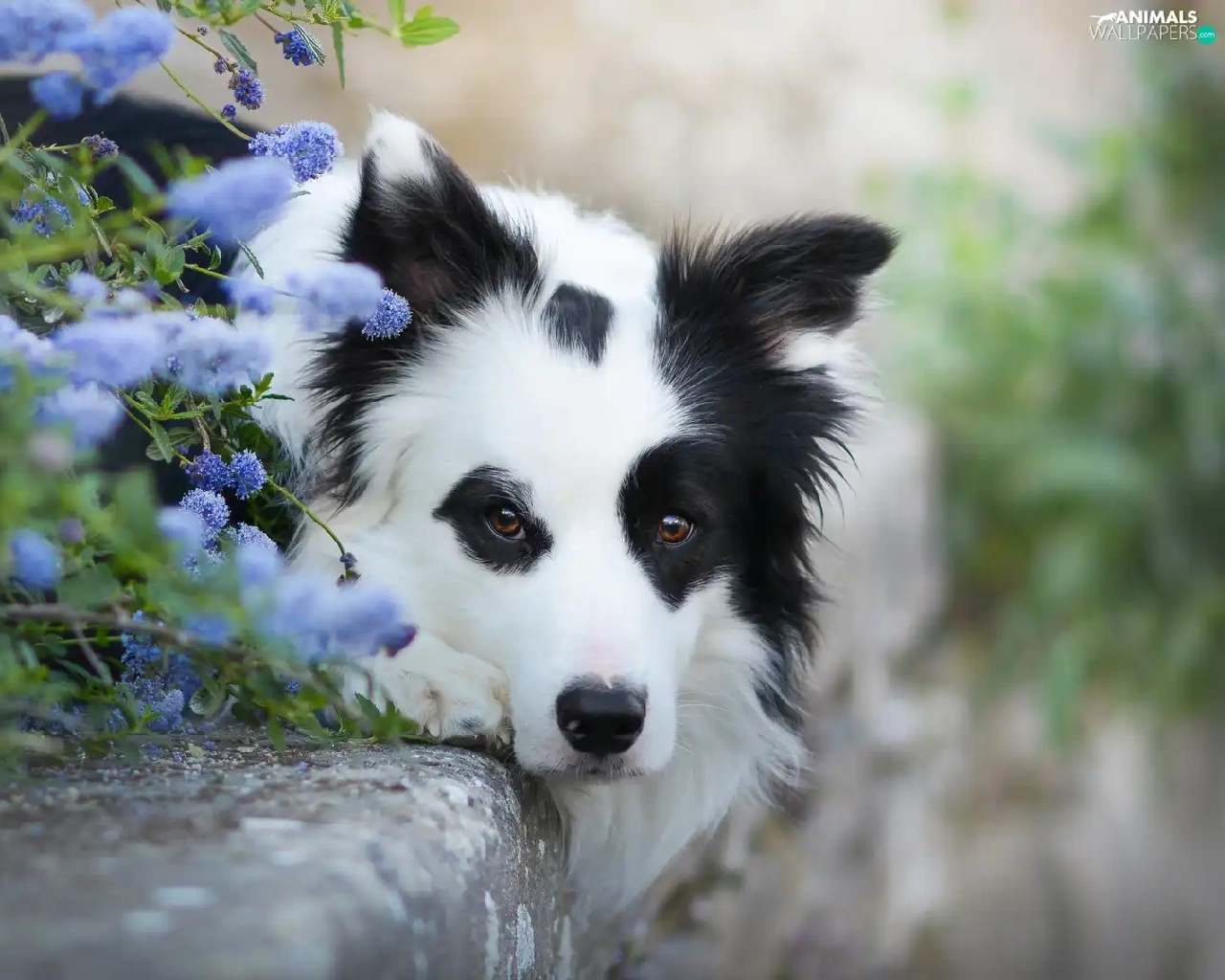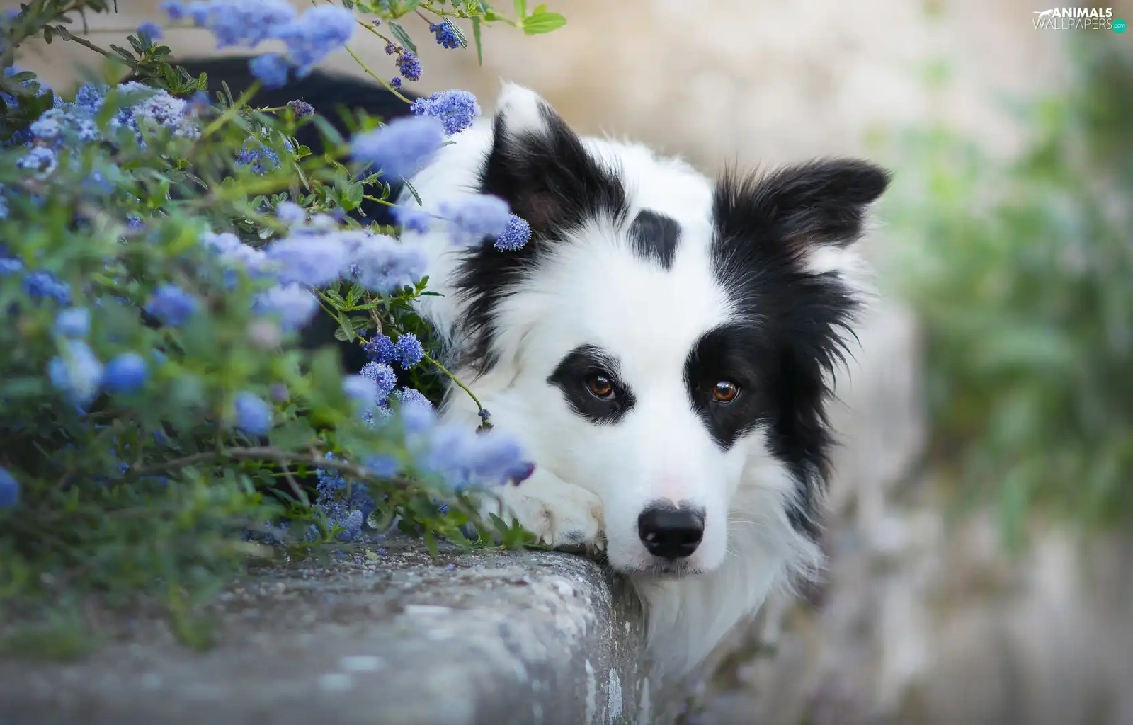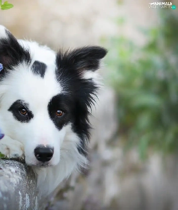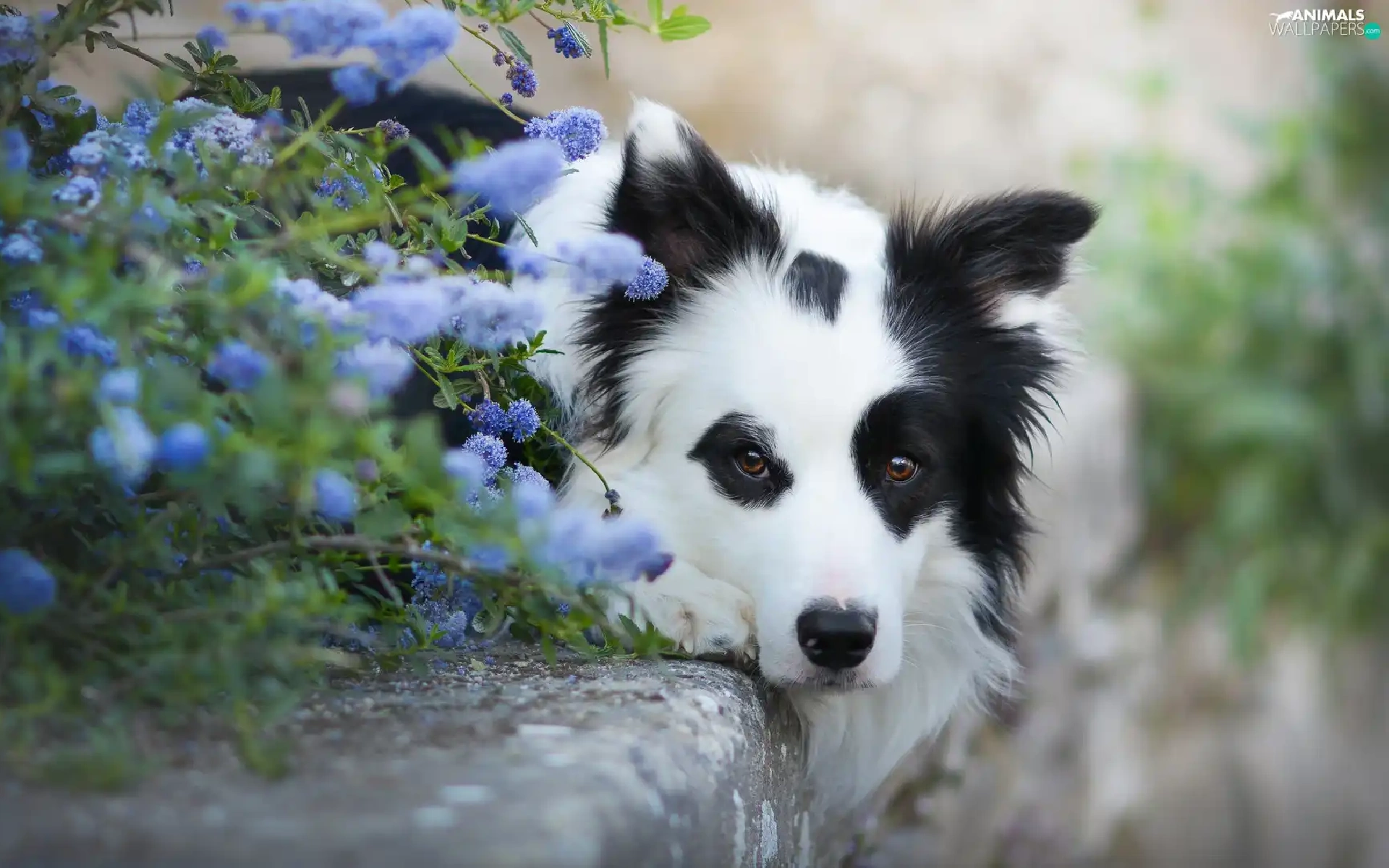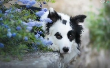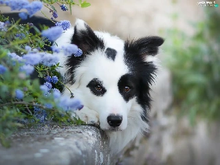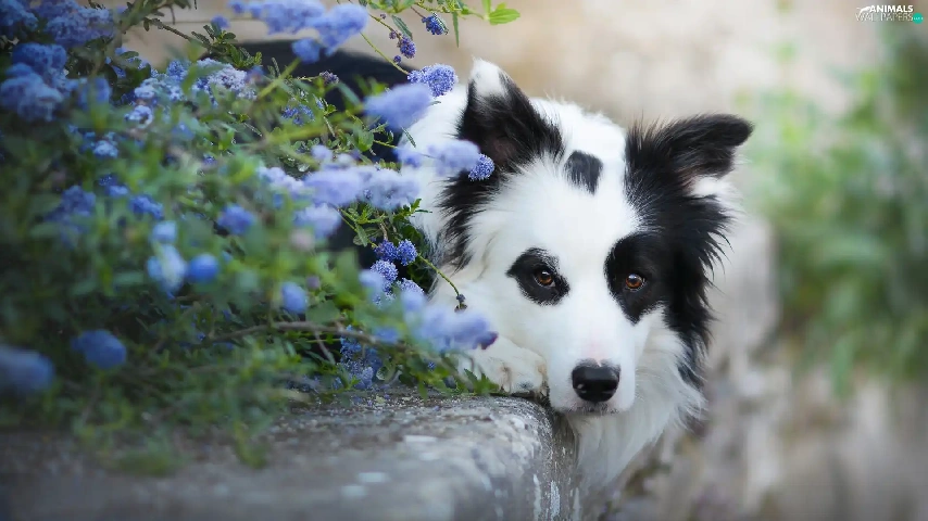 Flowers, curb, Border Collie, muzzle, lying