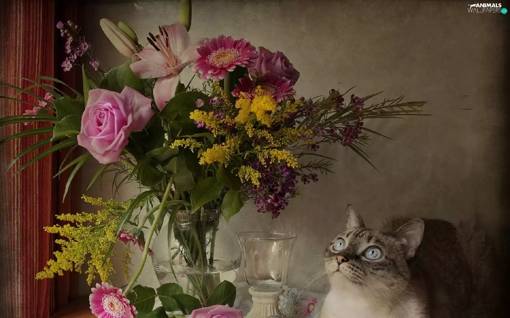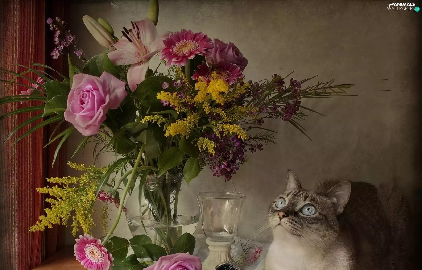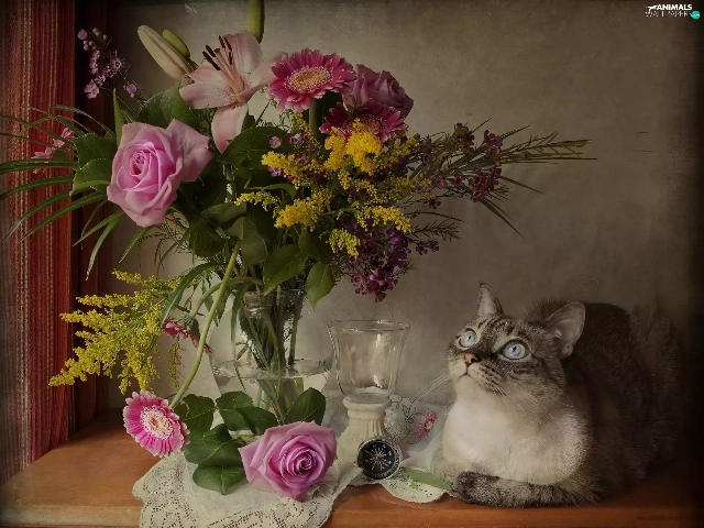 flowers, cat, bouquet
