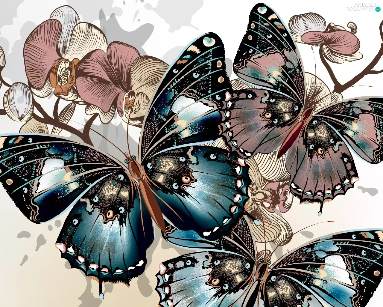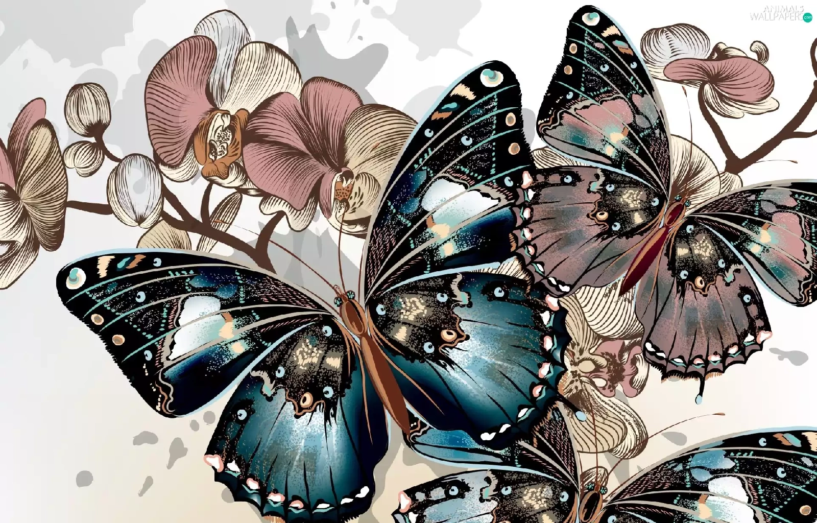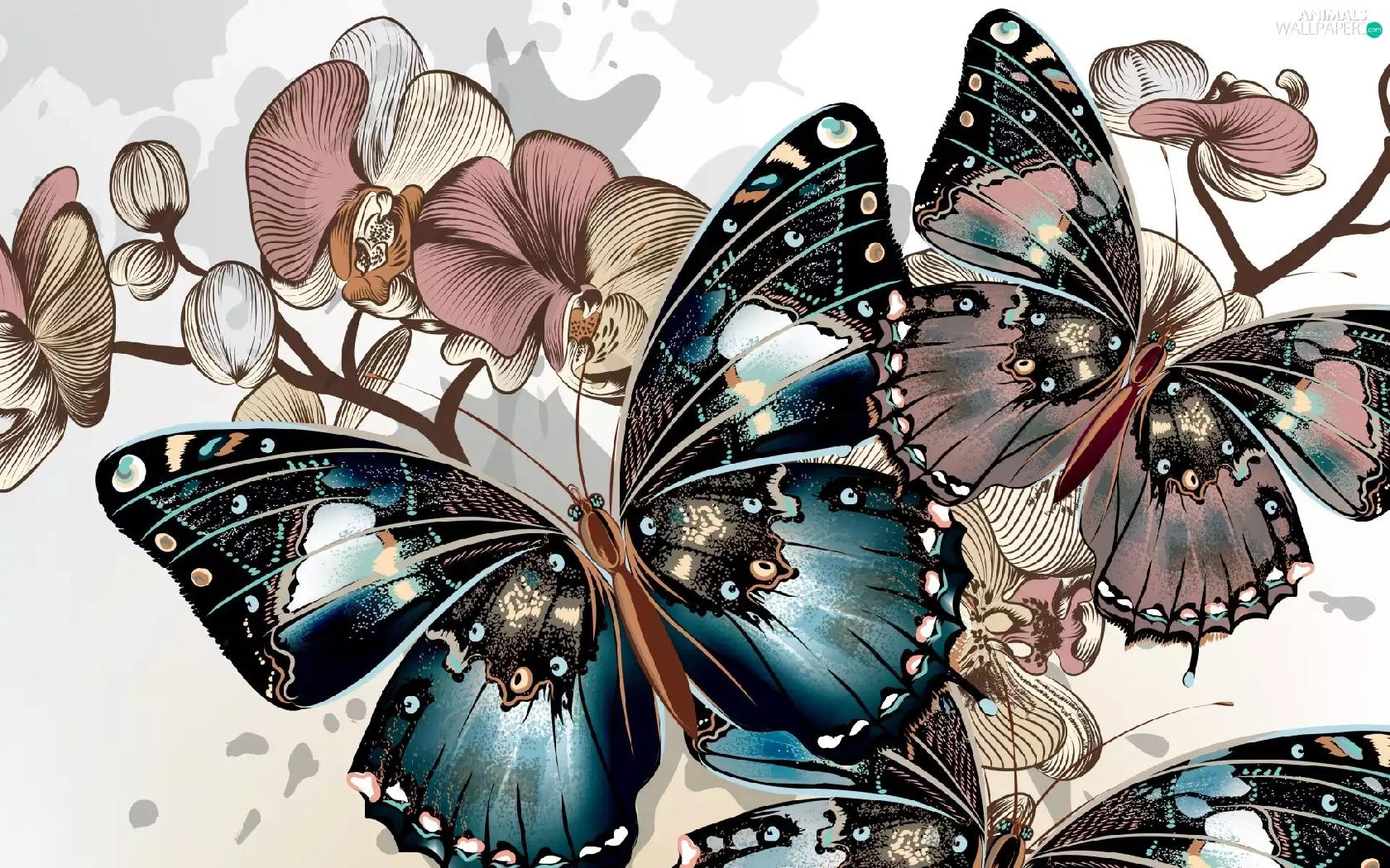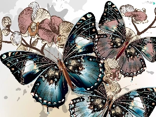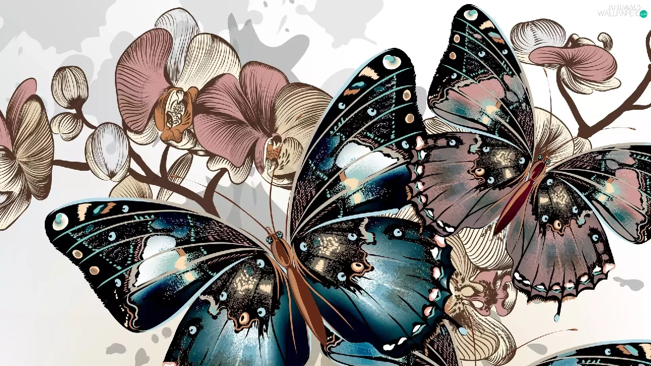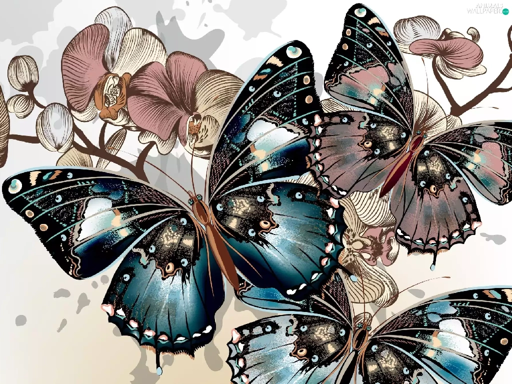 butterflies, Twigs, graphics, Flowers