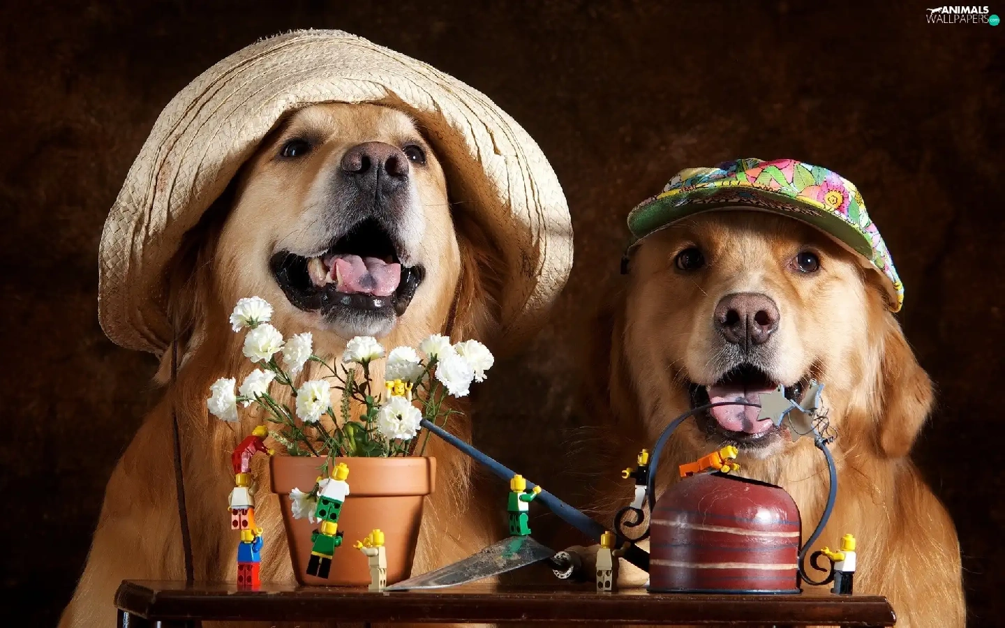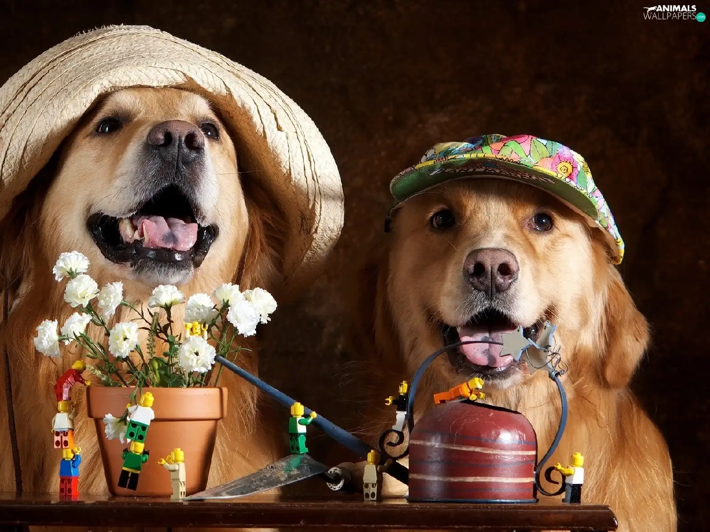 caps, Flowers, Dogs, Golden Retrievery, Two cars