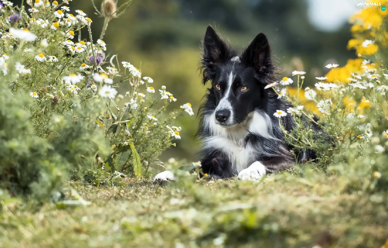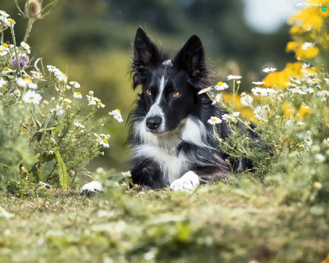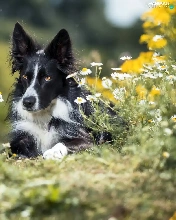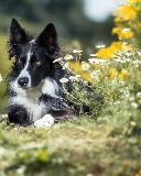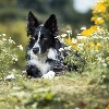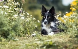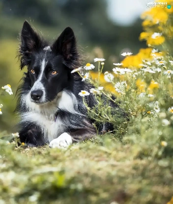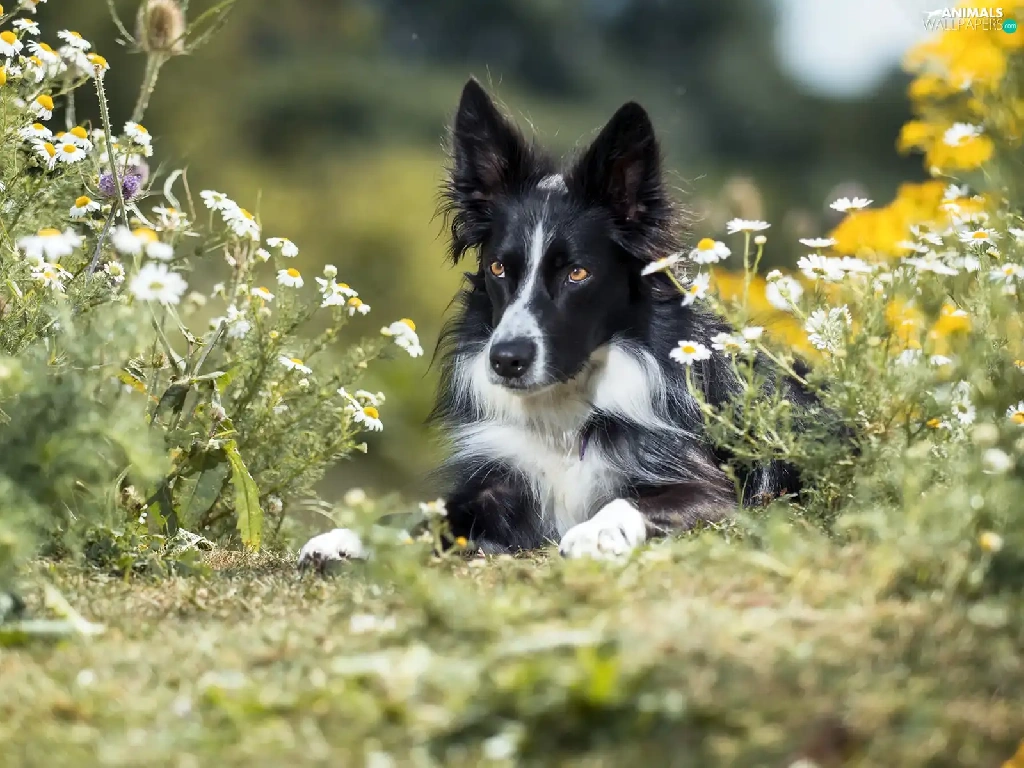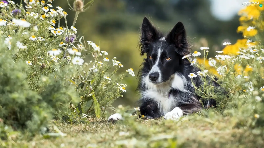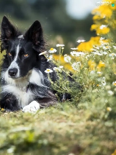 dog, Border Collie, Flowers, black and white