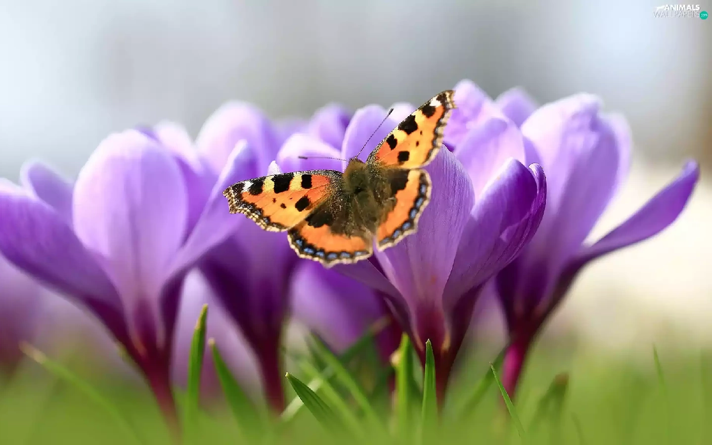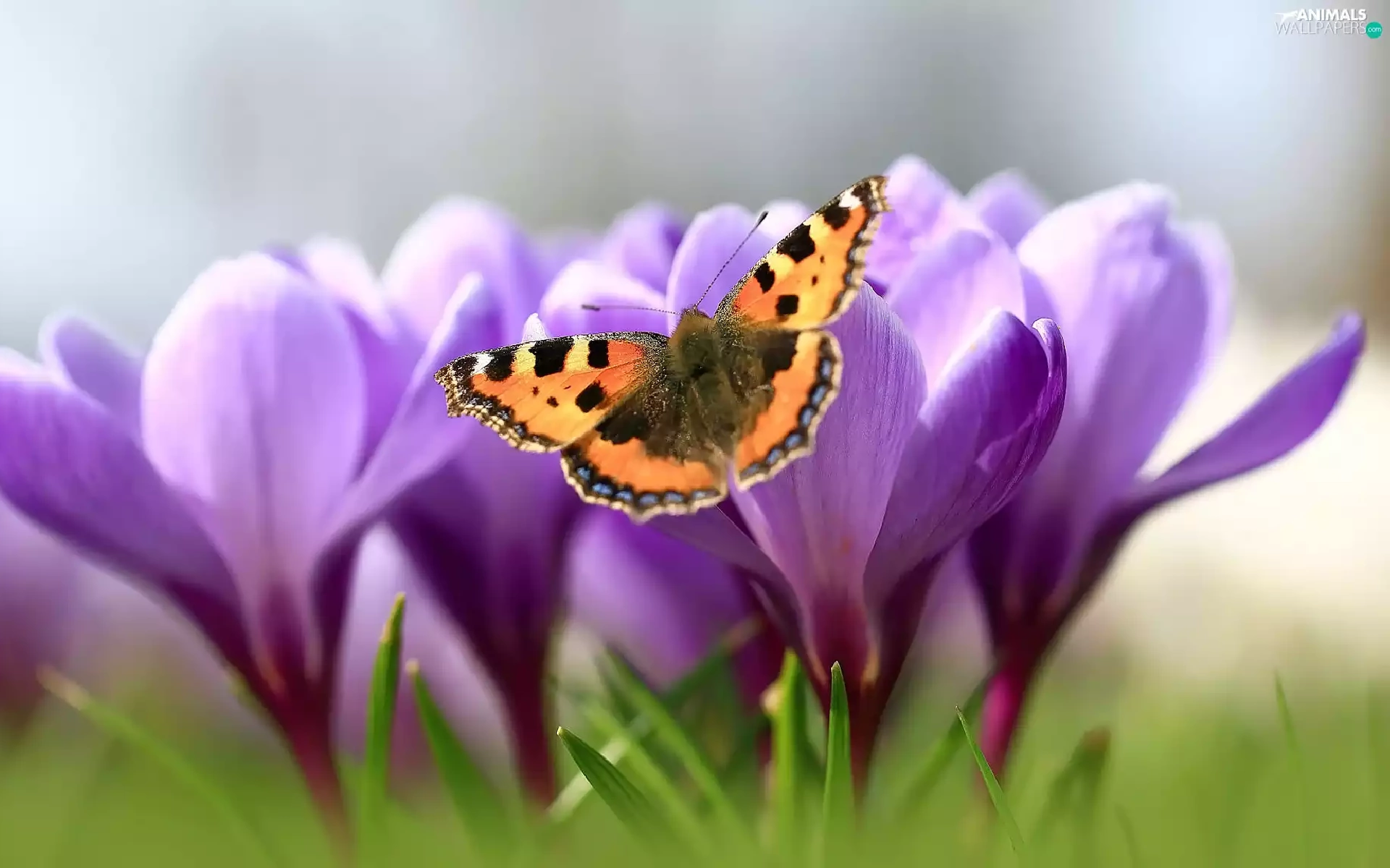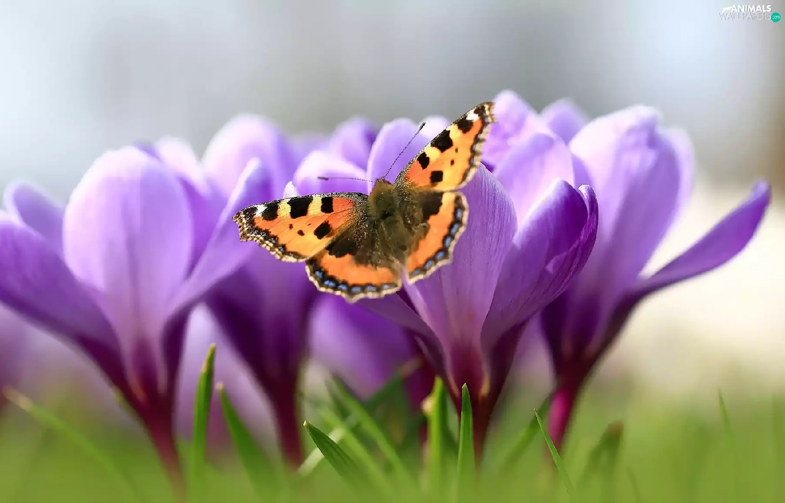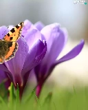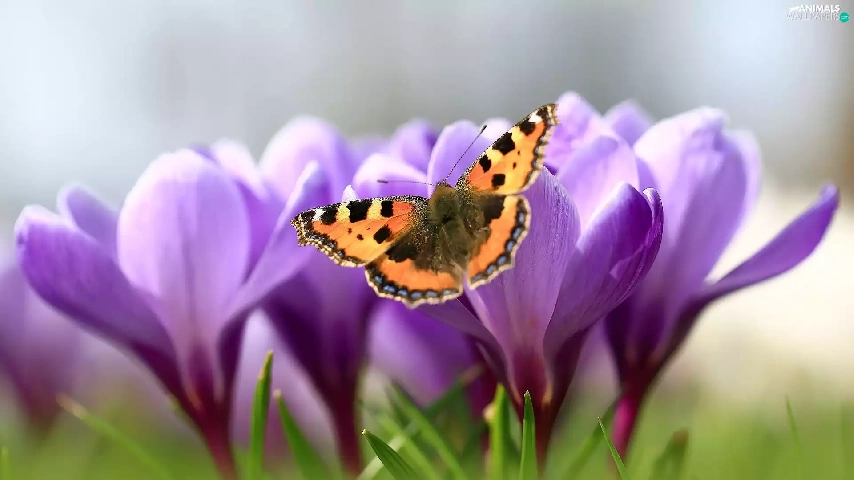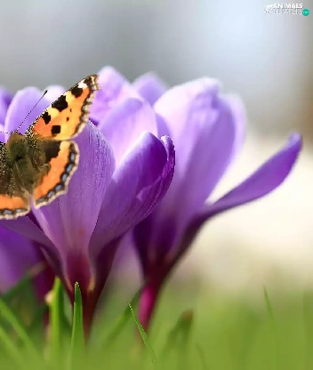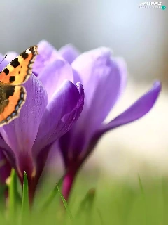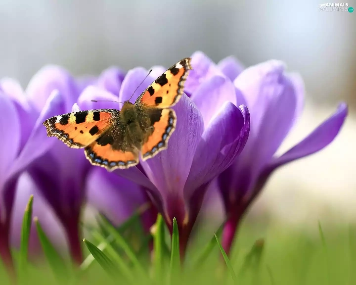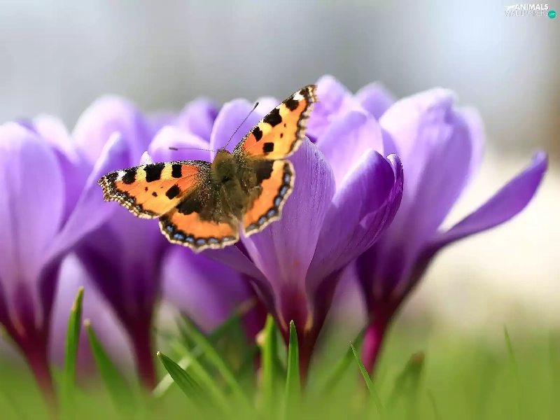 butterfly, Flowers, crocuses, Small Tortoiseshell