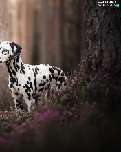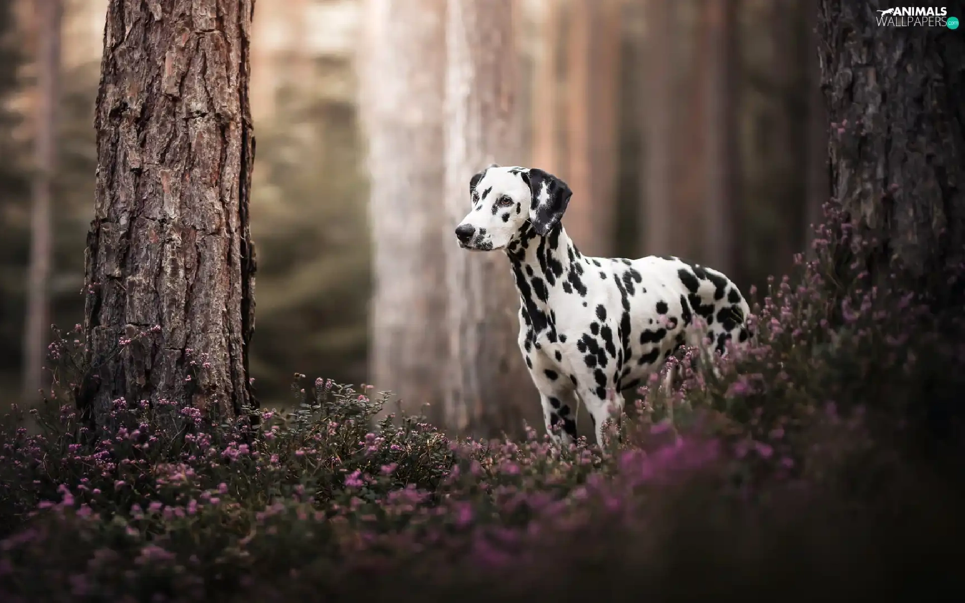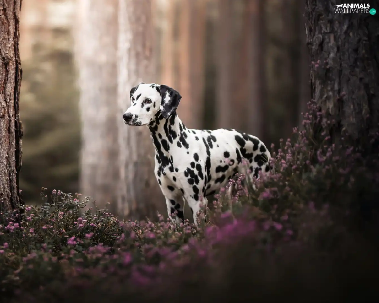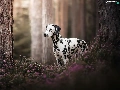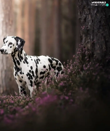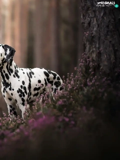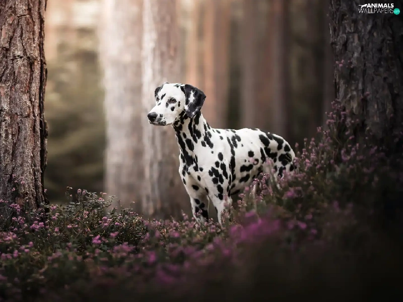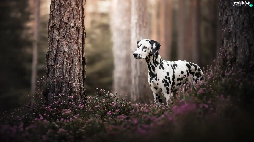 forest, dog, trees, Flowers, Stems, Dalmatian