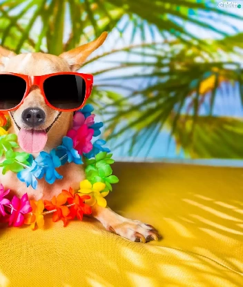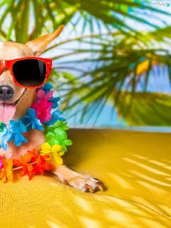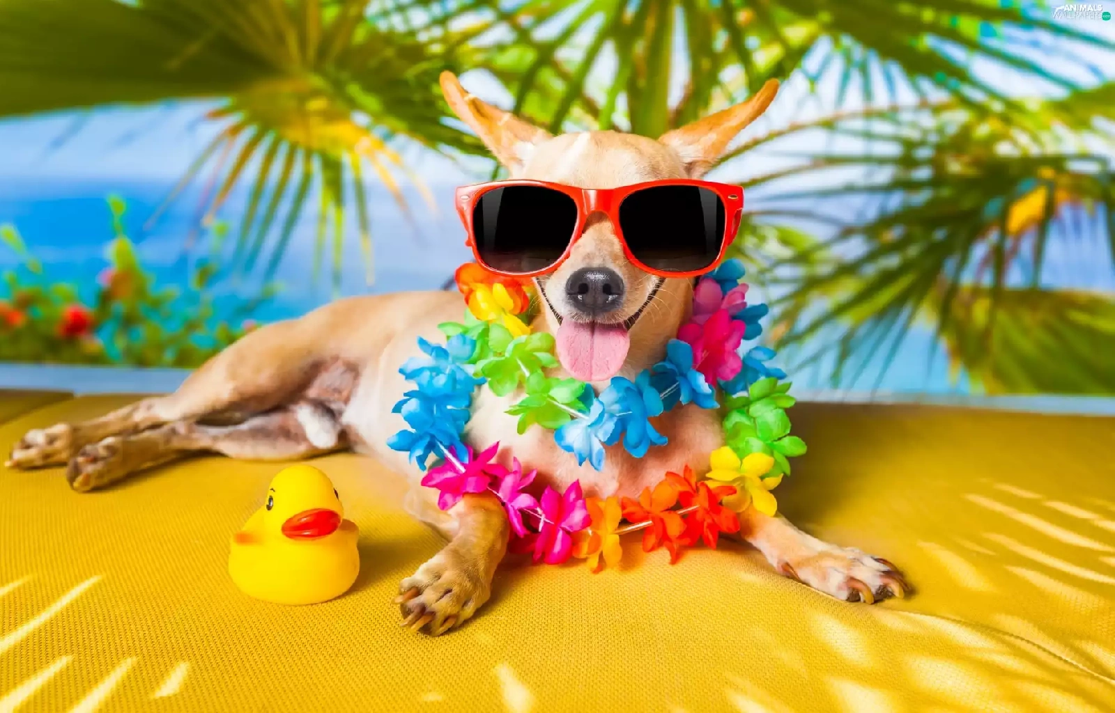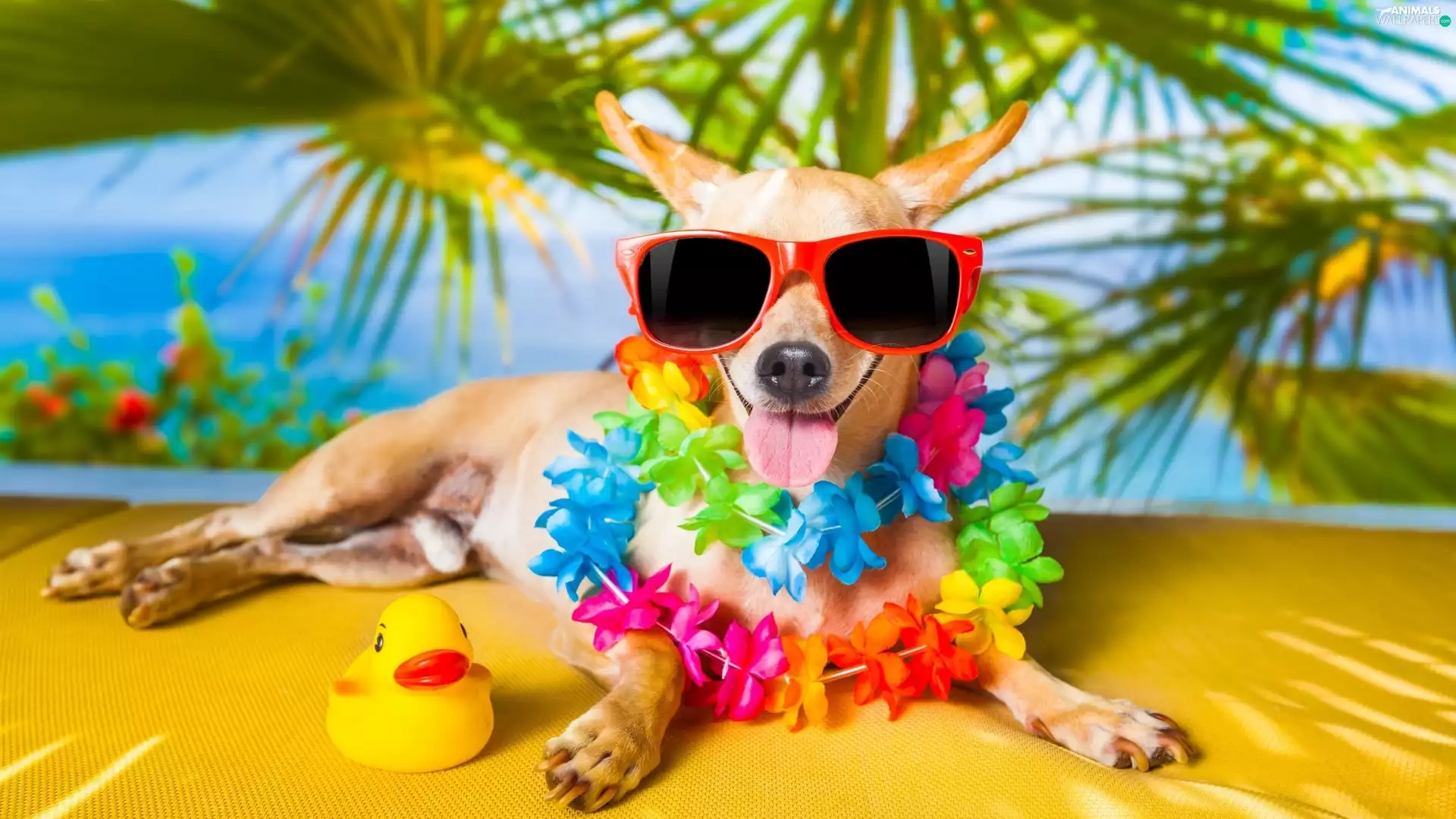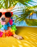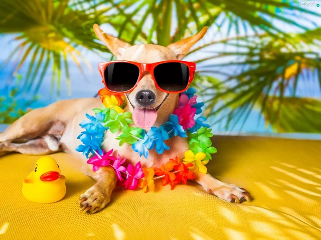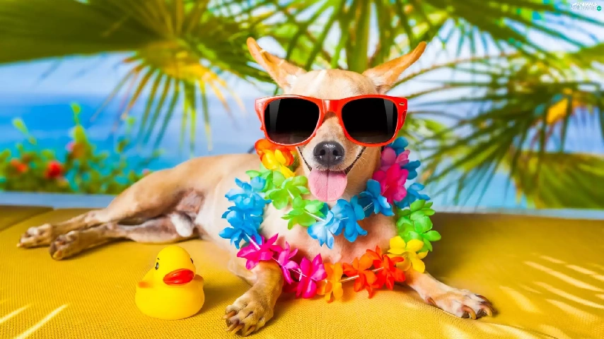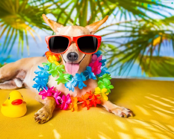 Flowers, Short-haired Chihuahua, holiday, Glasses, dog, Palms, Funny