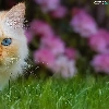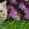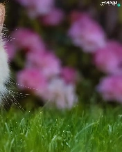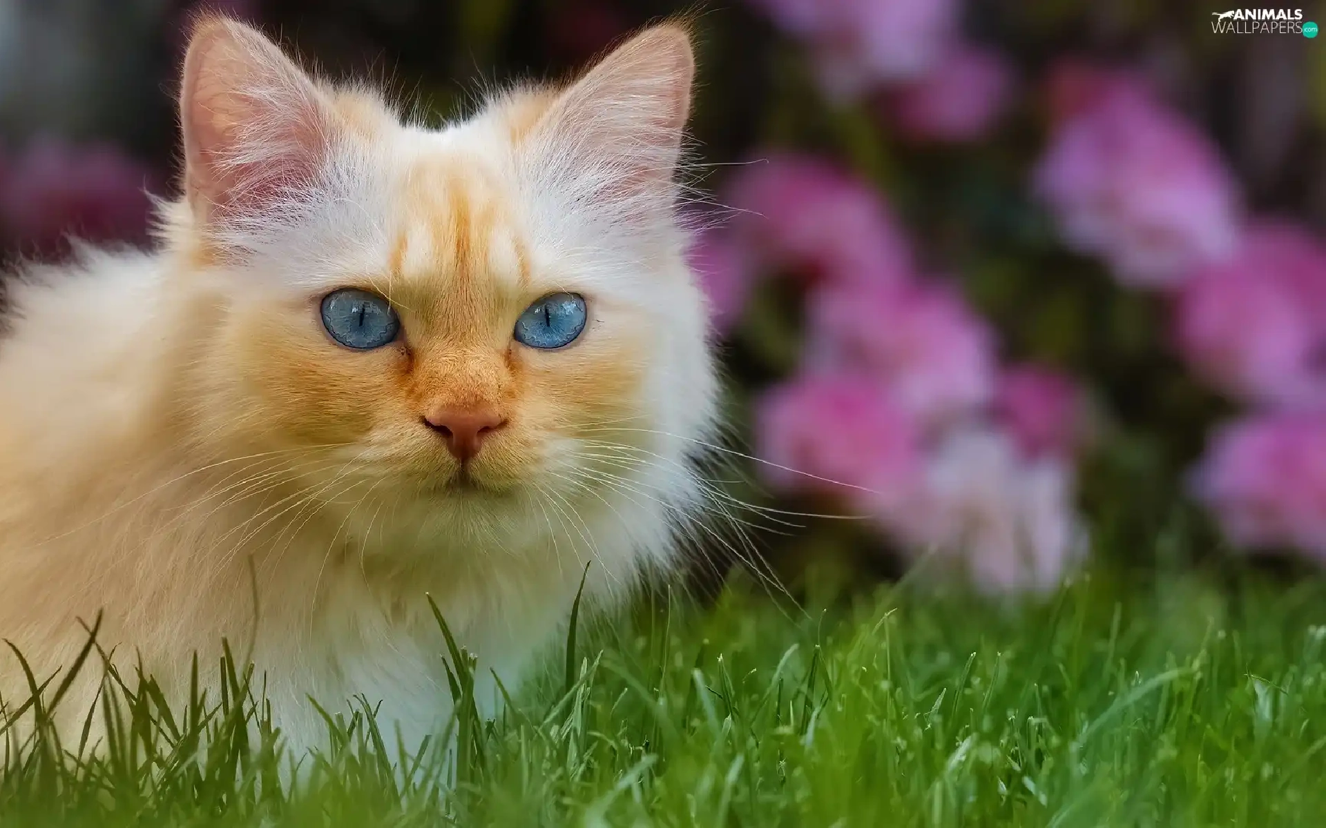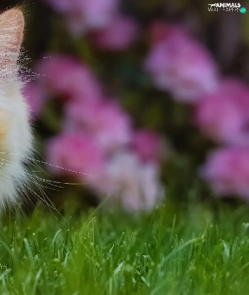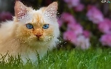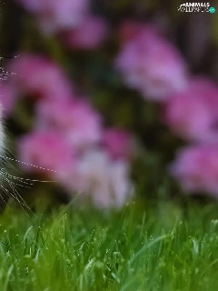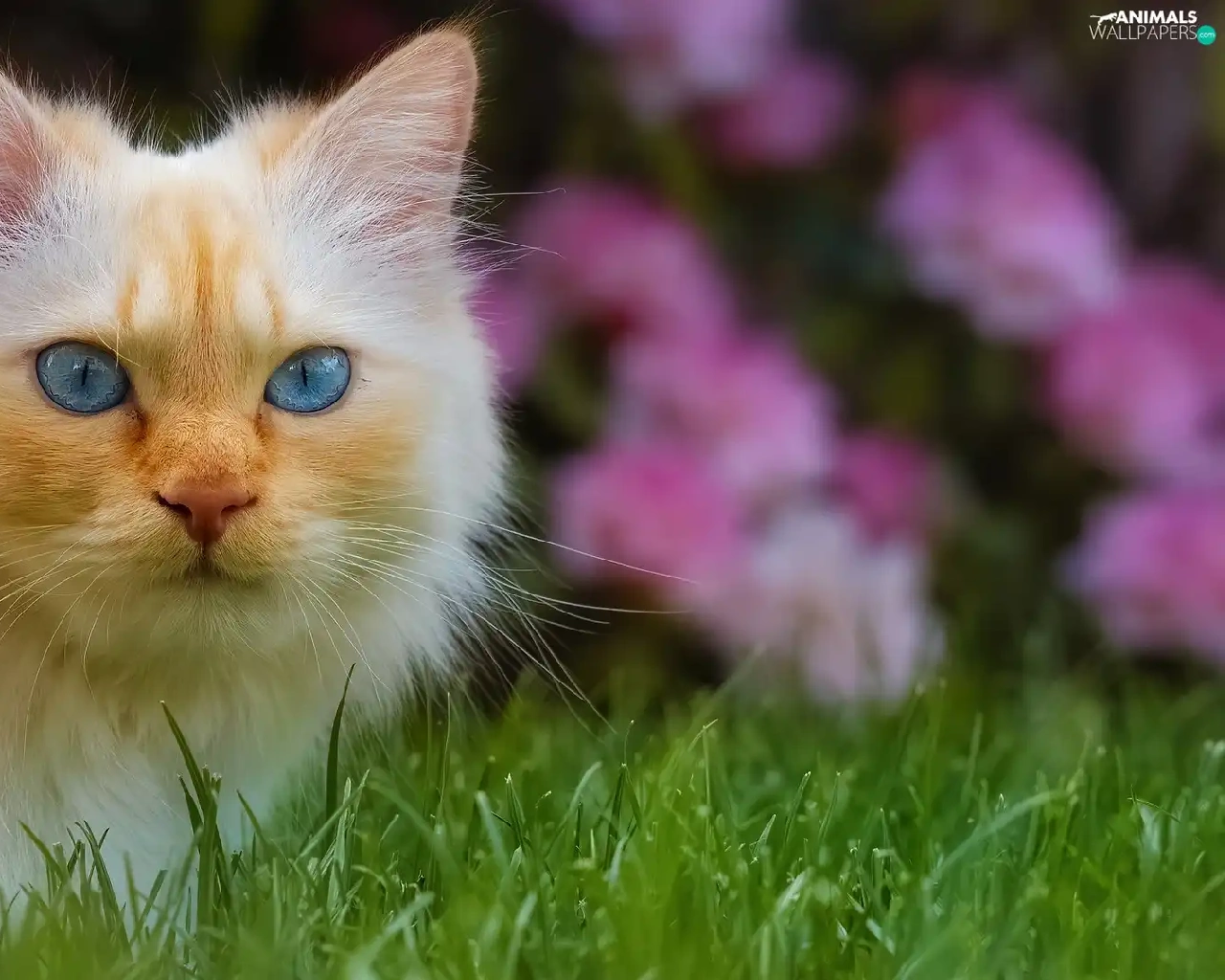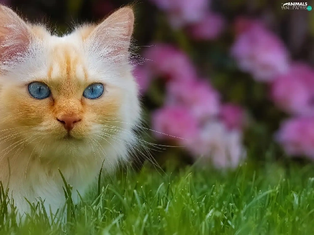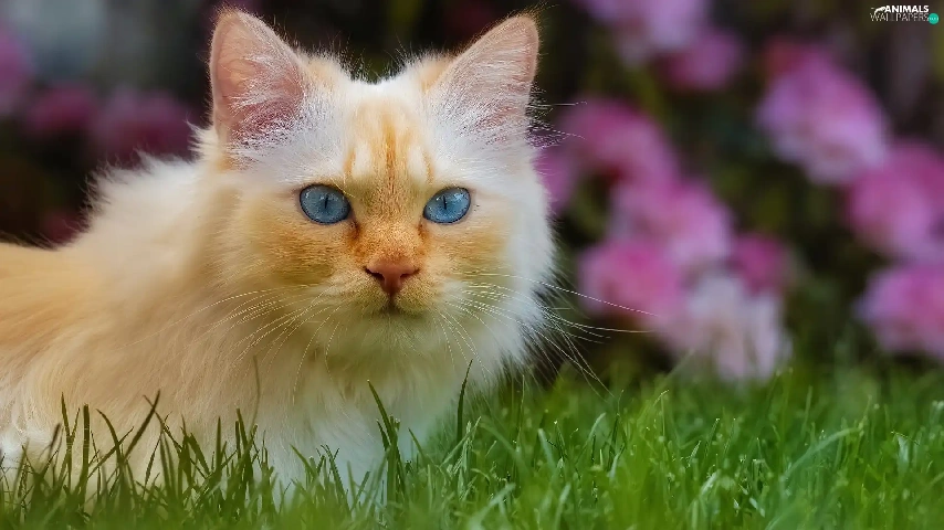 cat, Blue Eyed, Flowers, Pink, grass, Longhaired