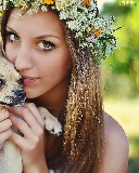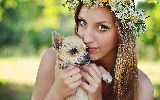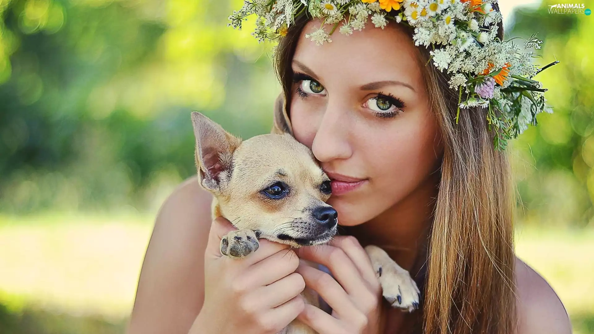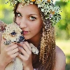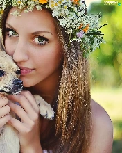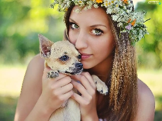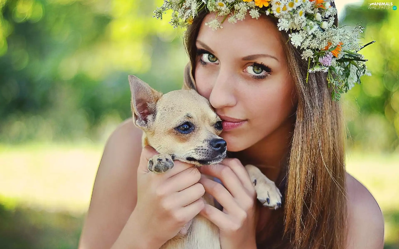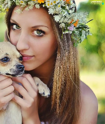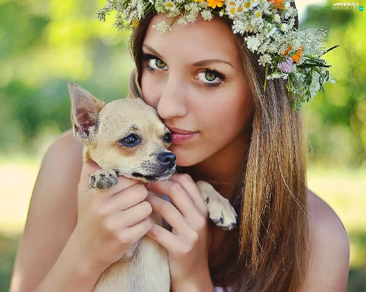 doggy, Women, wreath, Flowers, Puppy, face