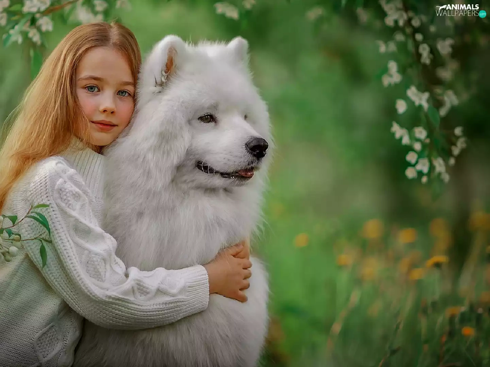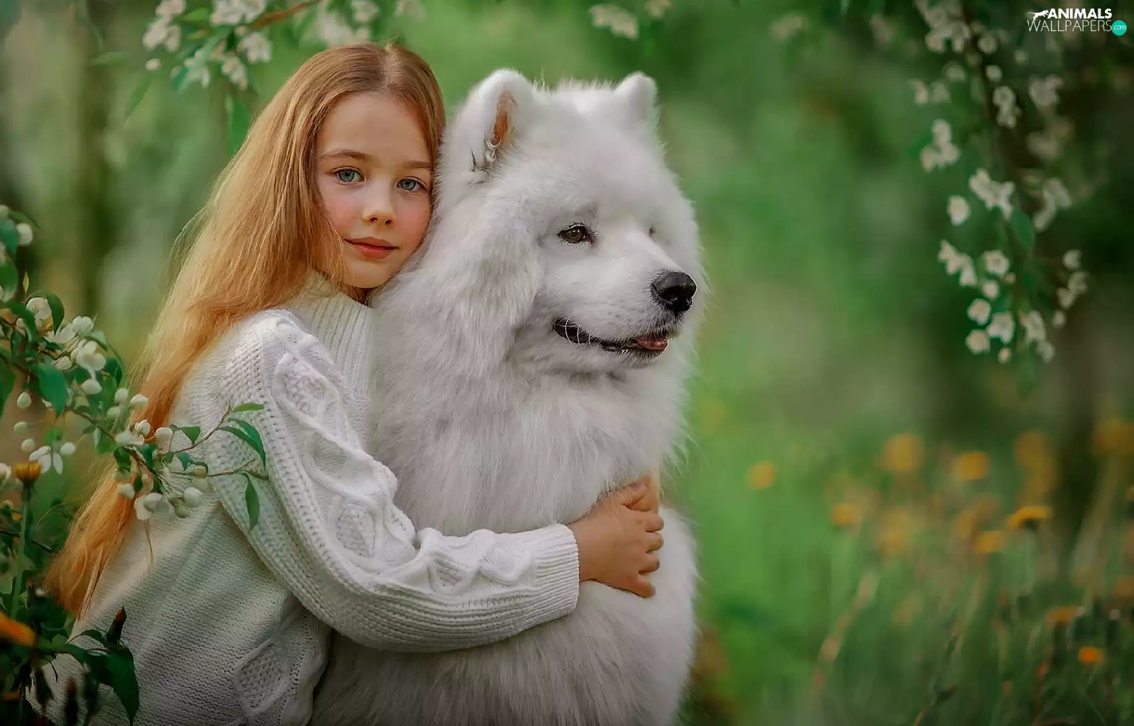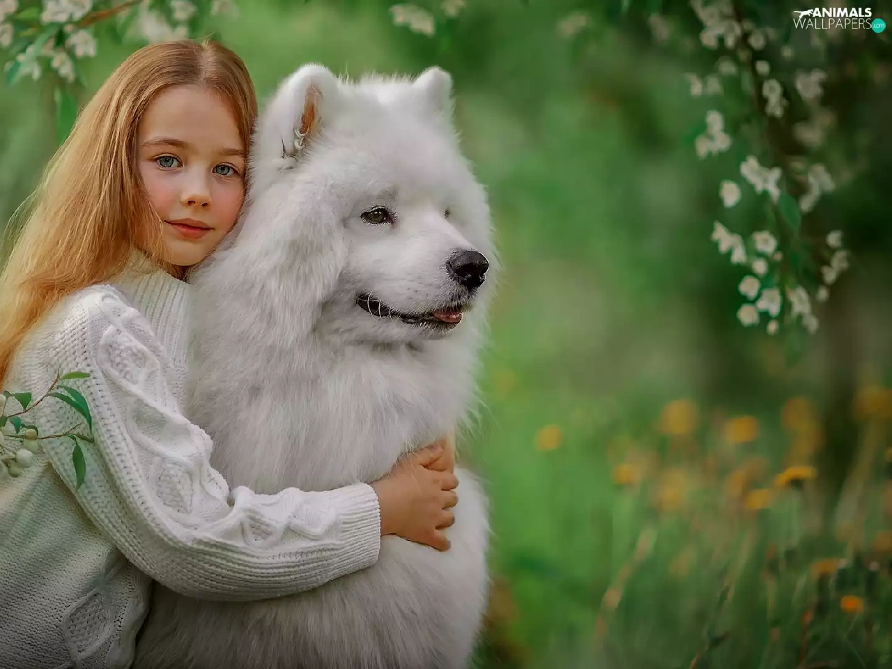 dog, redhead, Twigs, Flowers, Samojed, girl