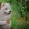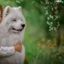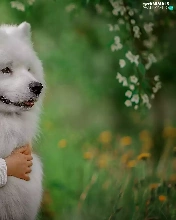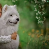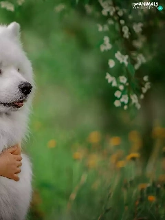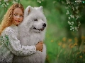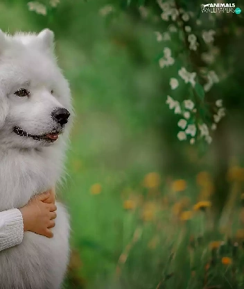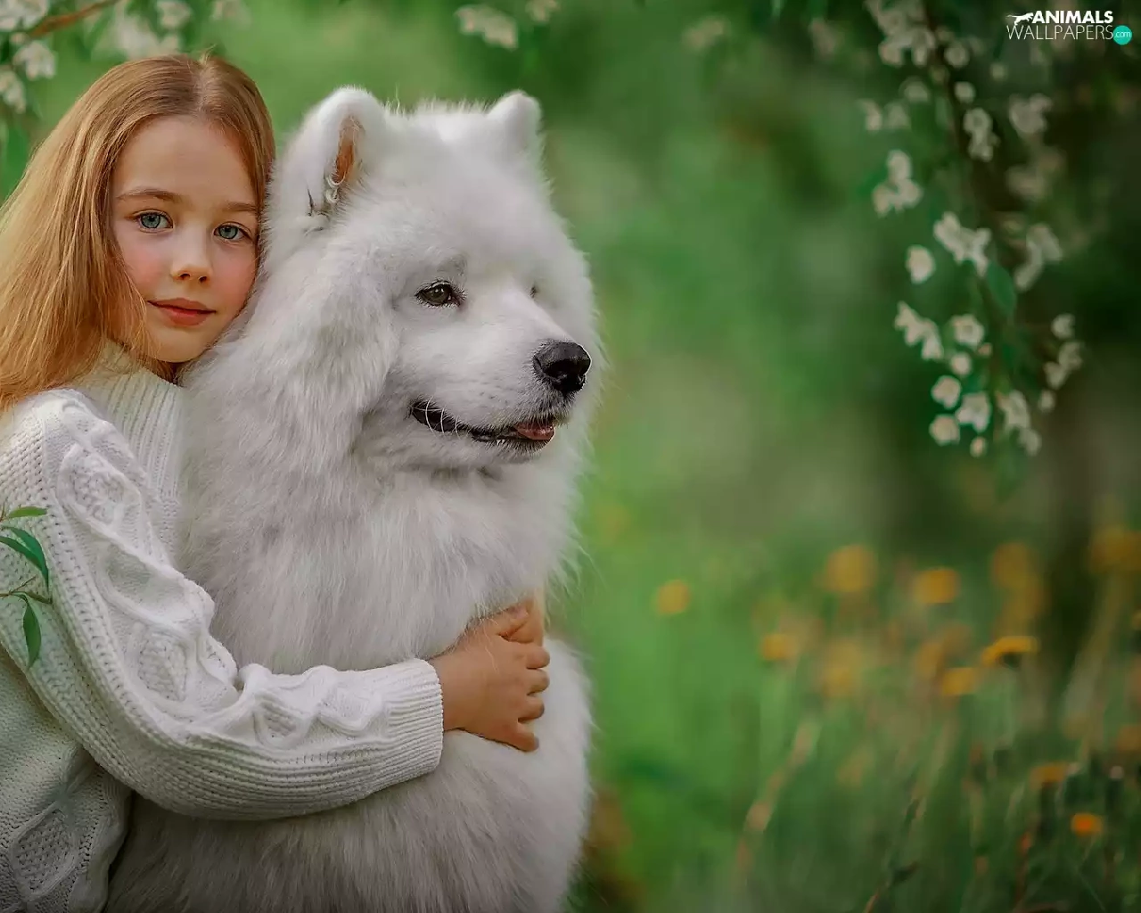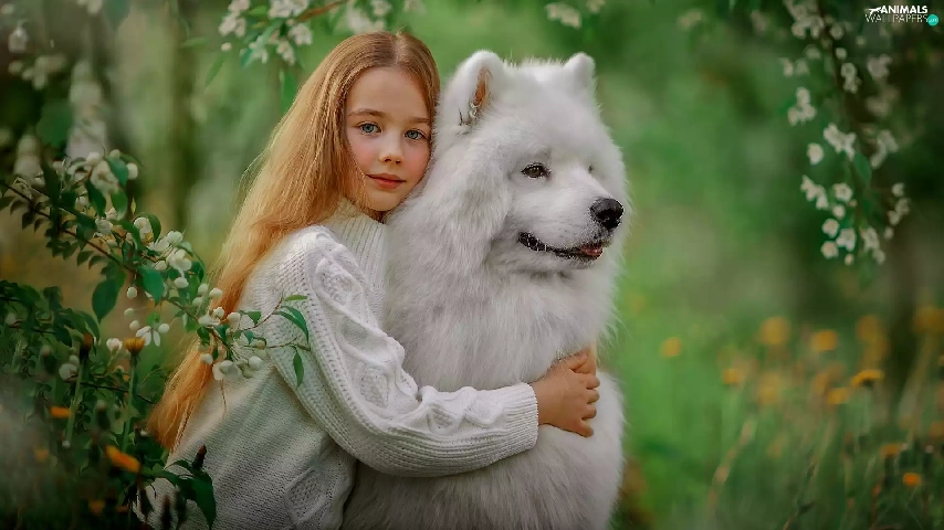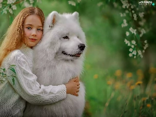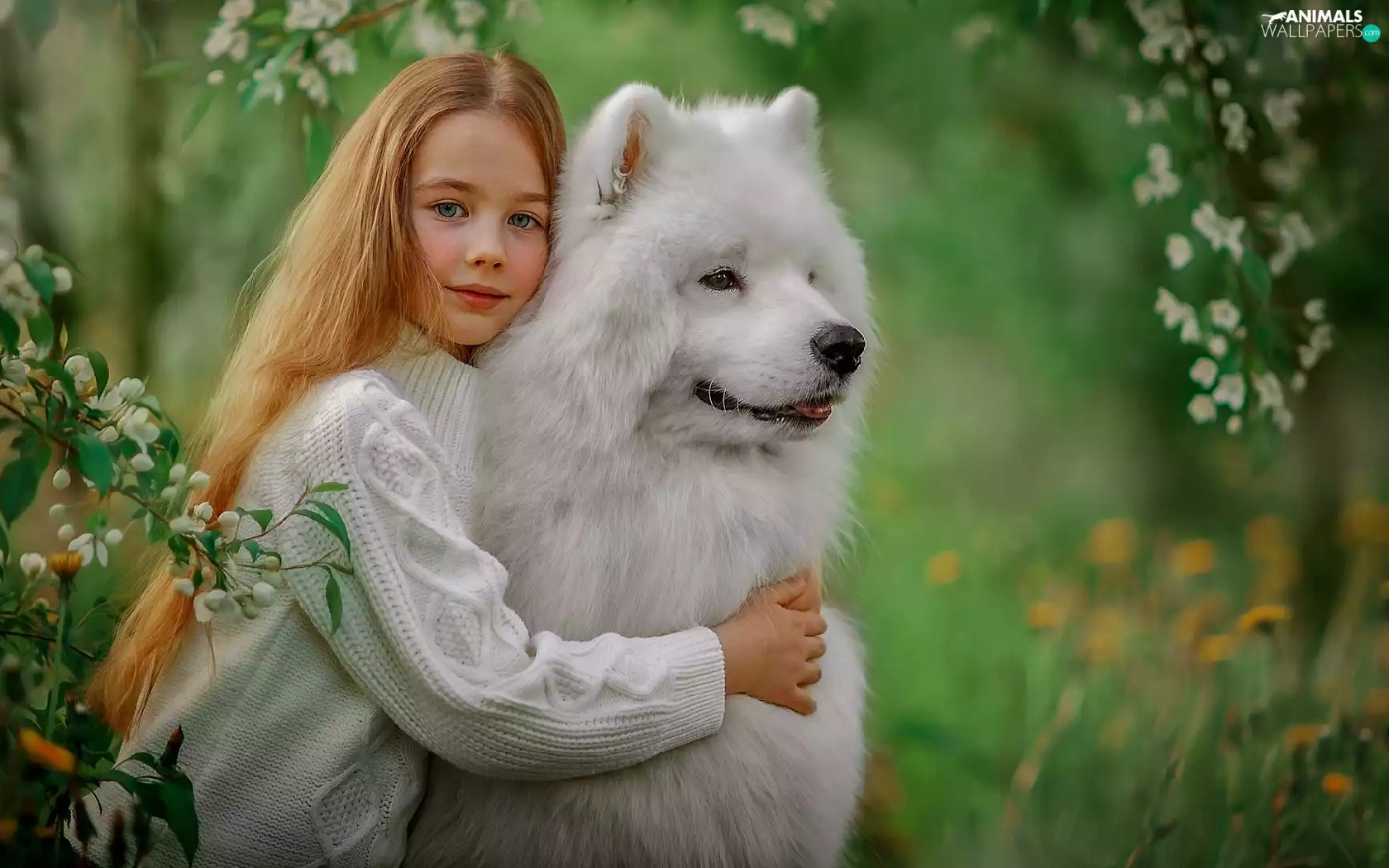 dog, redhead, Twigs, Flowers, Samojed, girl