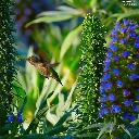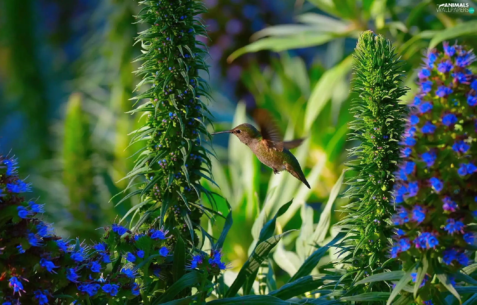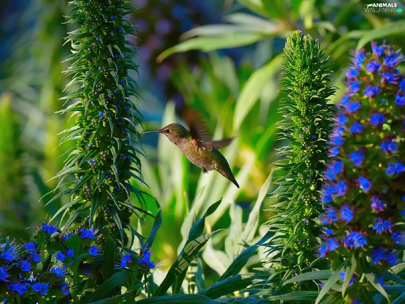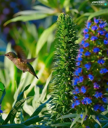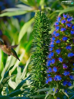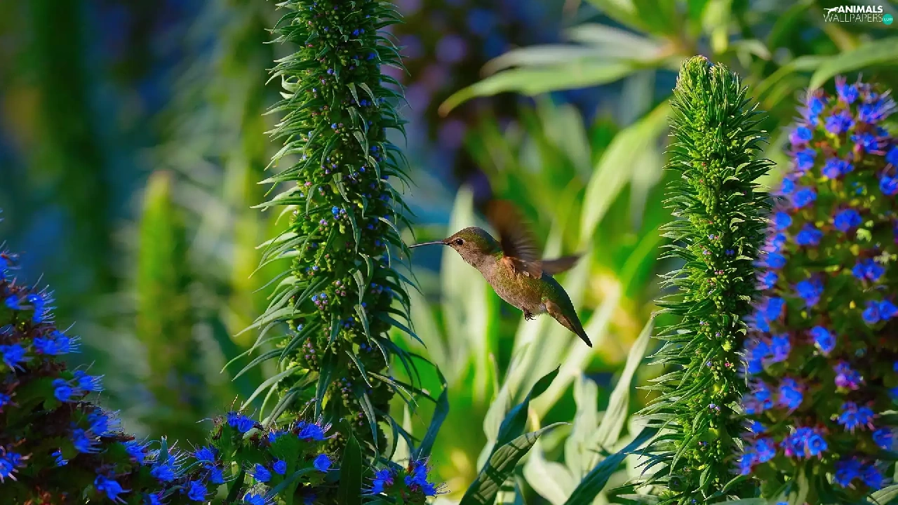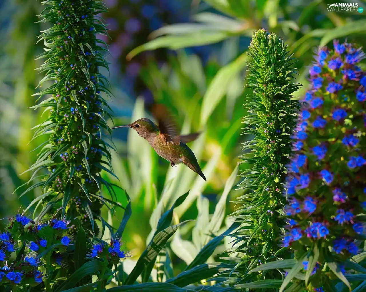 humming-bird, Blue, Flowers