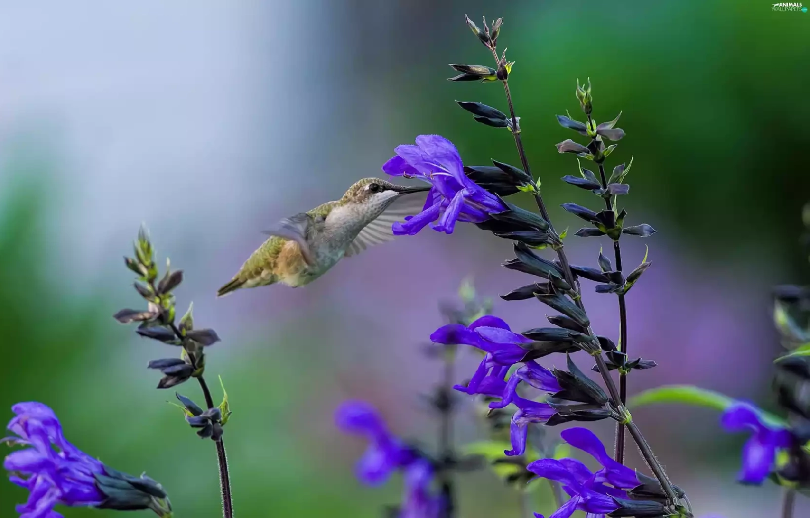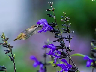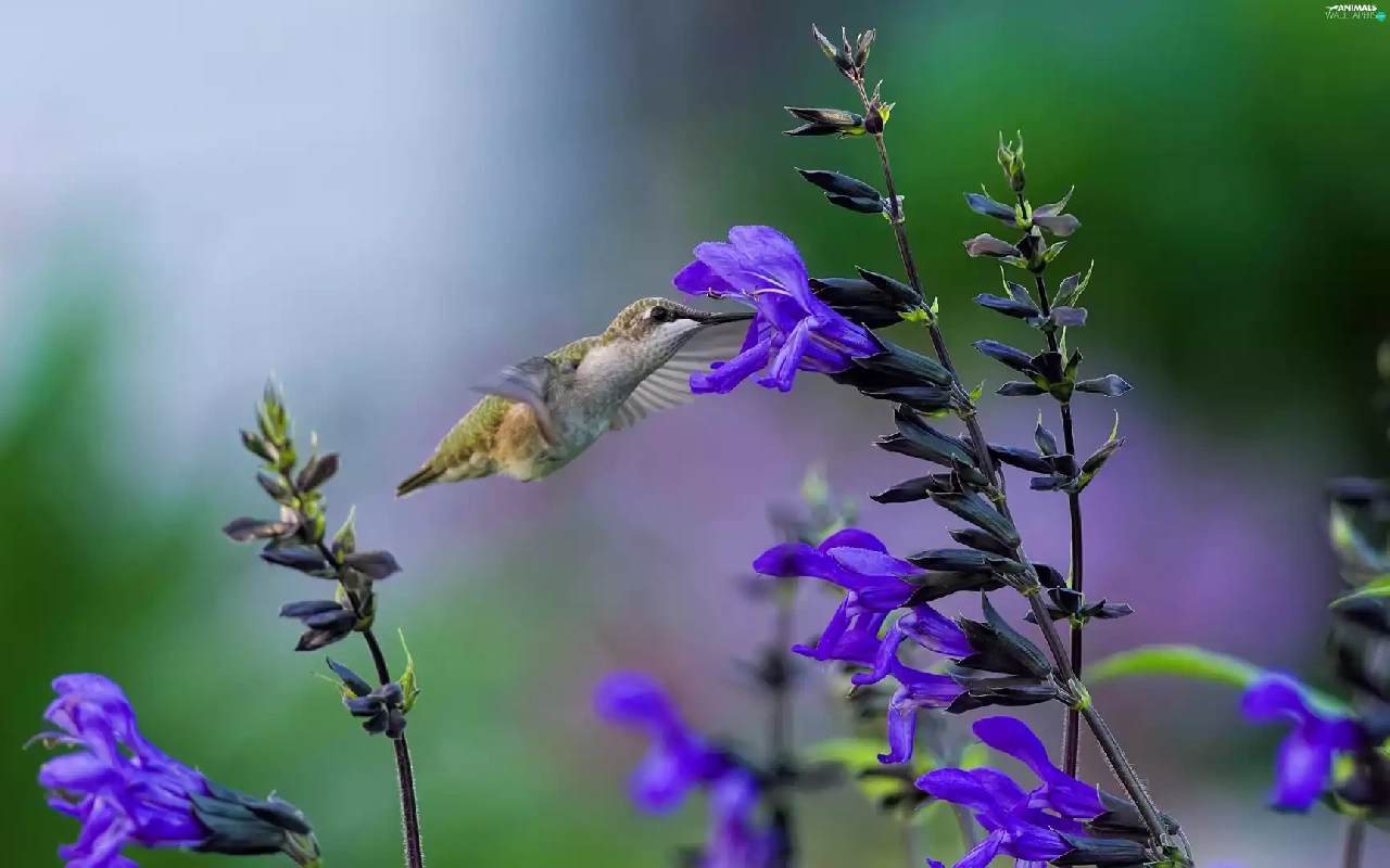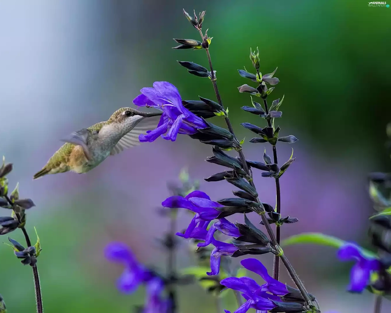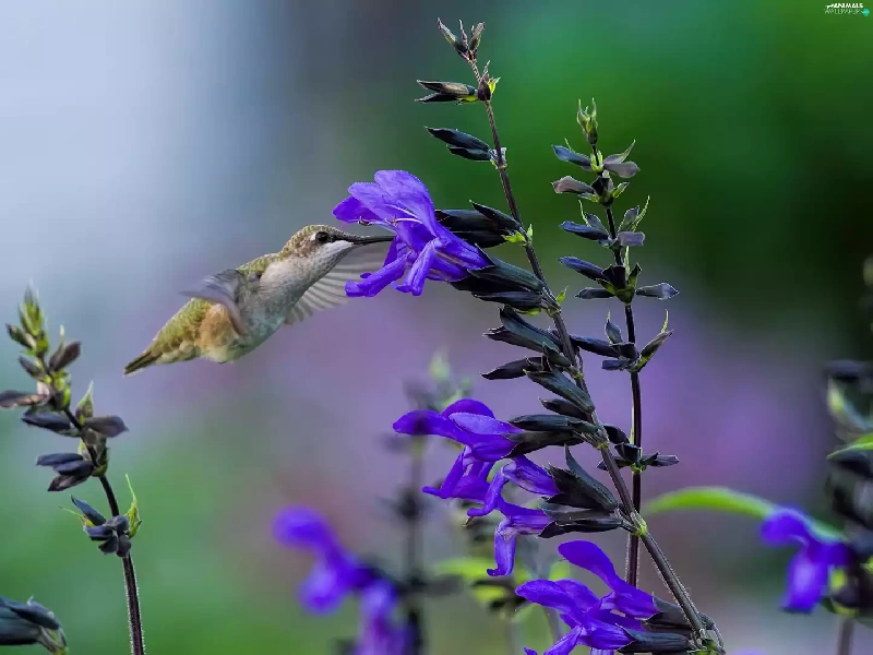 humming-bird, Blue, Flowers