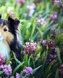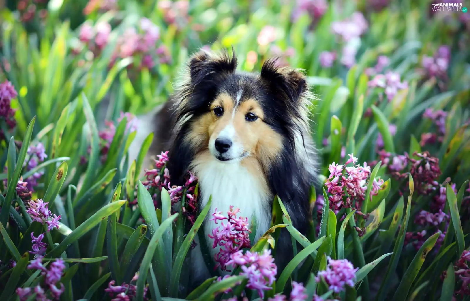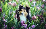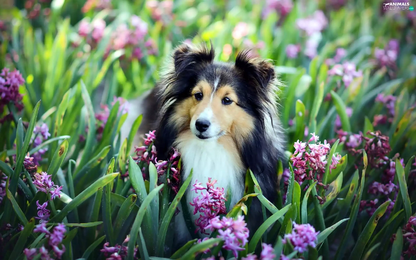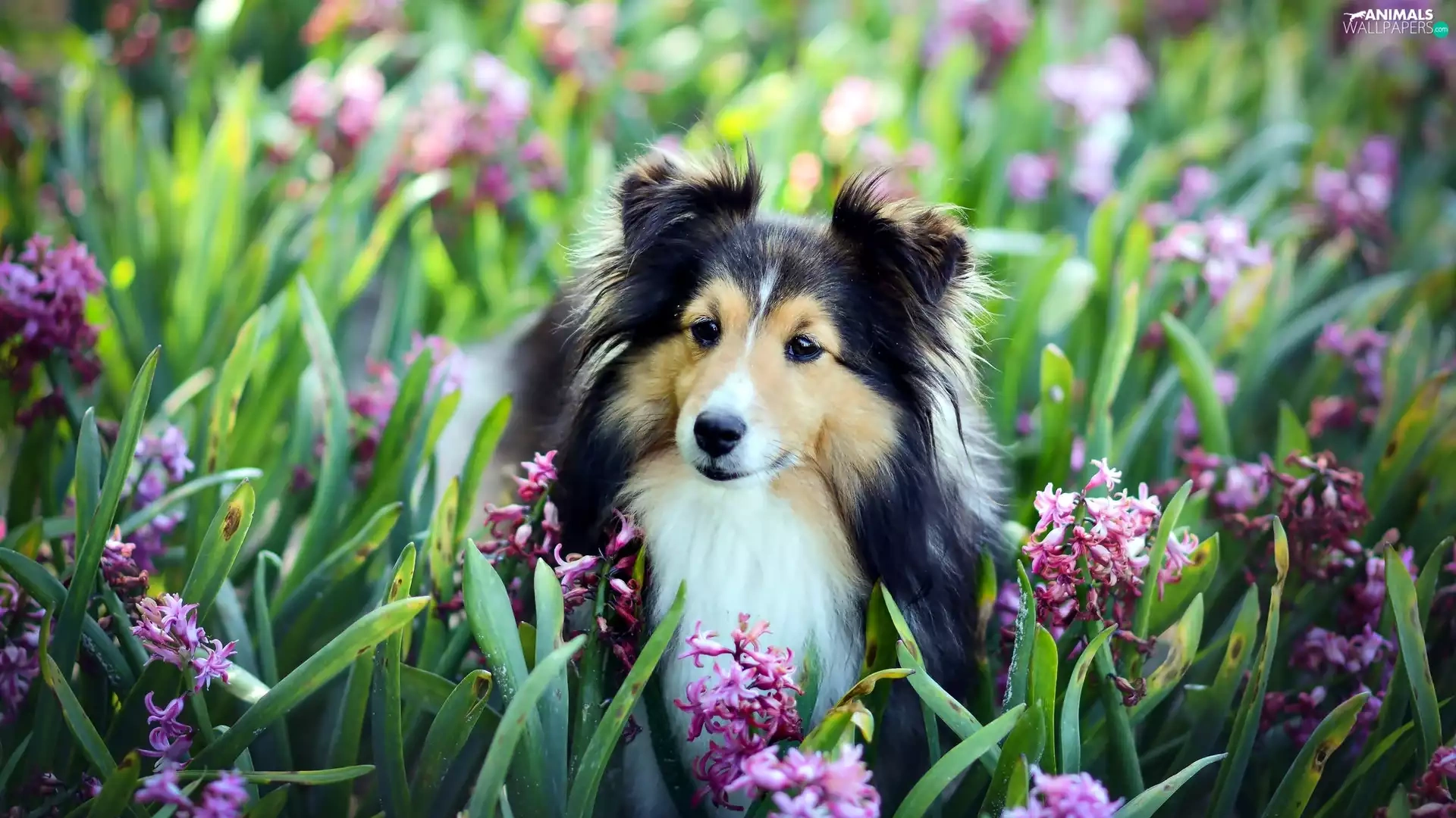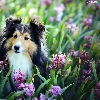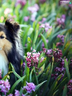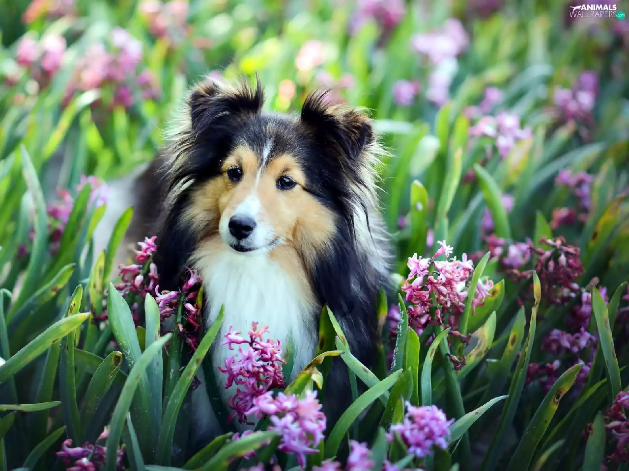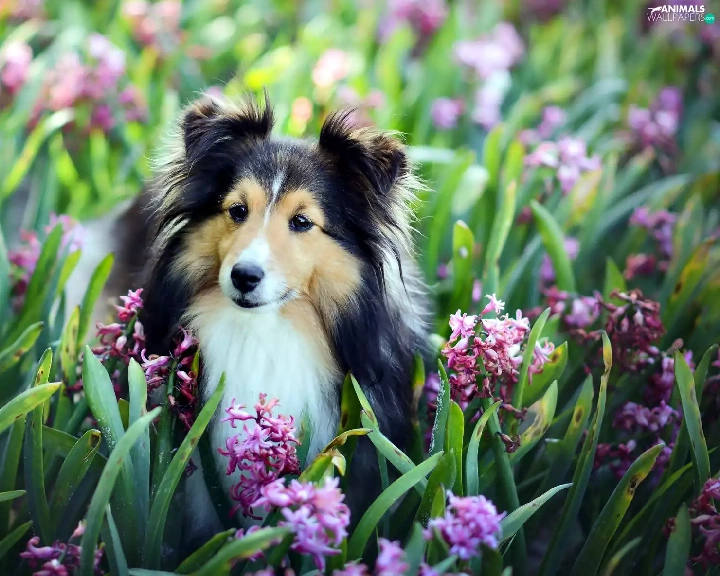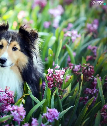 Hyacinths, shetland Sheepdog, Flowers