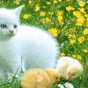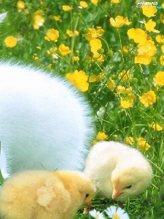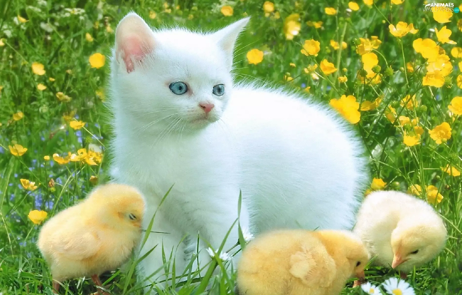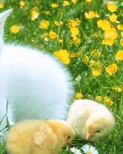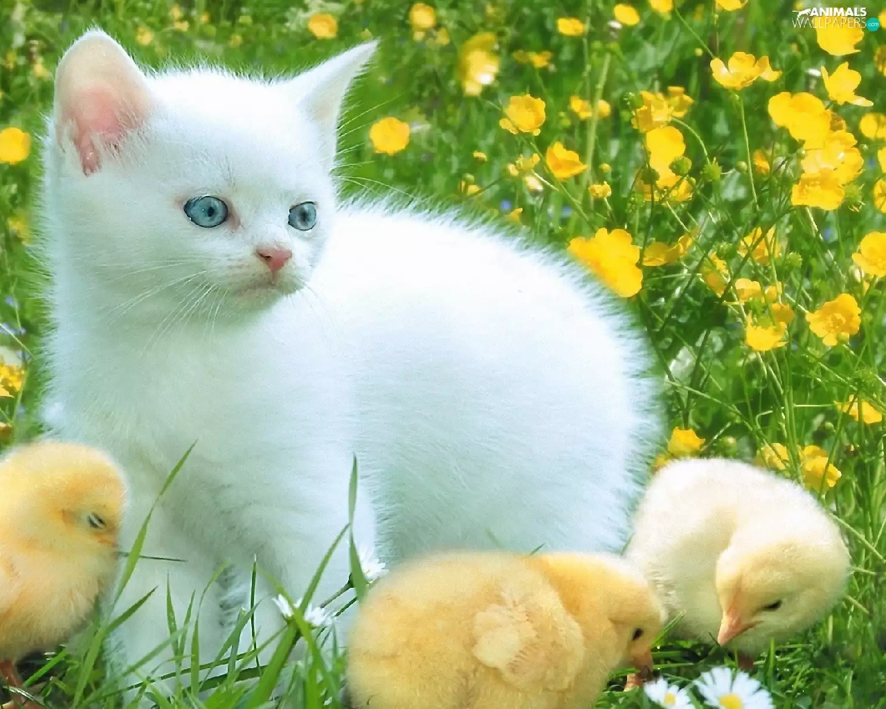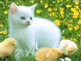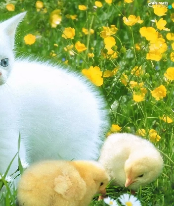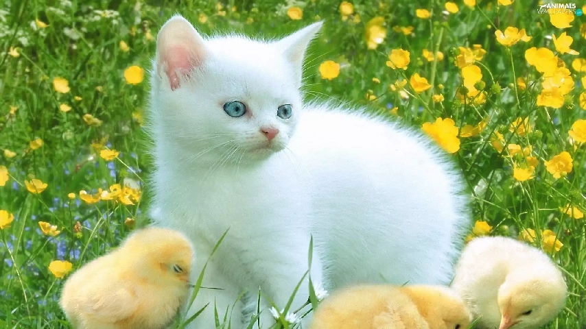 Three, White, Meadow, Flowers, chickens, kitten
