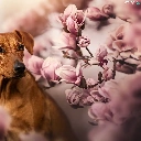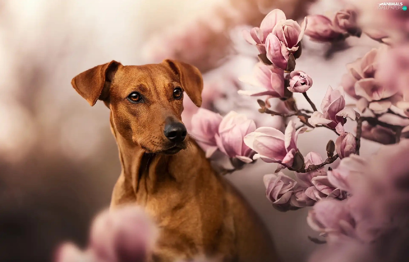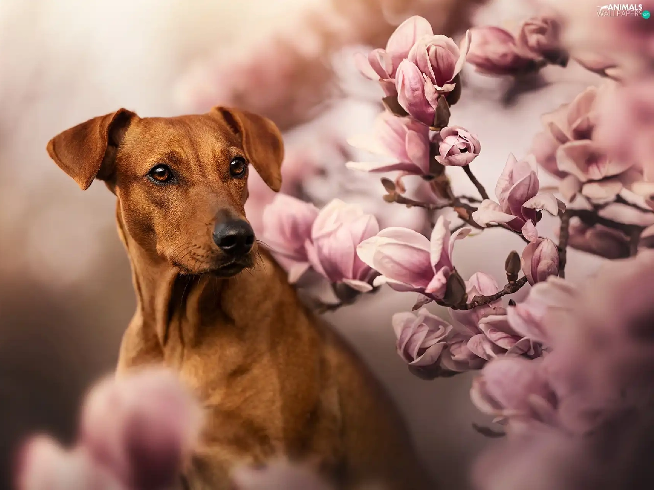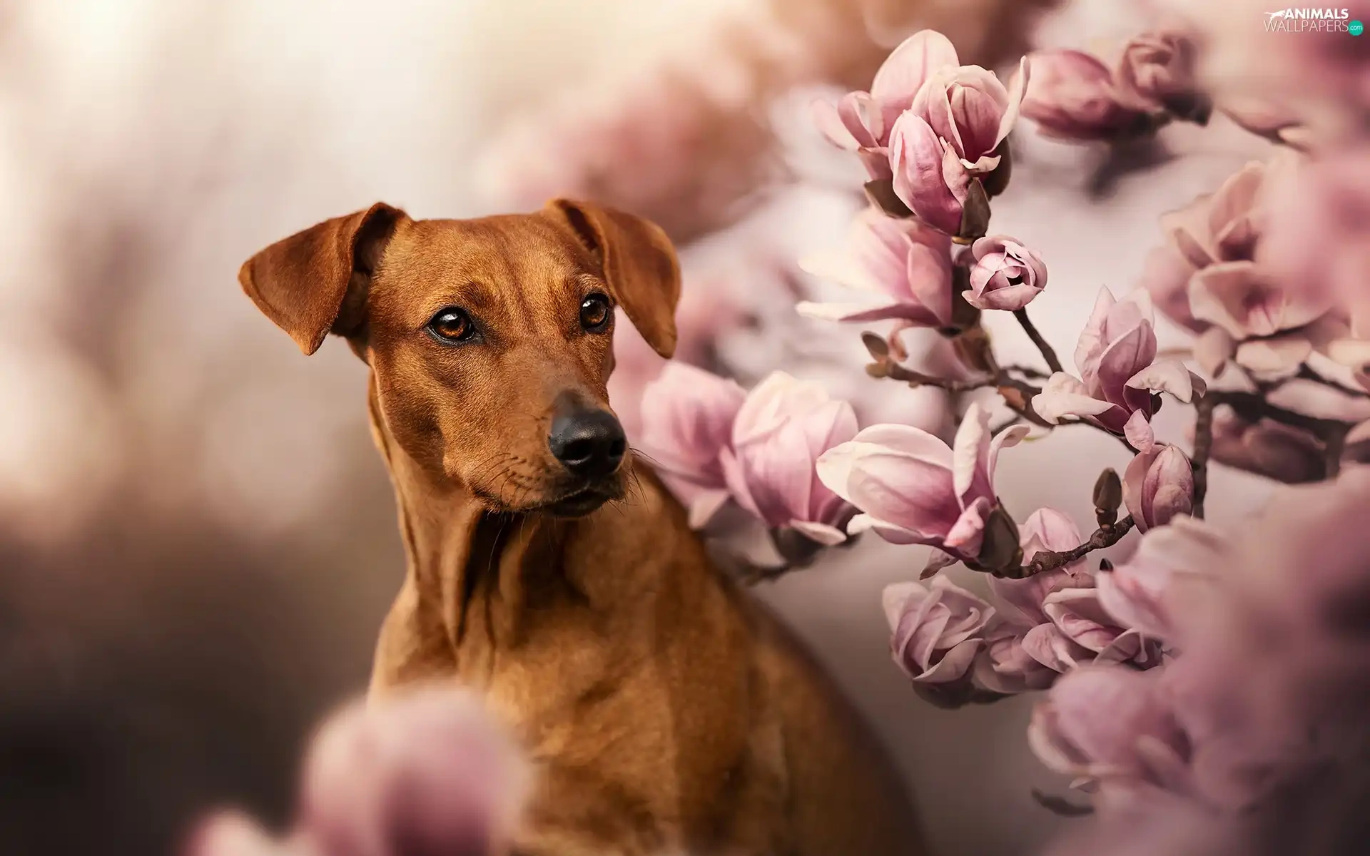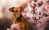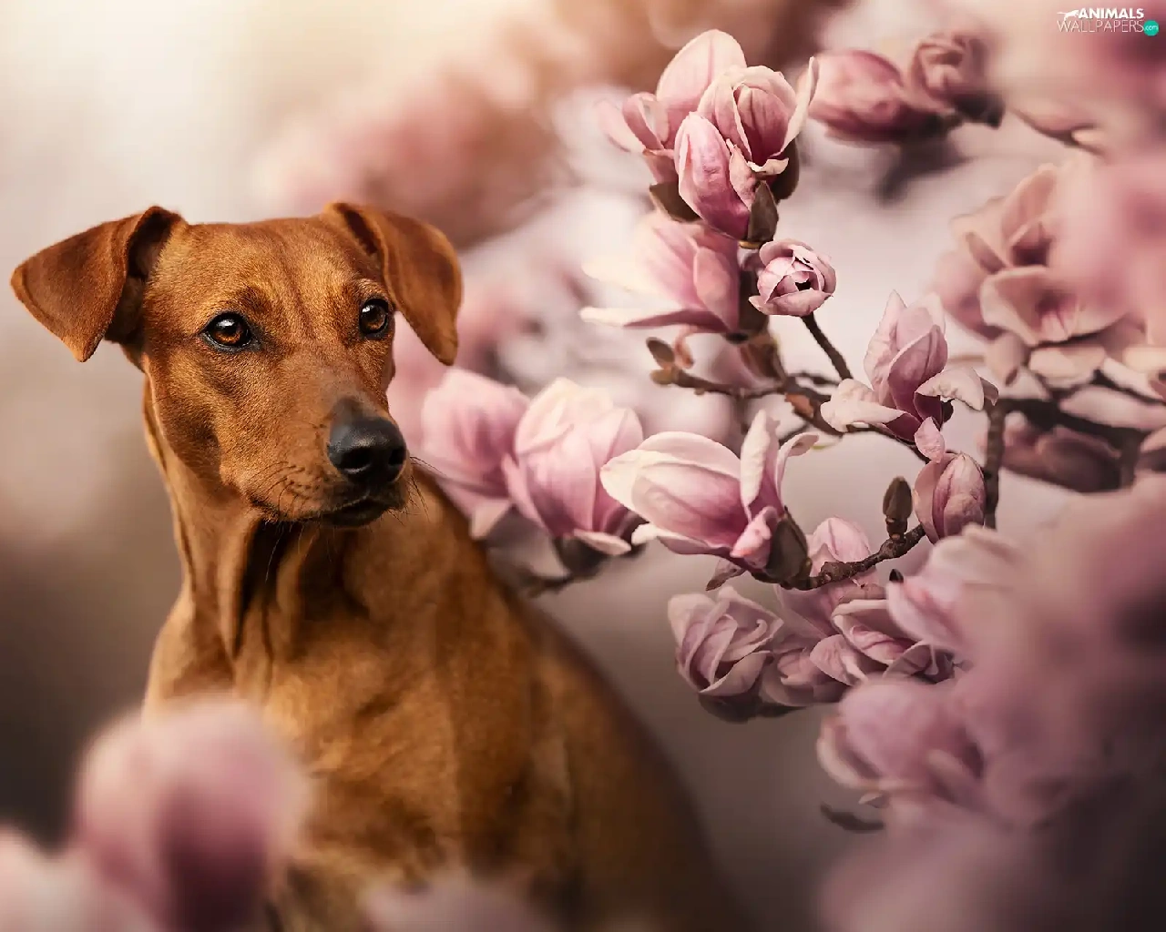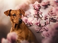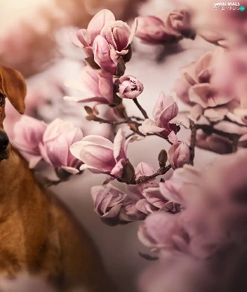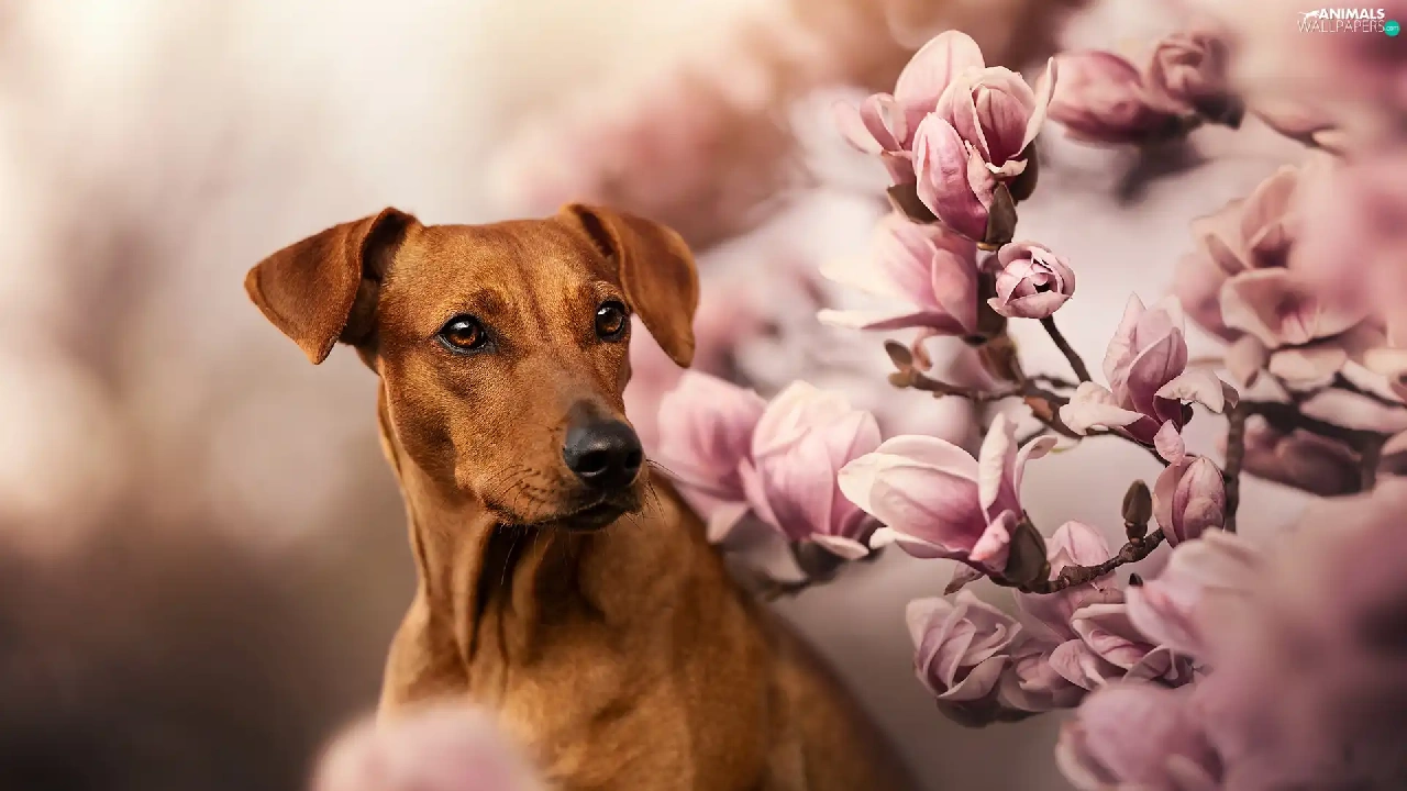 dog, Flowers, Magnolias, Rhodesian ridgeback