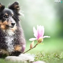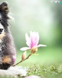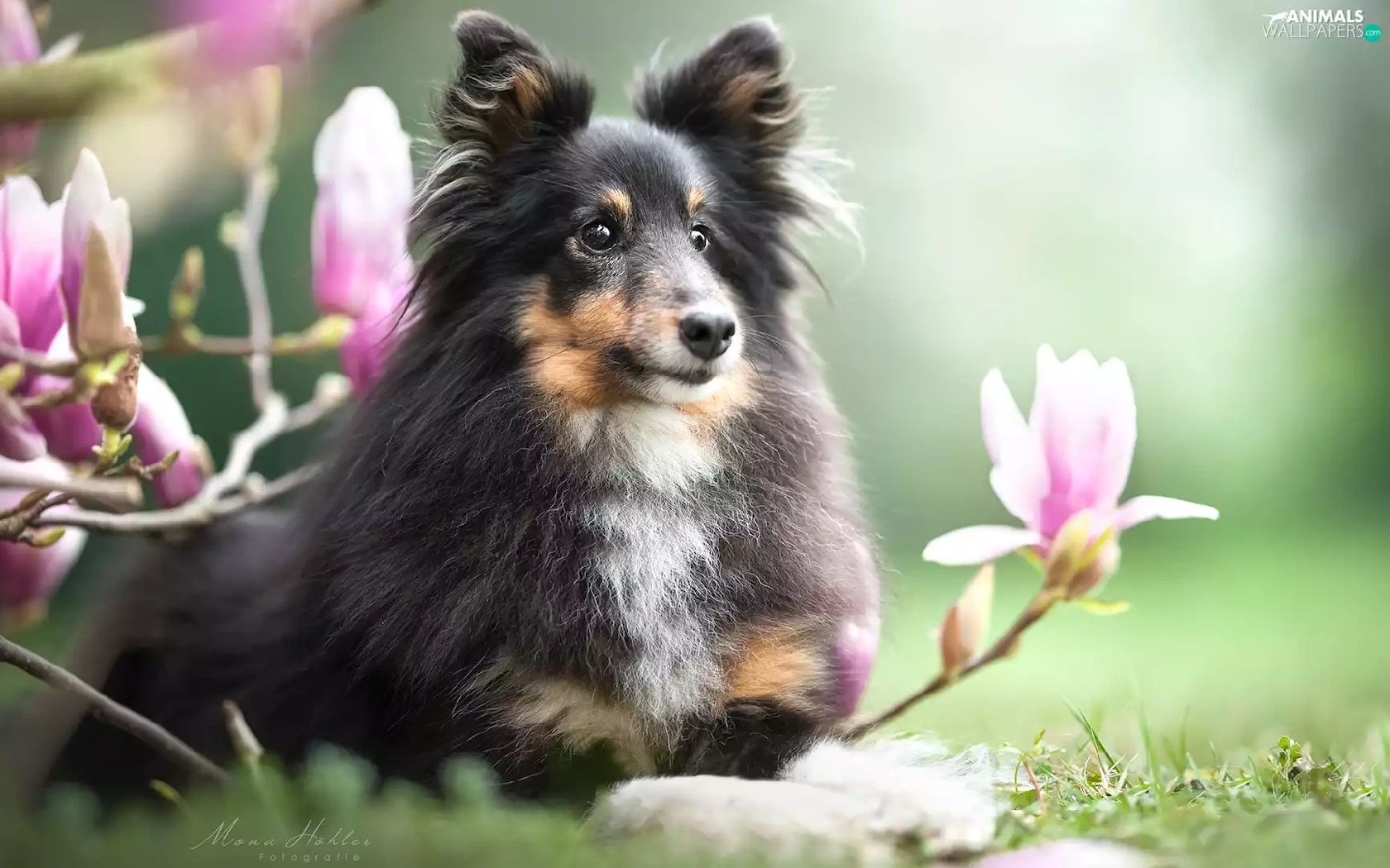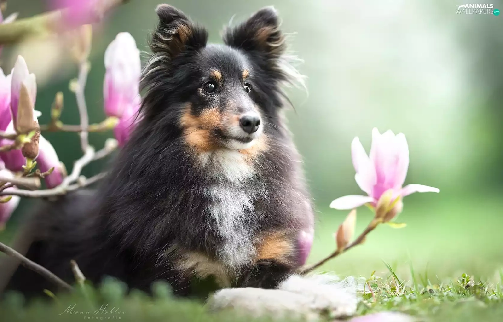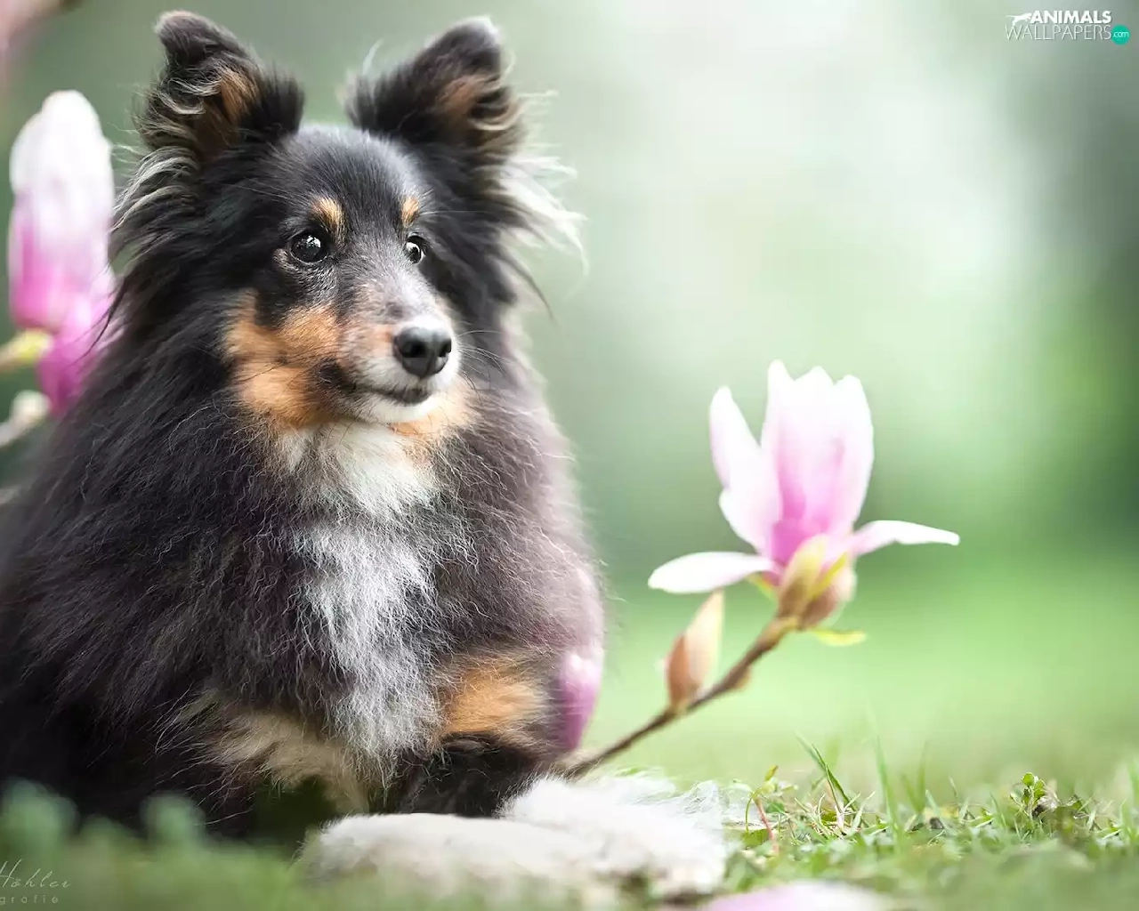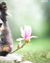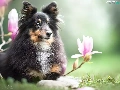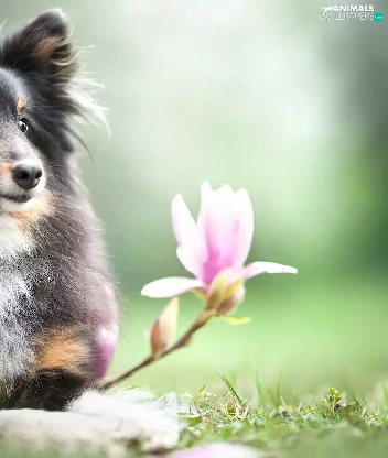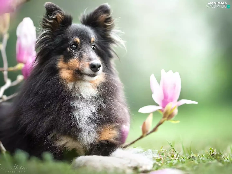 dog, Flowers, Magnolias, shetland Sheepdog