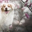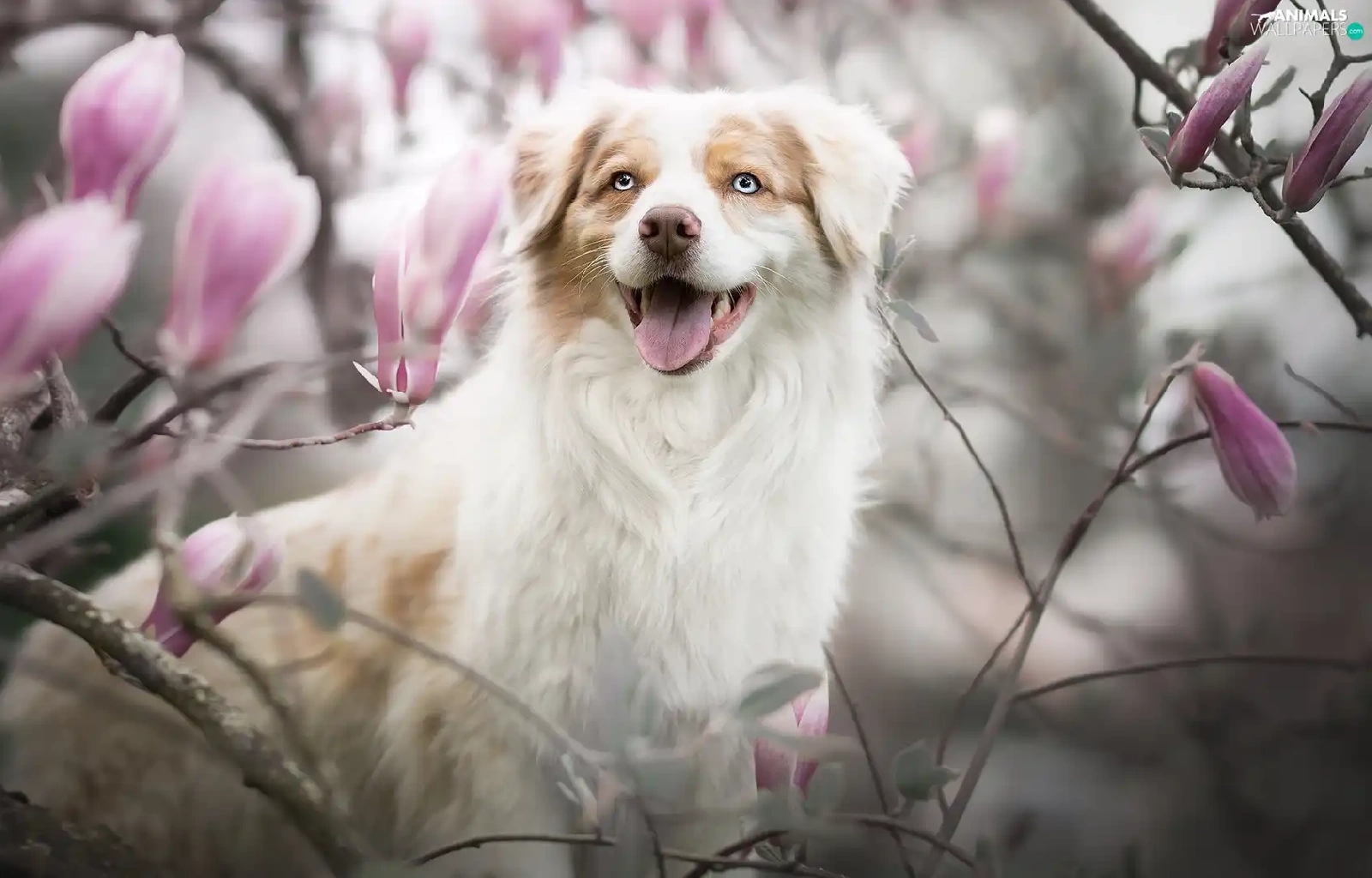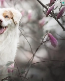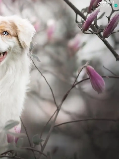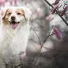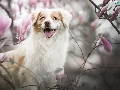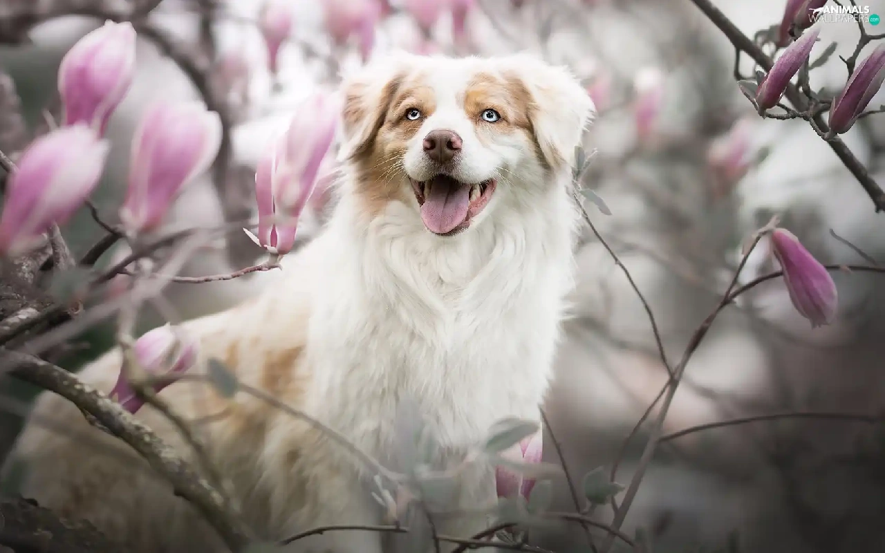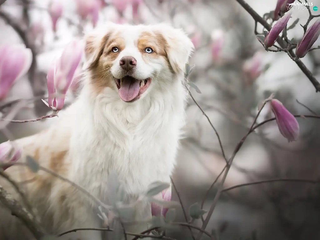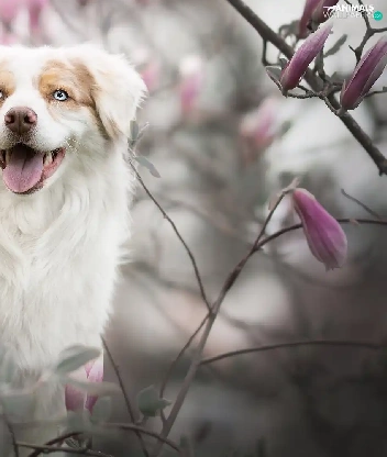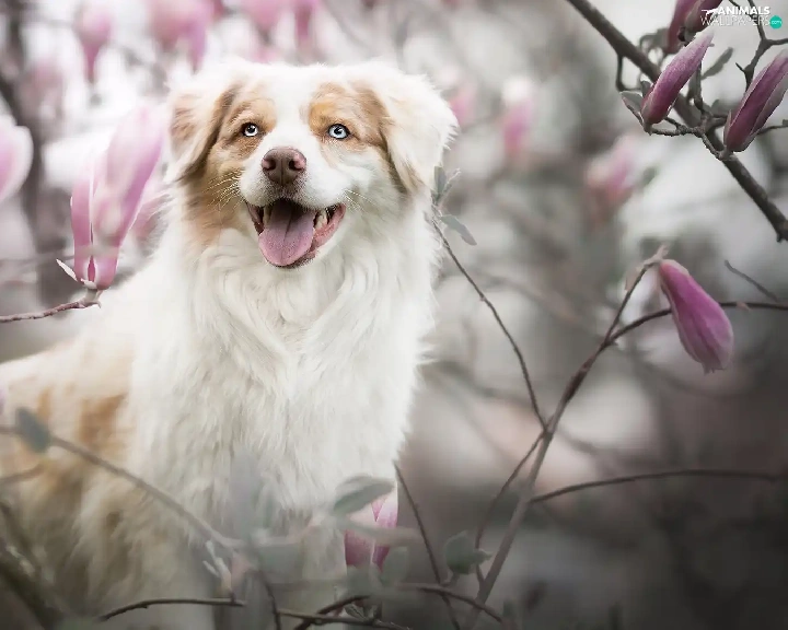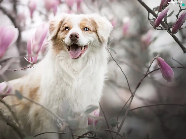 dog, Flowers, Magnolias, Australian Shepherd