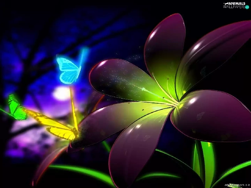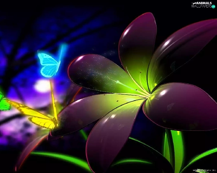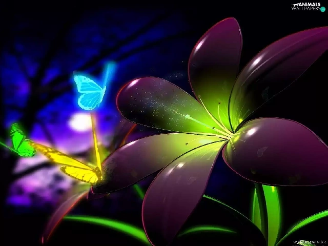 Colourfull Flowers, Neon, 3D, butterflies