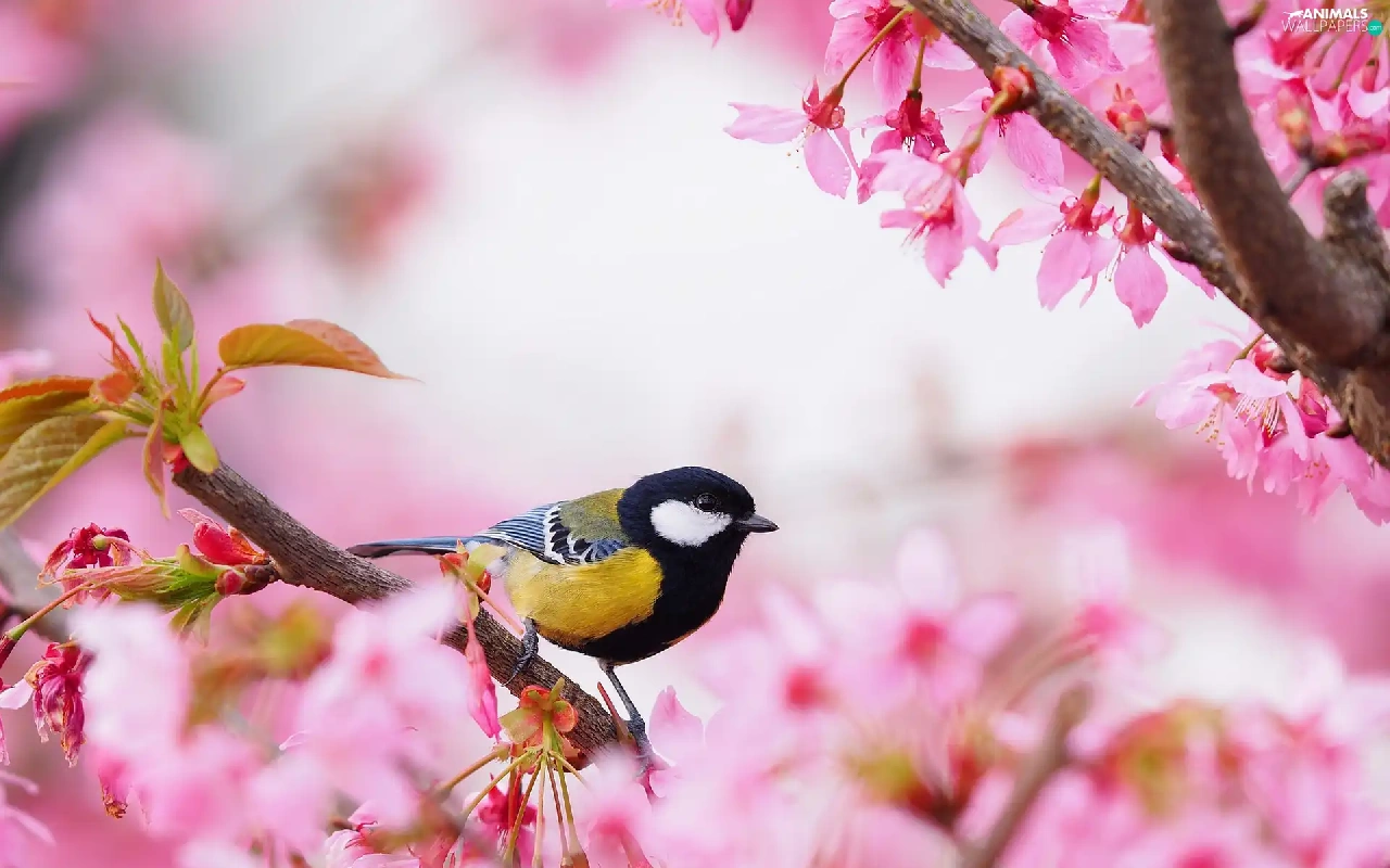 flourishing, tit, Pink, Great Tit, Bird, trees, Flowers