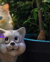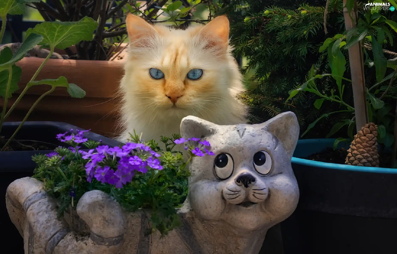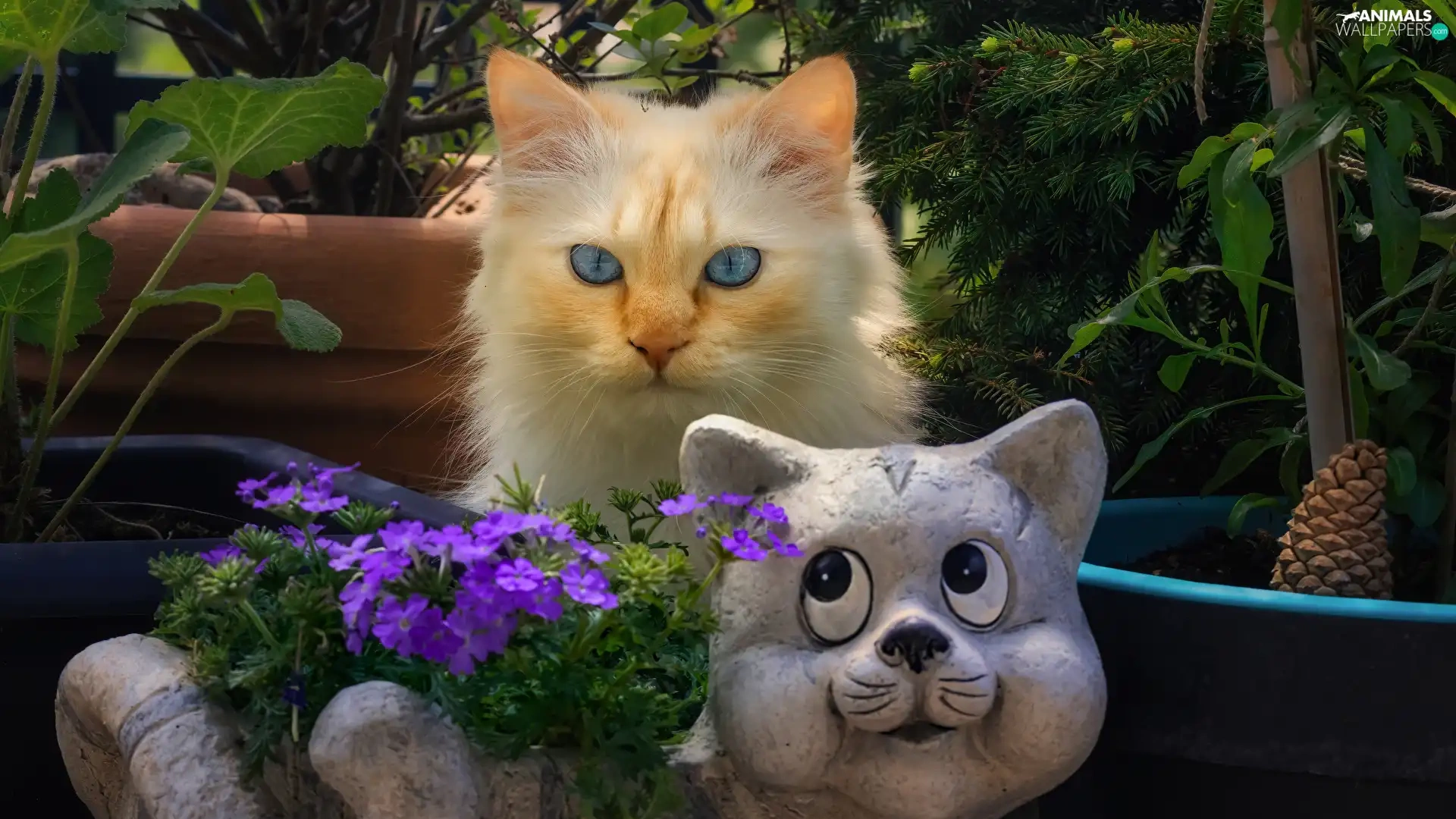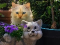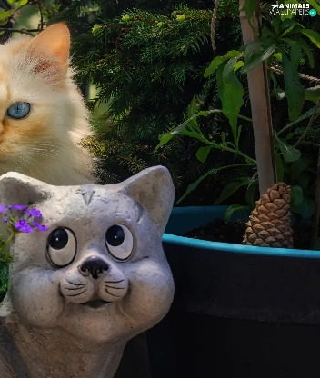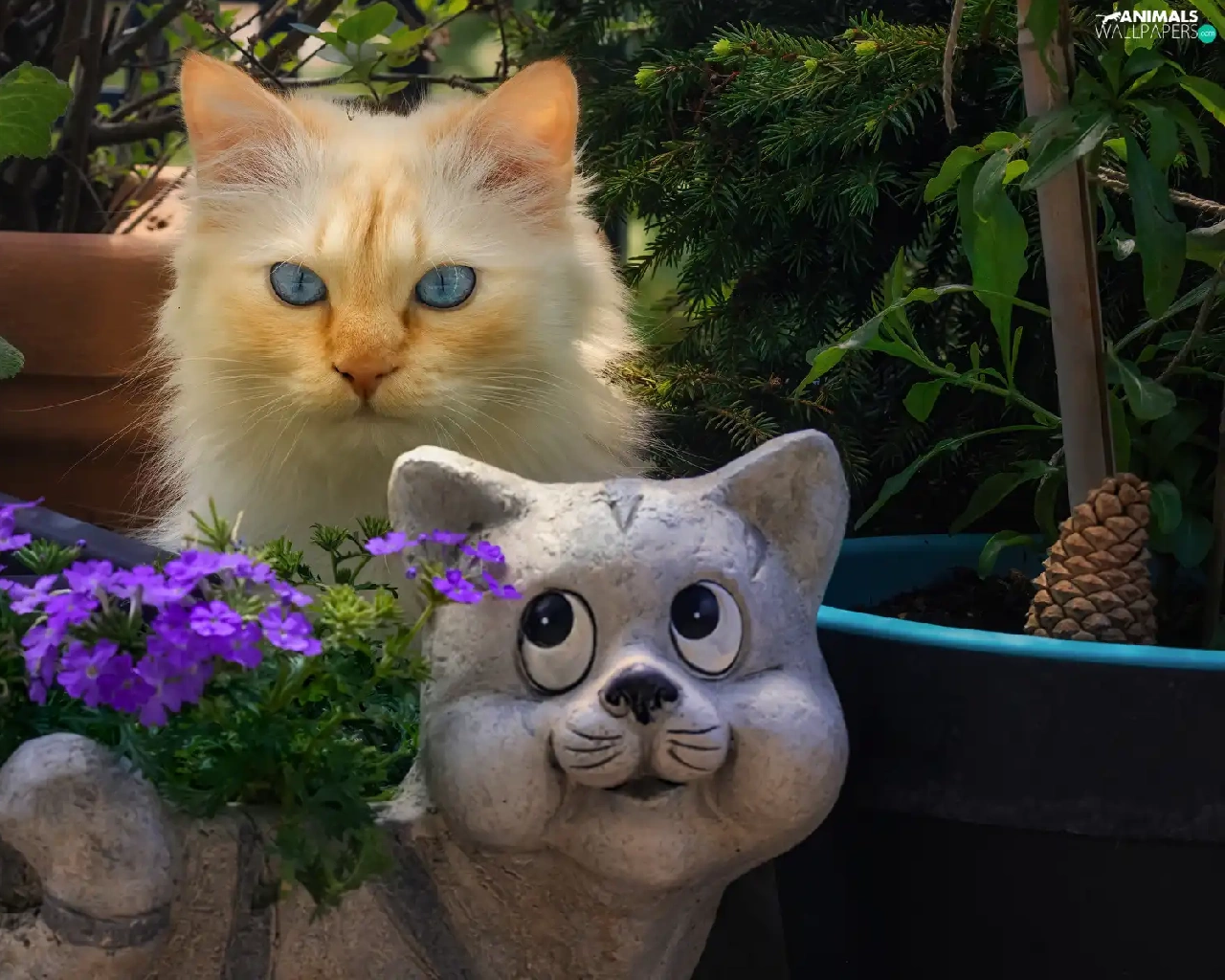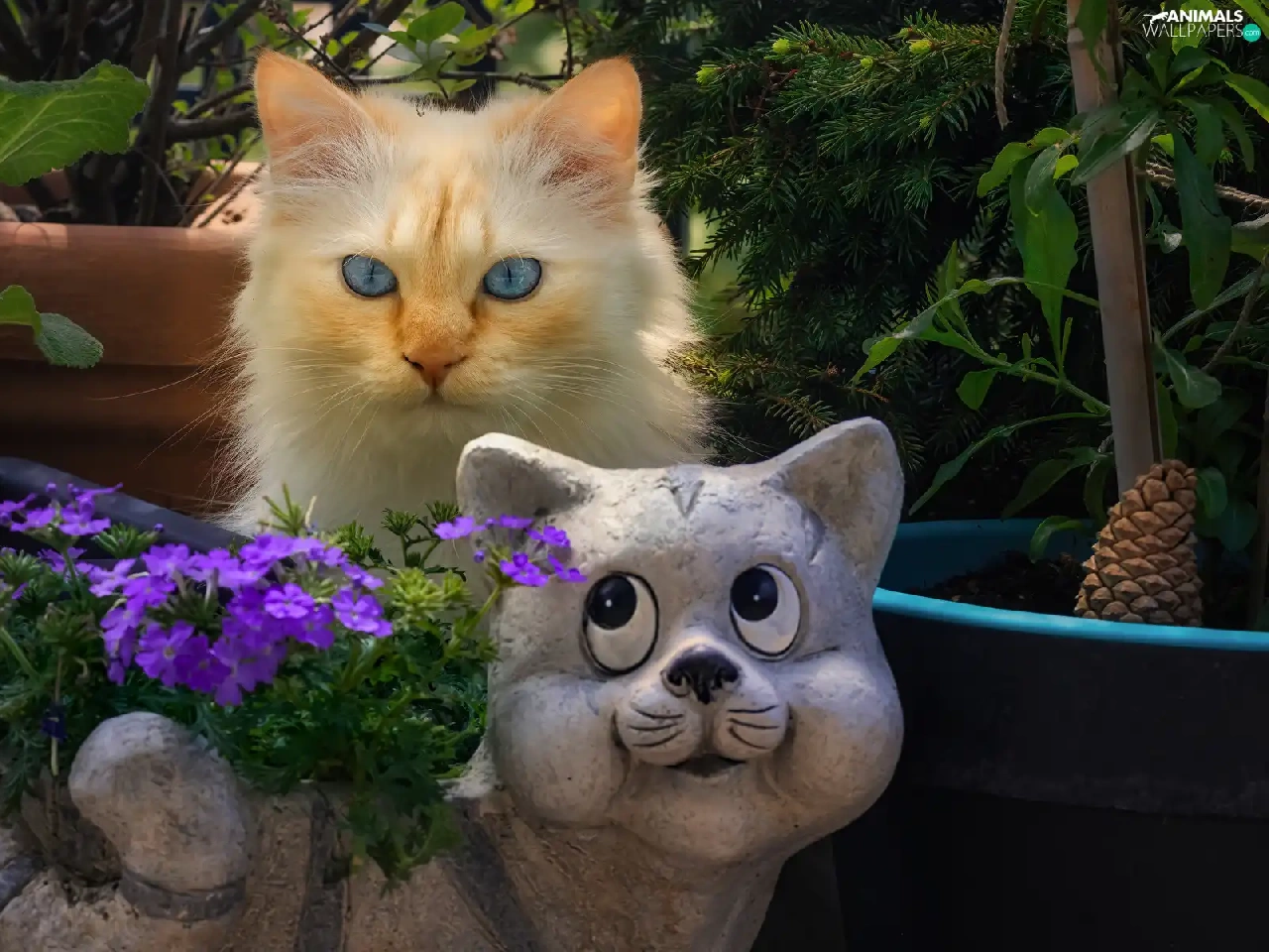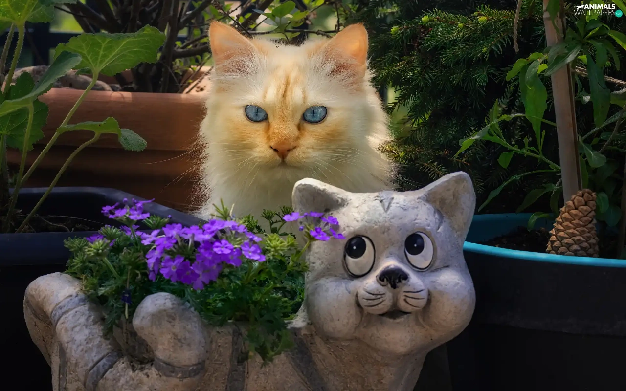 Flowers, cat, Pots