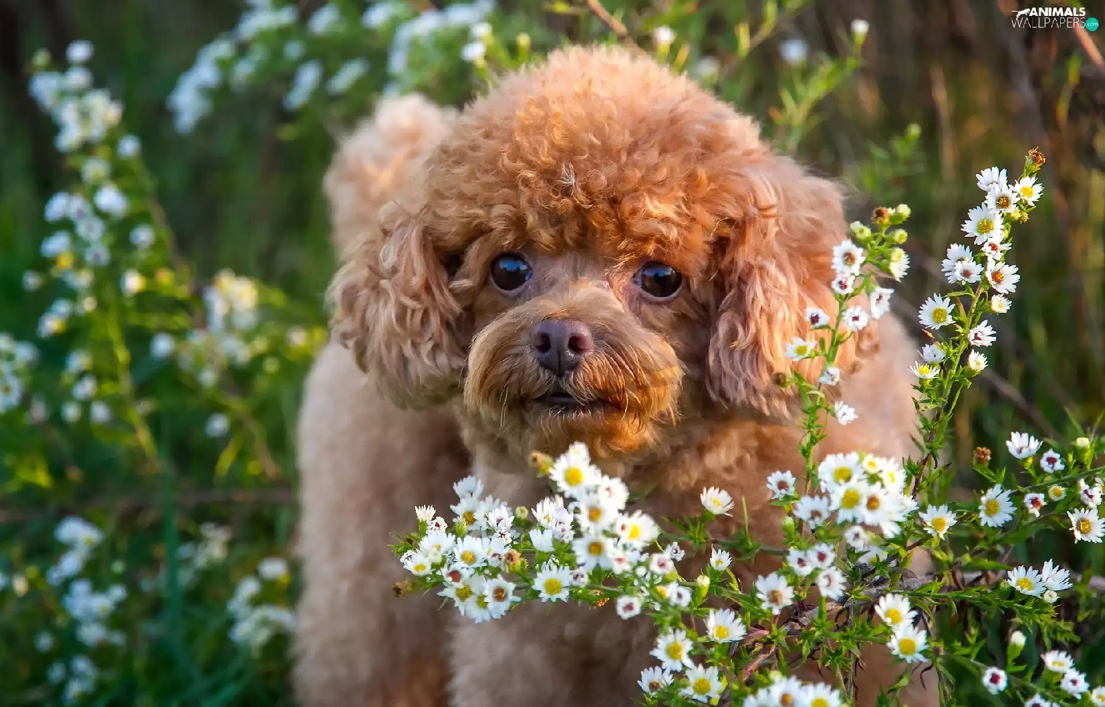 White, flowers, puppie, Meadow, poodle
