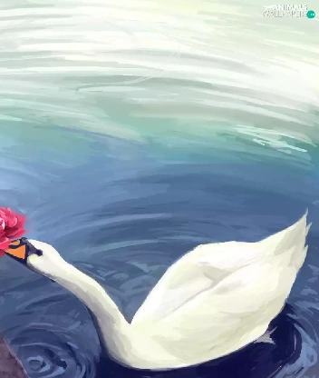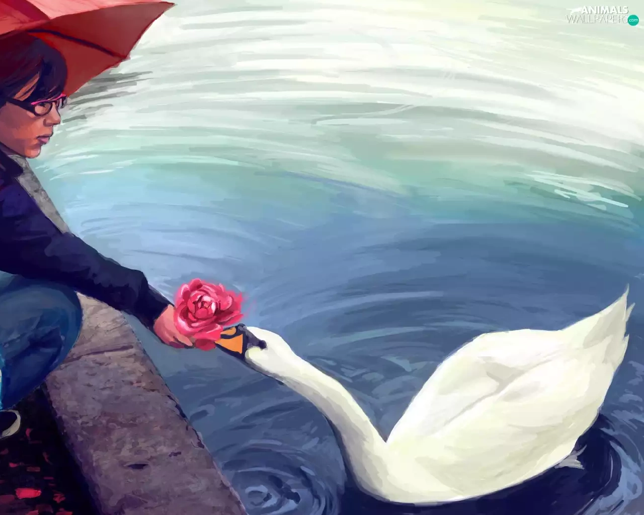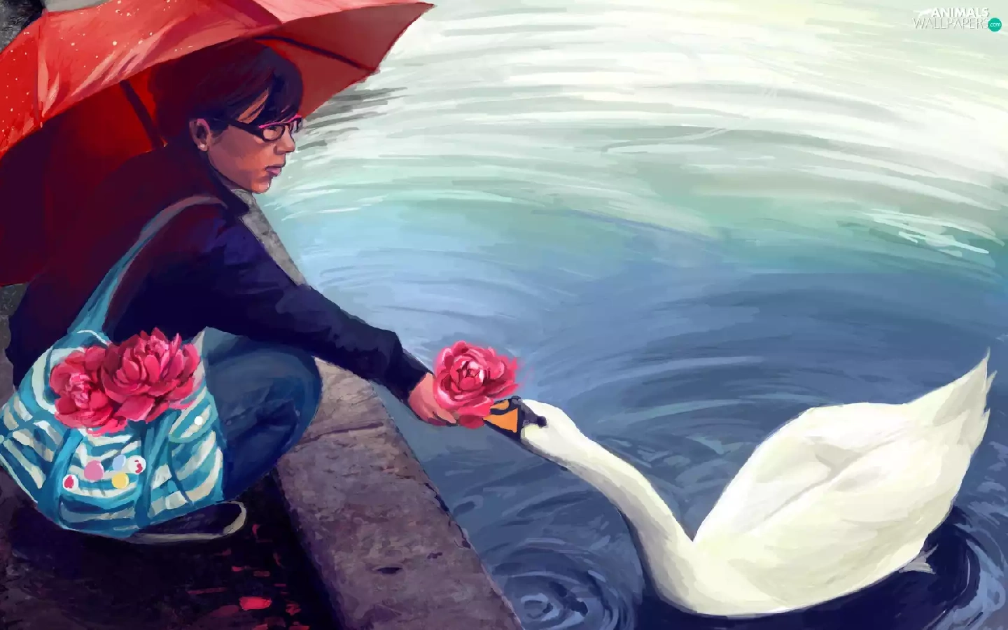 Swans, Flowers, Red, Umbrella, girl