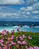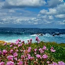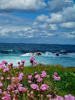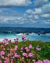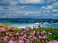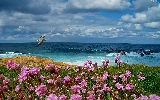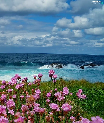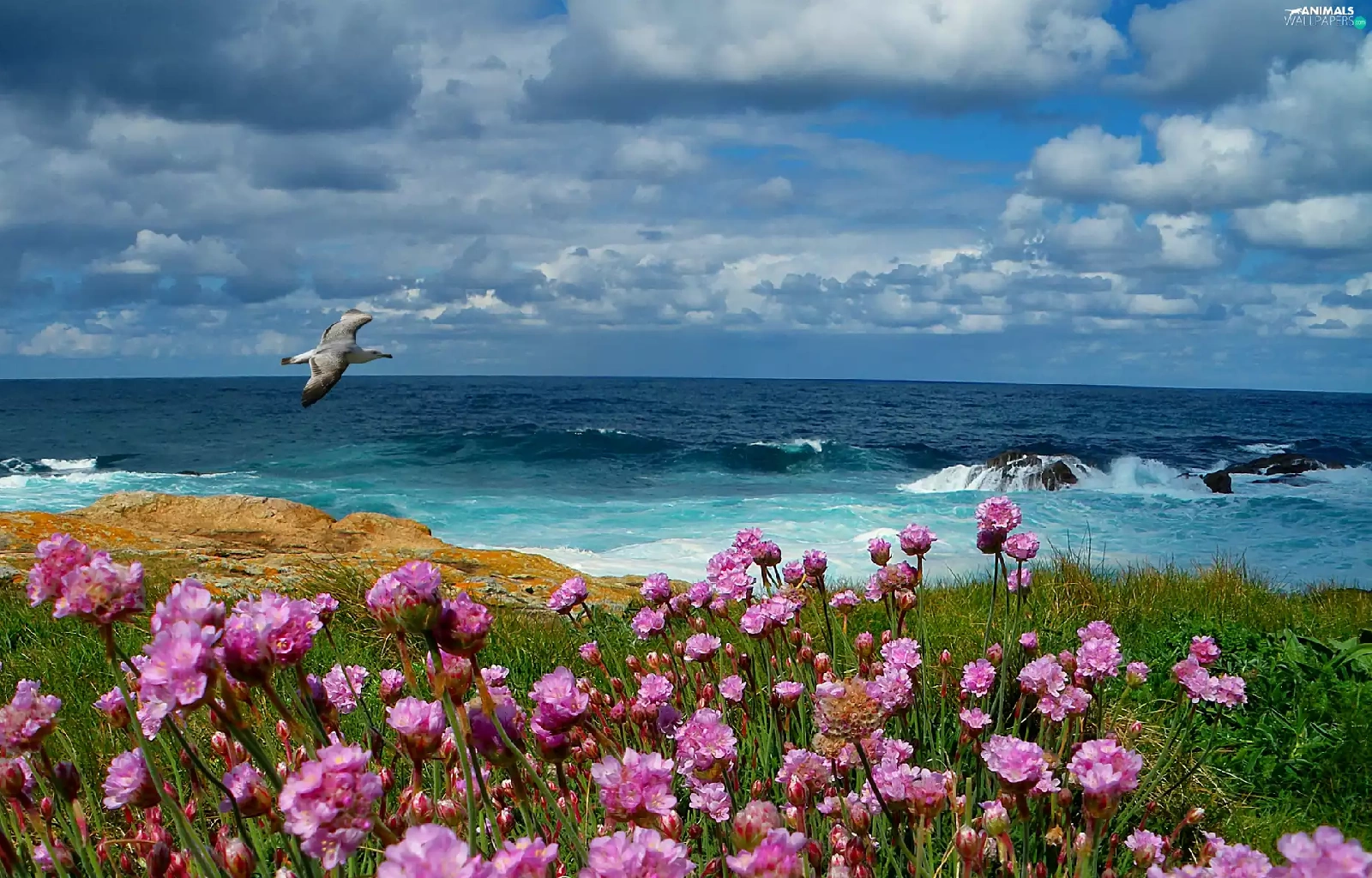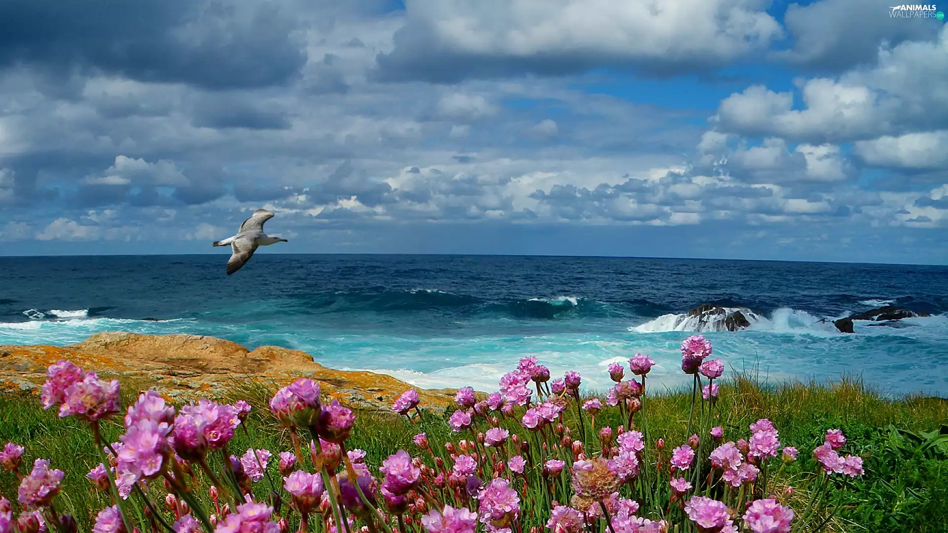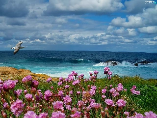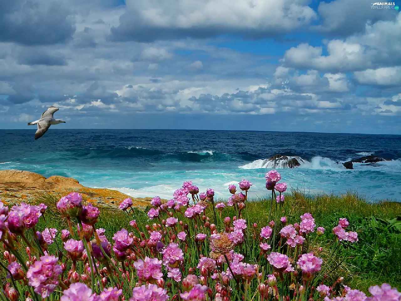 Waves, sea, Meadow, Flowers, Bird, rocks