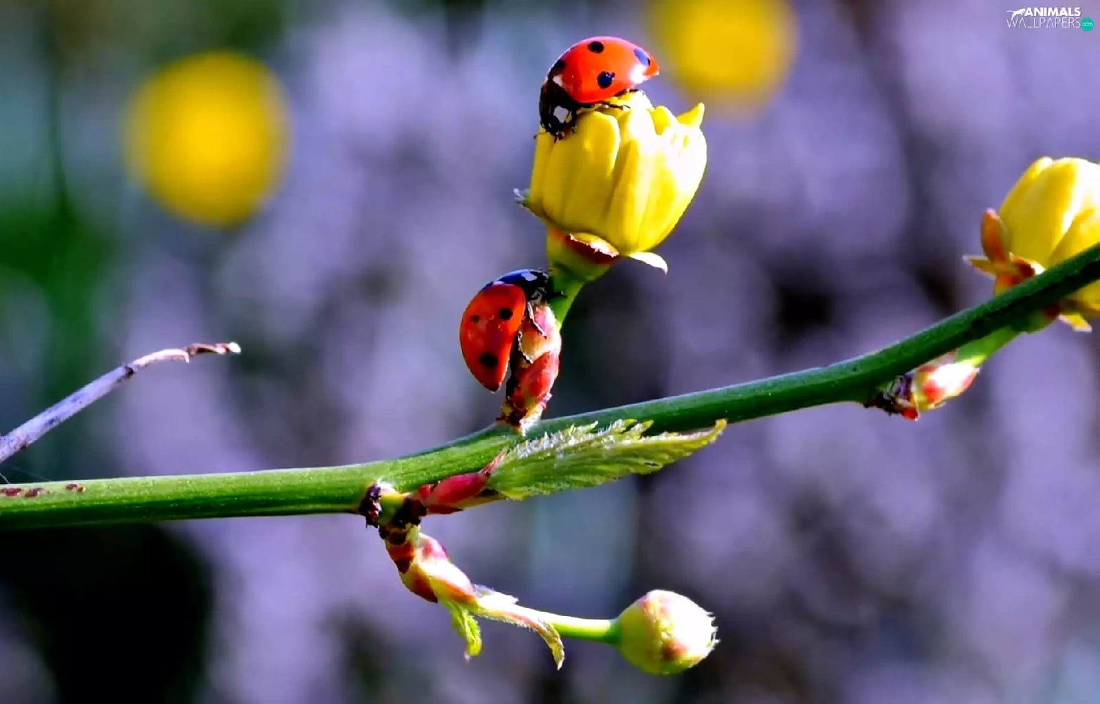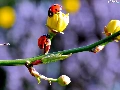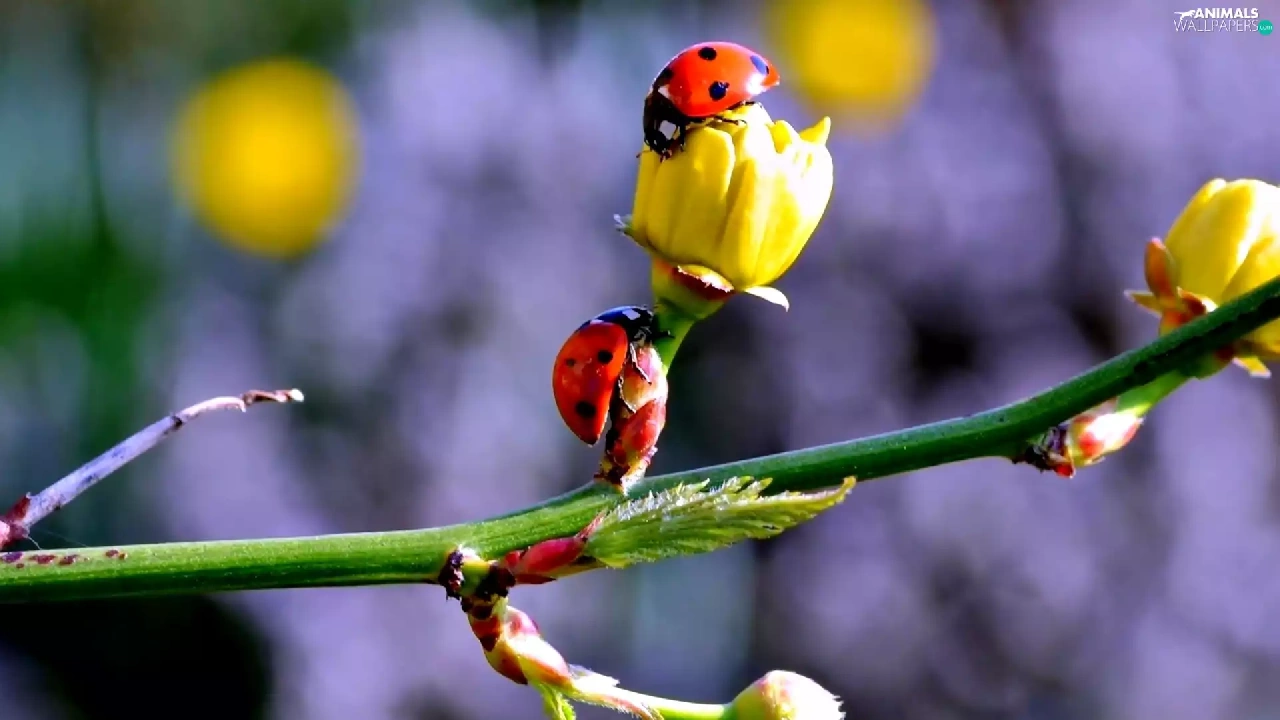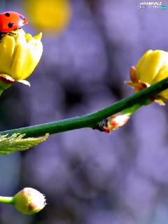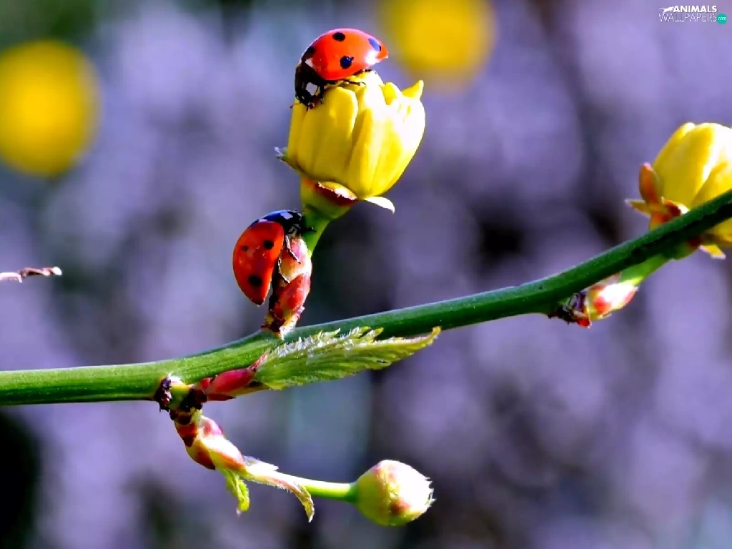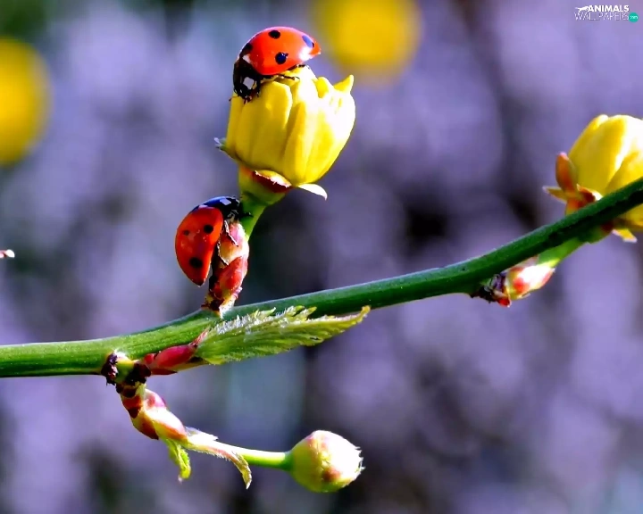twig, ladybugs, Spring, Flowers