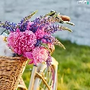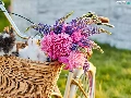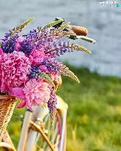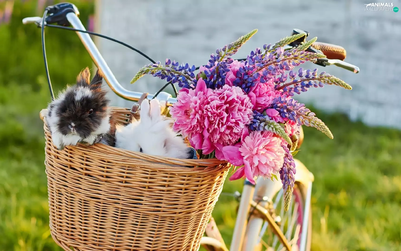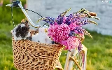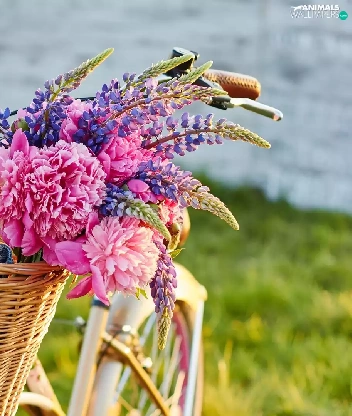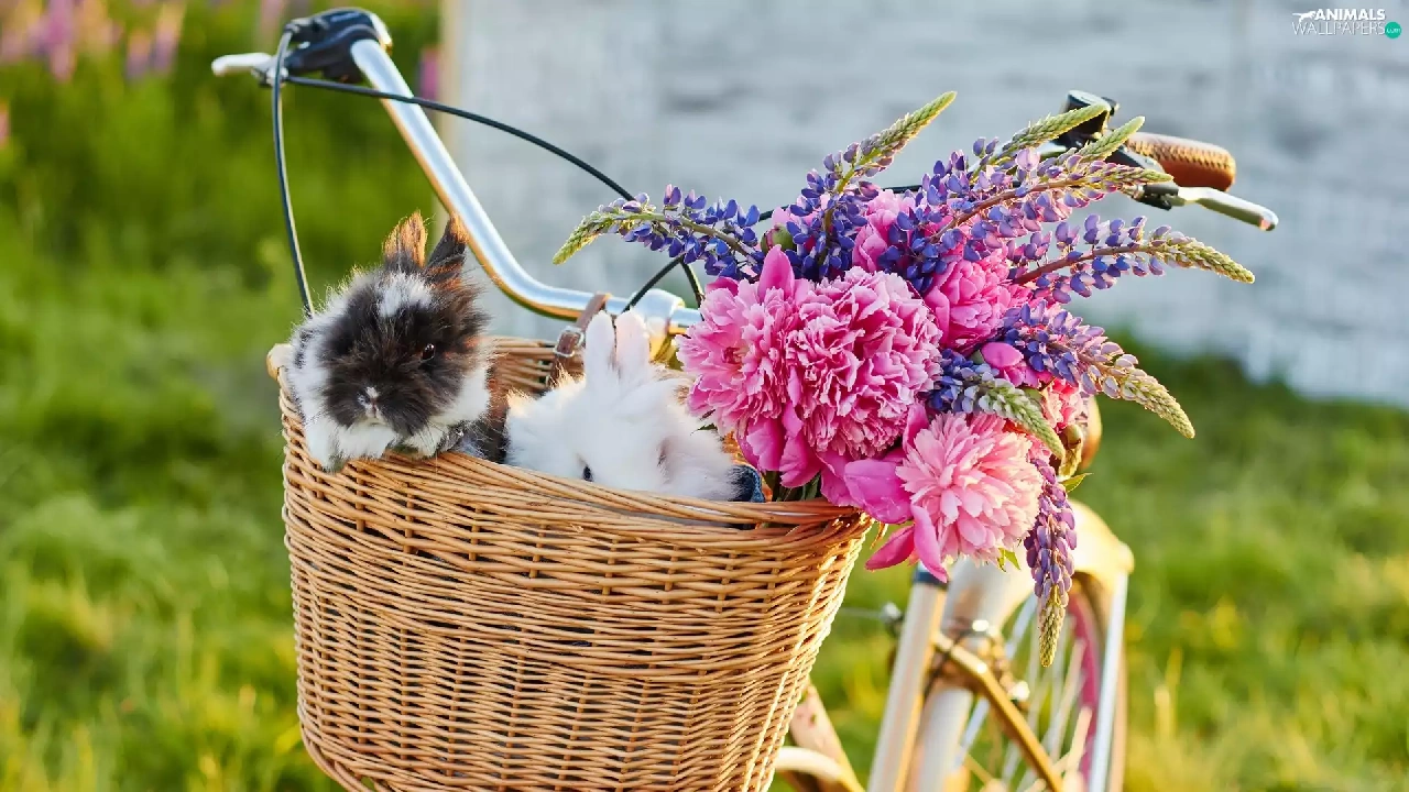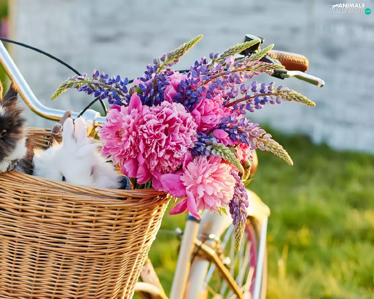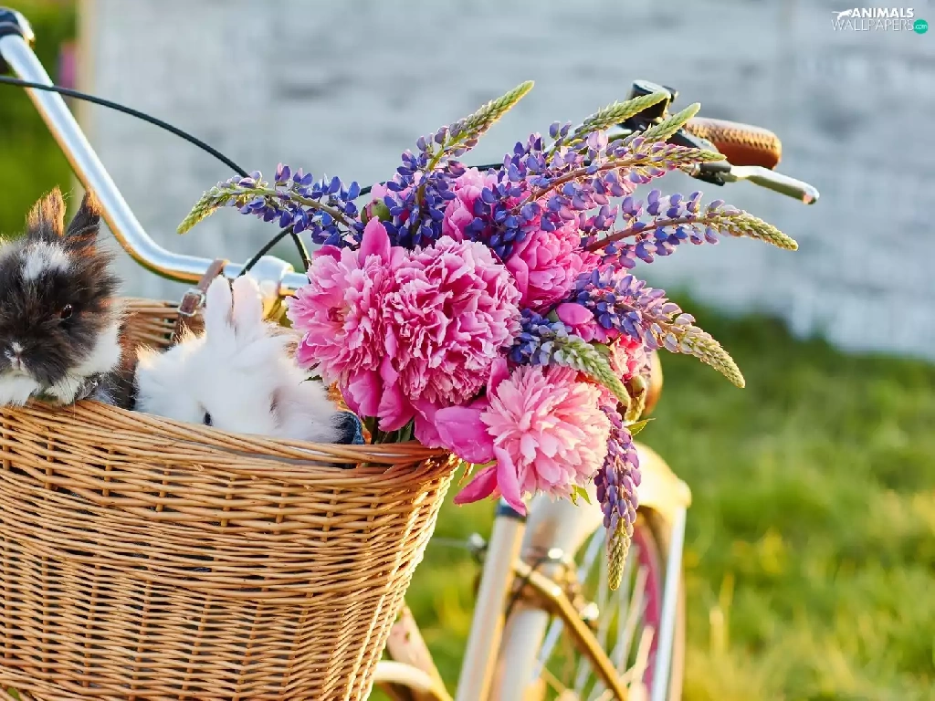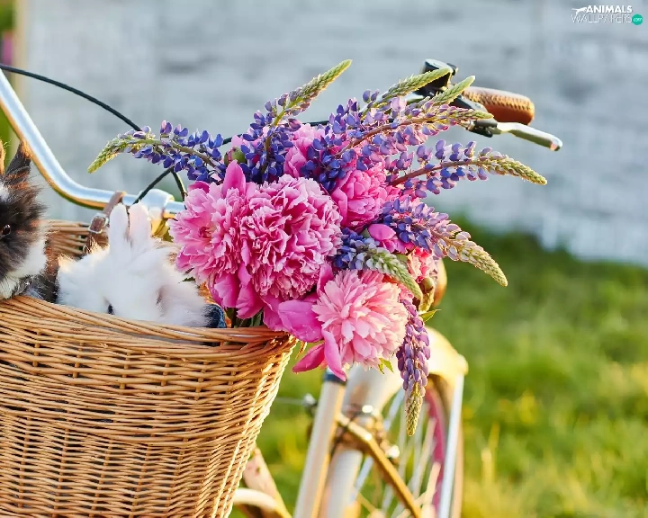 Flowers, lupine, Bike, Peonies, basket, Rabbits, Two cars, wicker